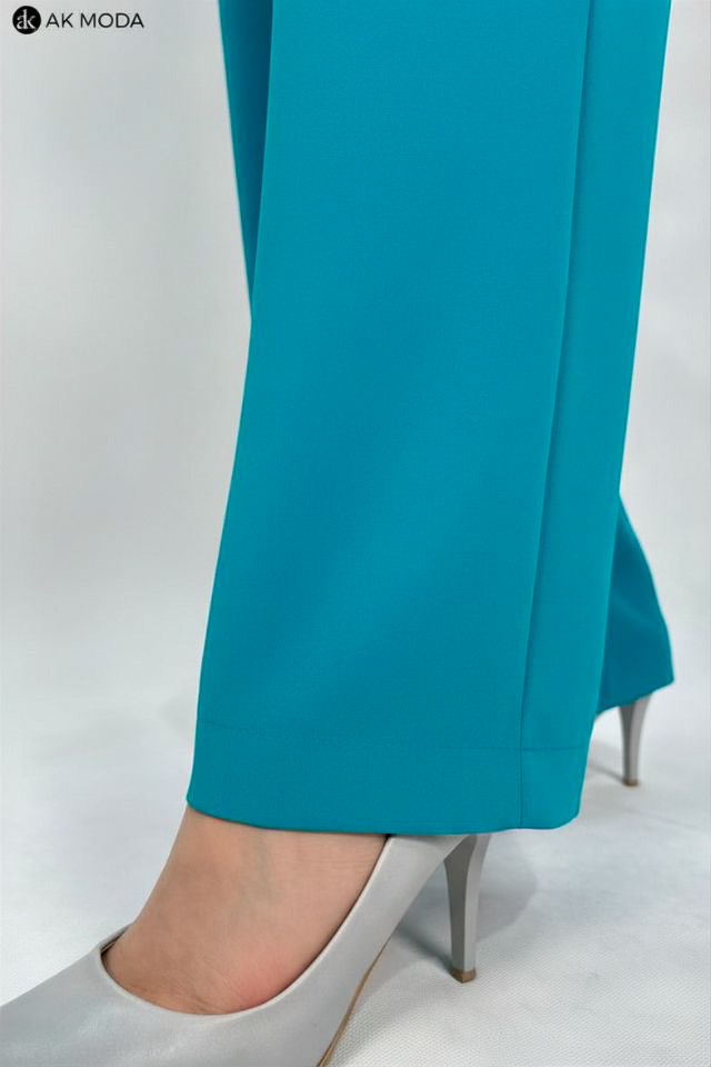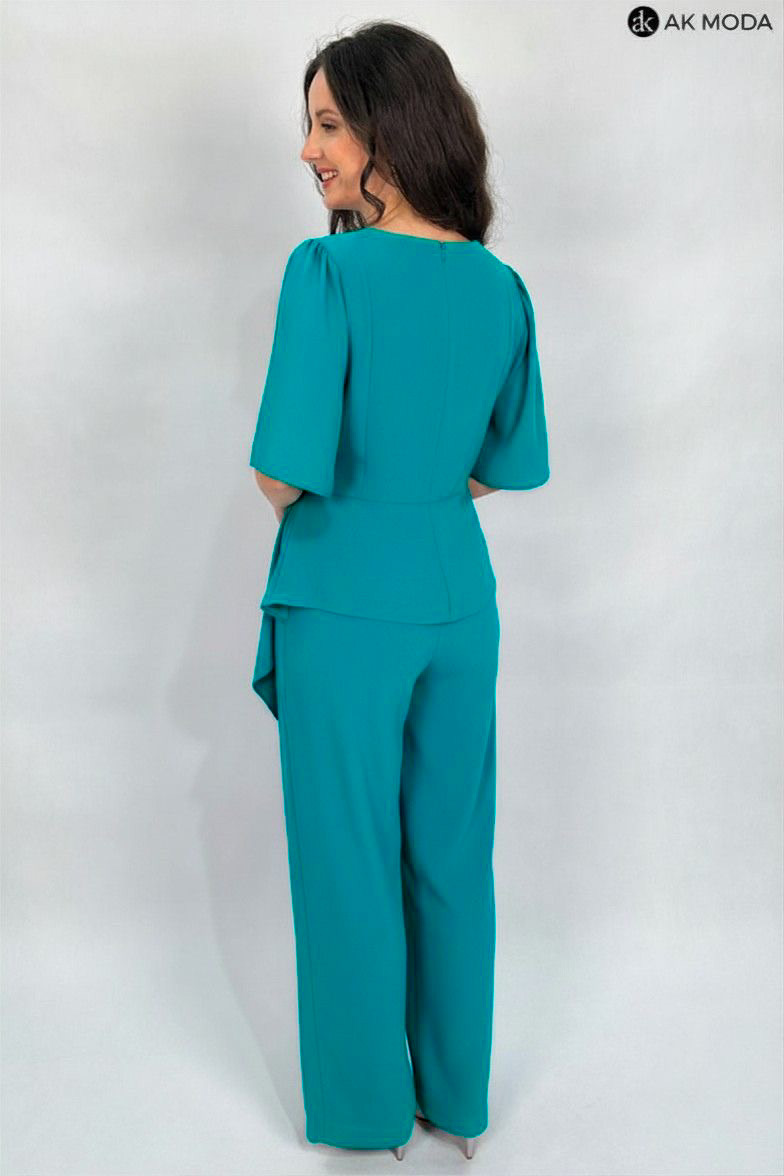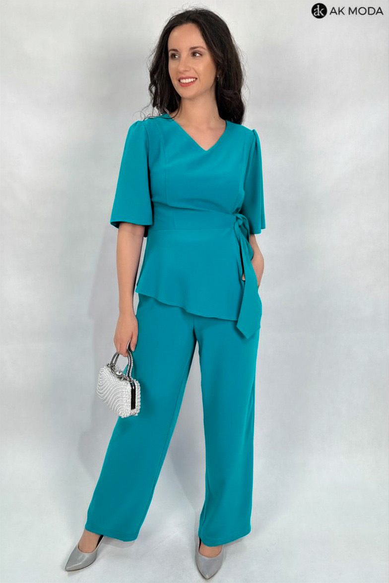 Elegancki komplet damski w kolorze szmaragdowym. W skład zestawu wchodzi dłuższa bluzka z dekoltem w szpic i wiązaniem w talii oraz spodnie z szerszymi nogawkami i gumką w pasie. Spodnie posiadają kieszenie.