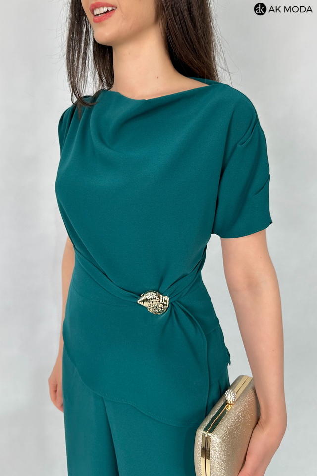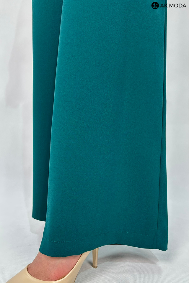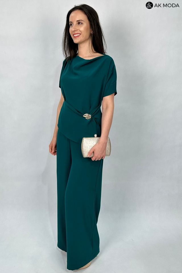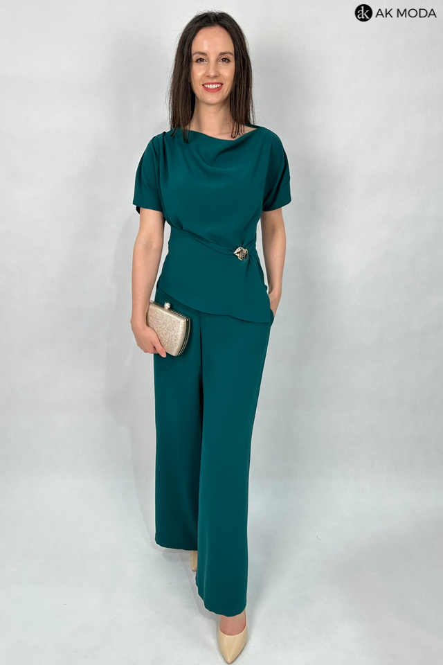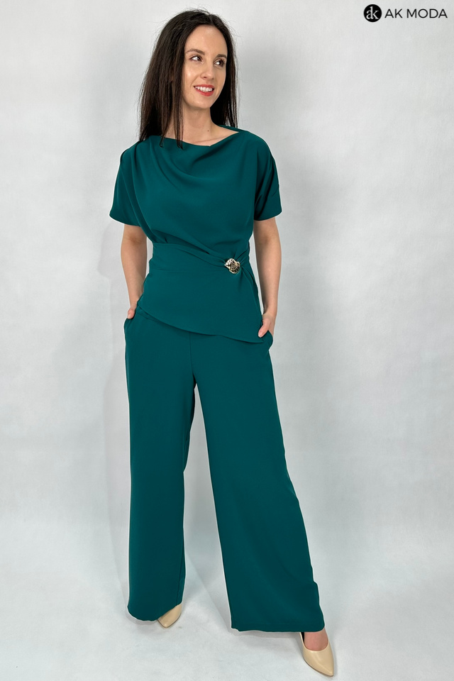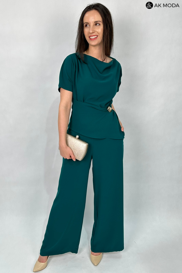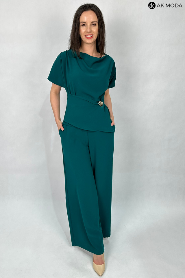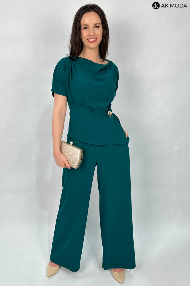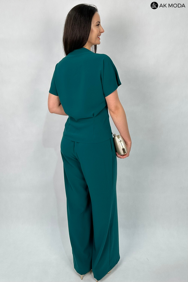 Elegancki komplet damski w kolorze butelkowej zieleni. W skład zestawu wchodzi bluzka z krótkimi kimonowymi rękawami i dekoltem typu "woda" oraz spodnie z szerszymi nogawkami i gumką w pasie. Spodnie posiadają kieszenie.