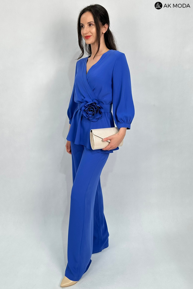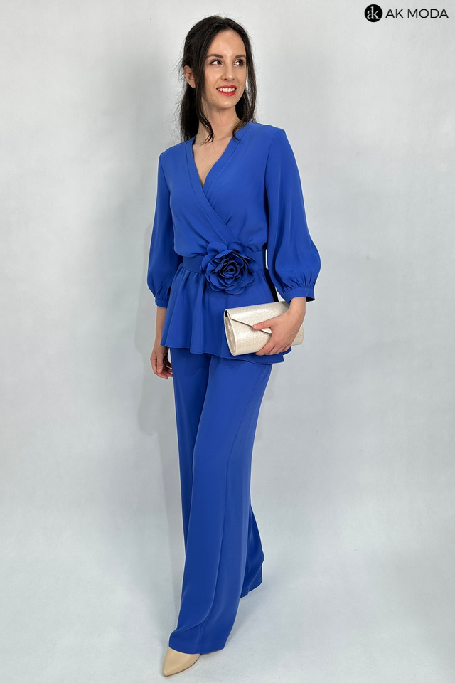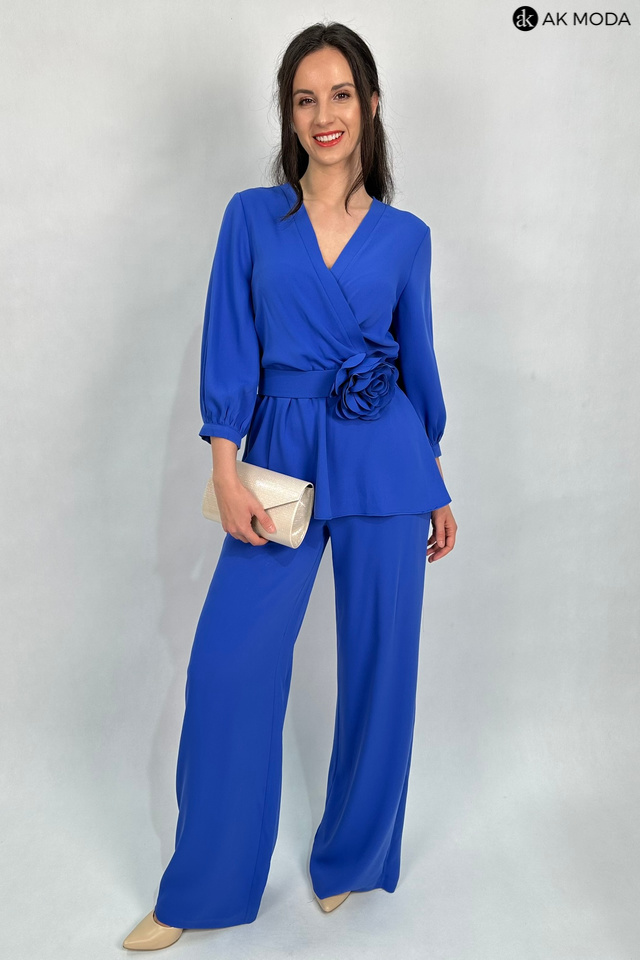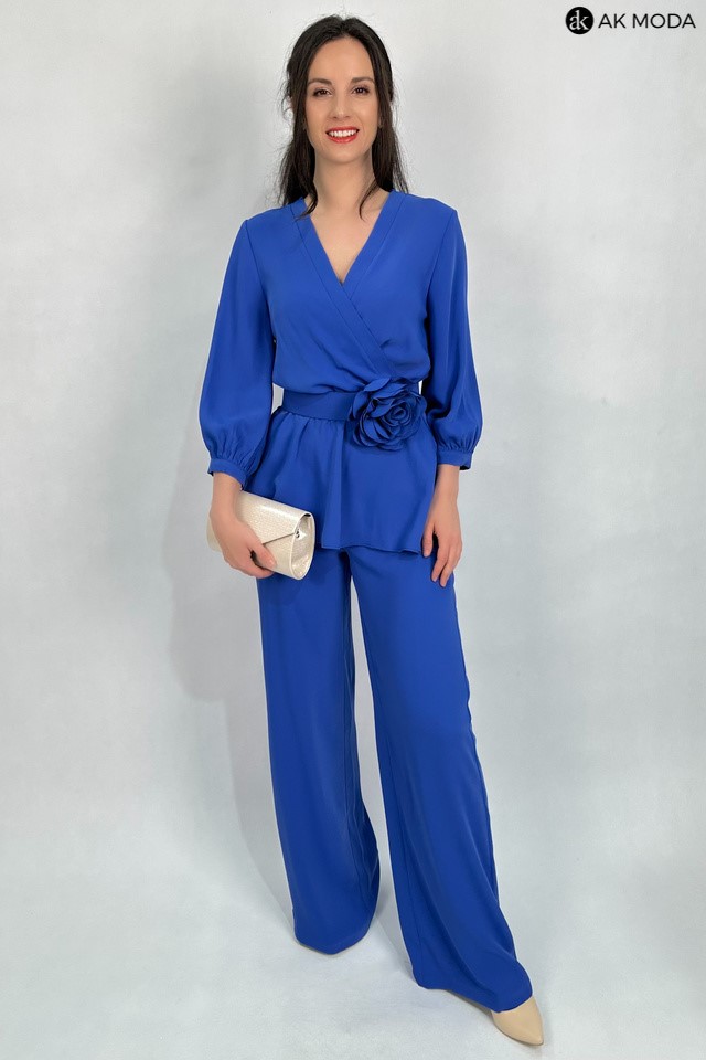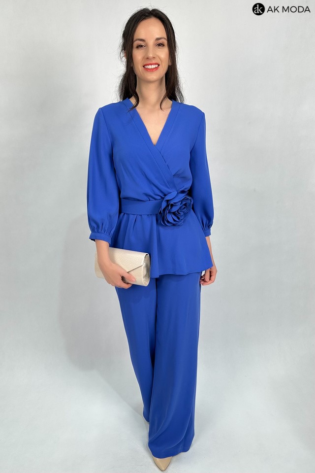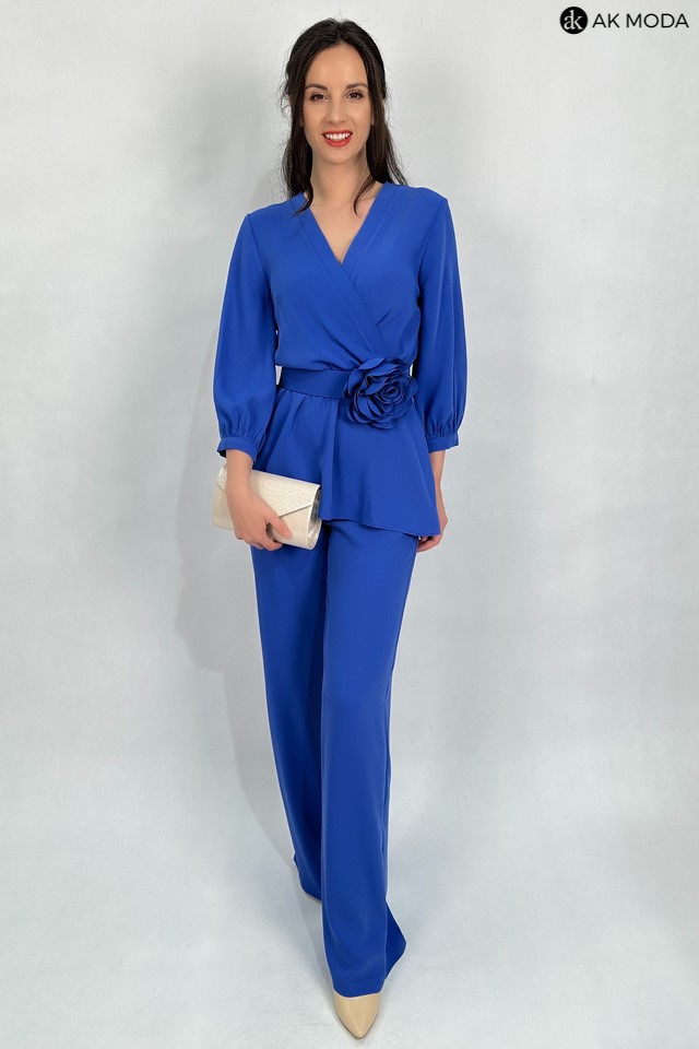 Elegancki komplet damski w kolorze niebieskim. W skład zestawu wchodzi bluzka z rękawami 3/4 i kopertowym dekoltem ( dopasowuje się do biustu ) oraz spodnie z prostymi nogawkami. Spodnie posiadają kieszenie, oraz gumkę w pasie. W zestawie pasek z ozdobnym kwiatkiem.