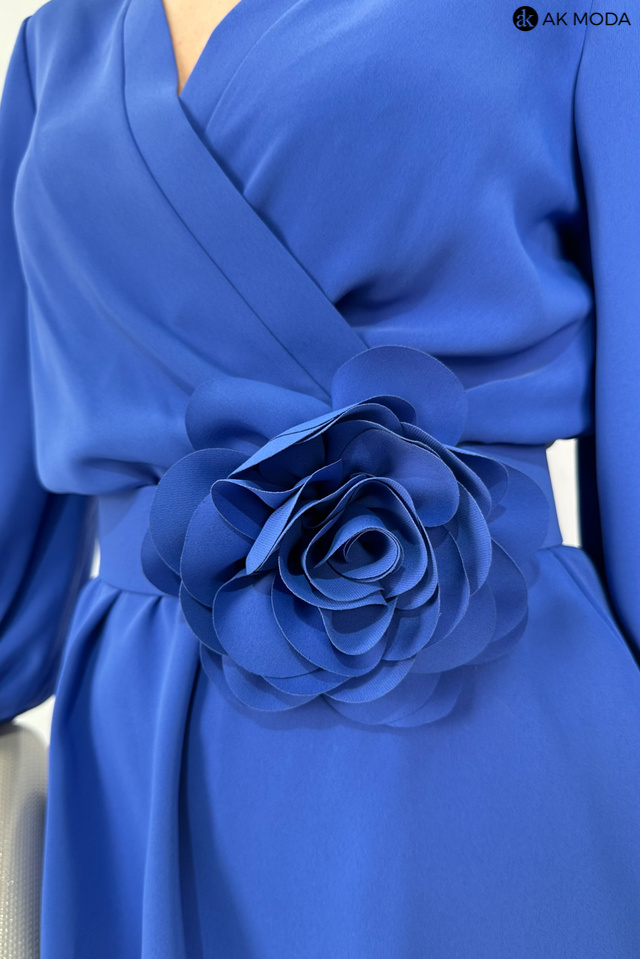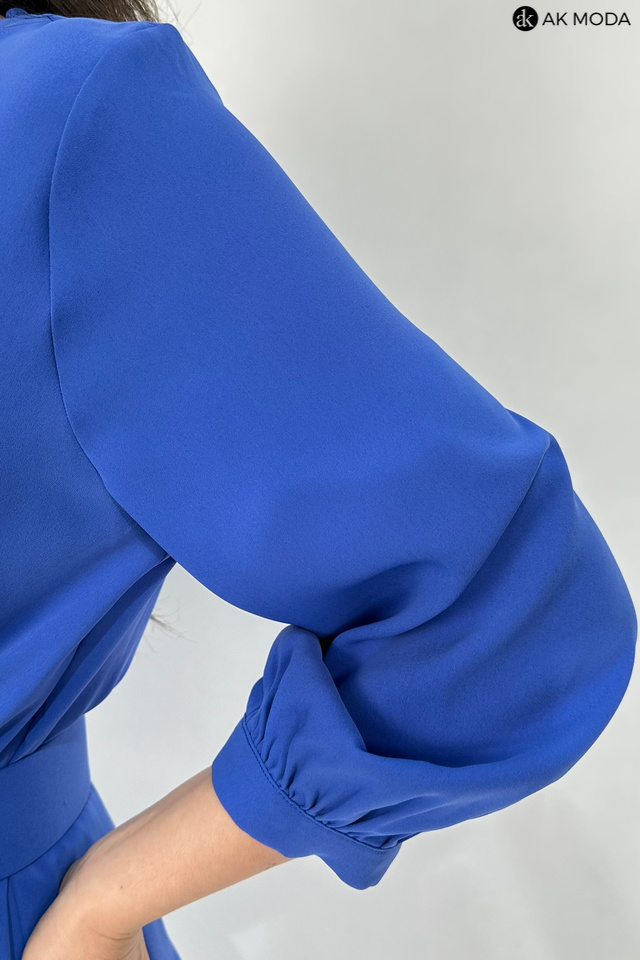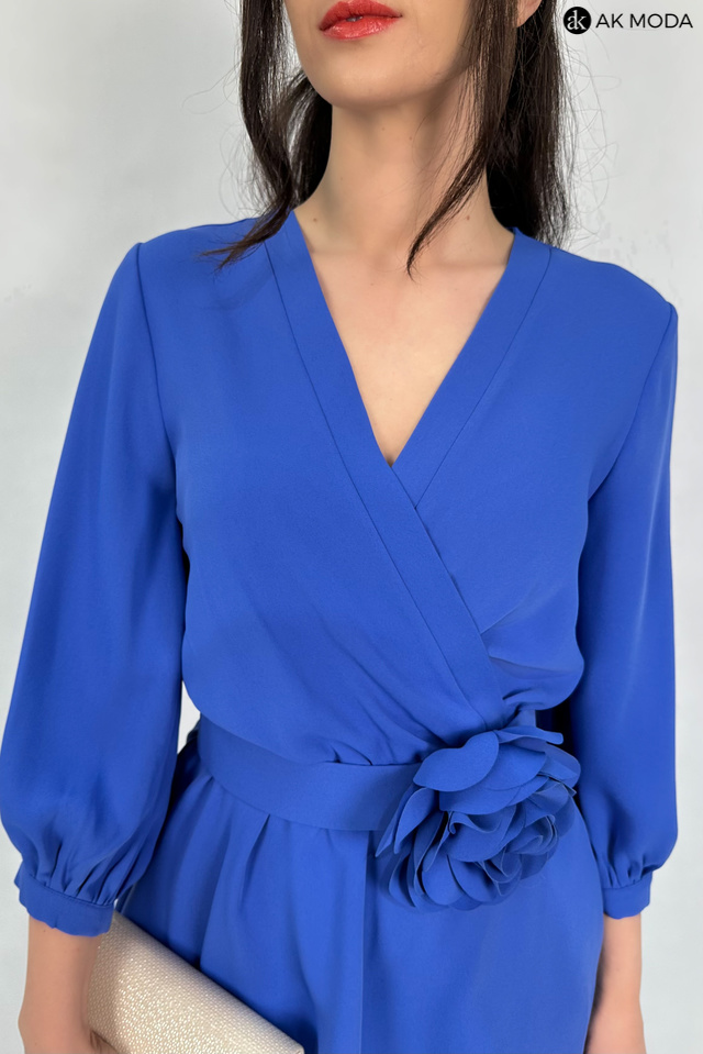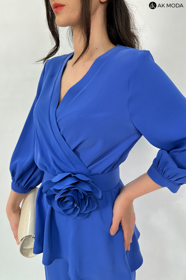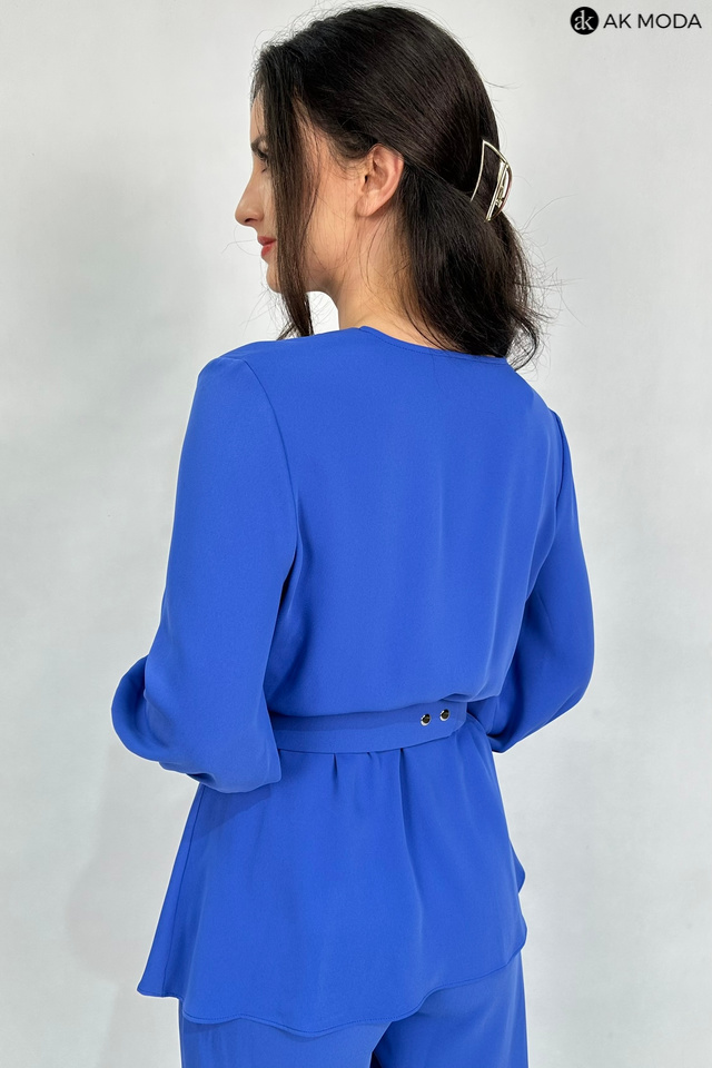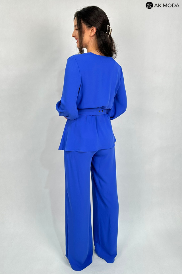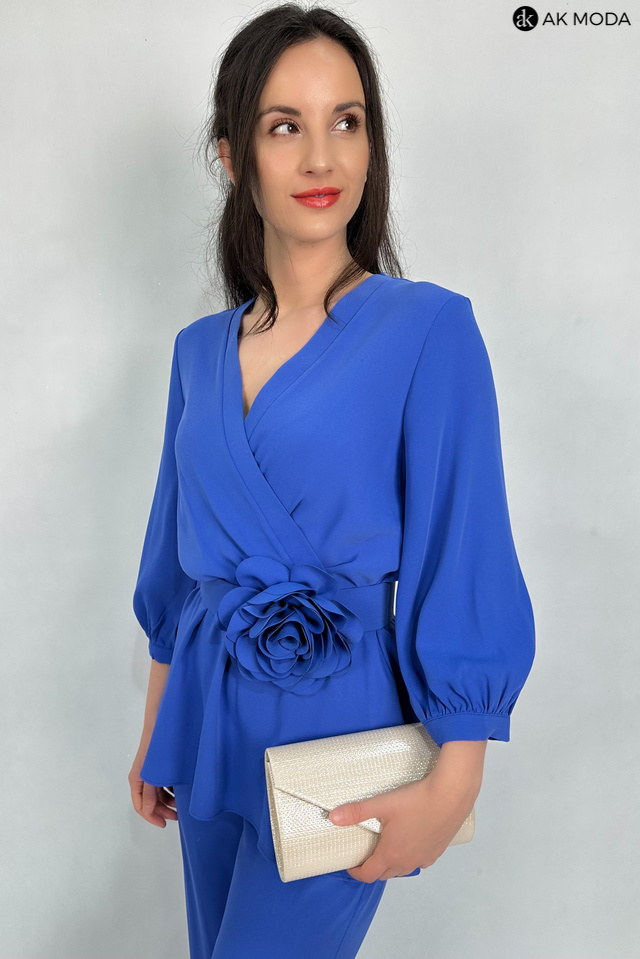 Elegancki komplet damski w kolorze niebieskim. W skład zestawu wchodzi bluzka z rękawami 3/4 i kopertowym dekoltem ( dopasowuje się do biustu ) oraz spodnie z prostymi nogawkami. Spodnie posiadają kieszenie, oraz gumkę w pasie. W zestawie pasek z ozdobnym kwiatkiem.