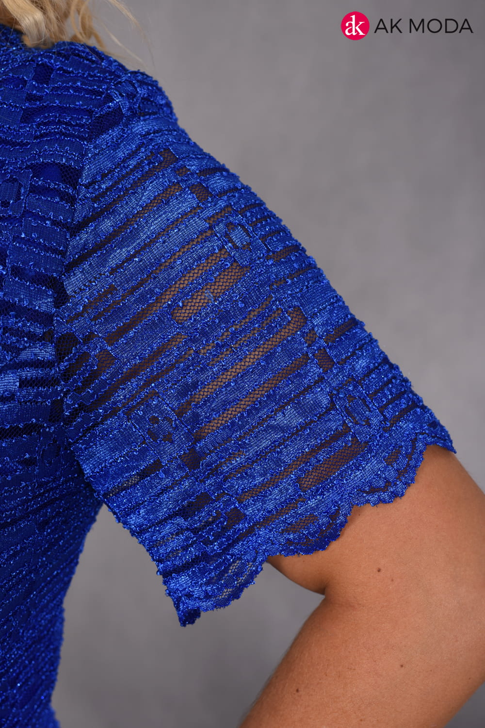 Chabrowy komplet damski składający się z prostej sukienki z koronki oraz żakietu z rękawem 3/4.