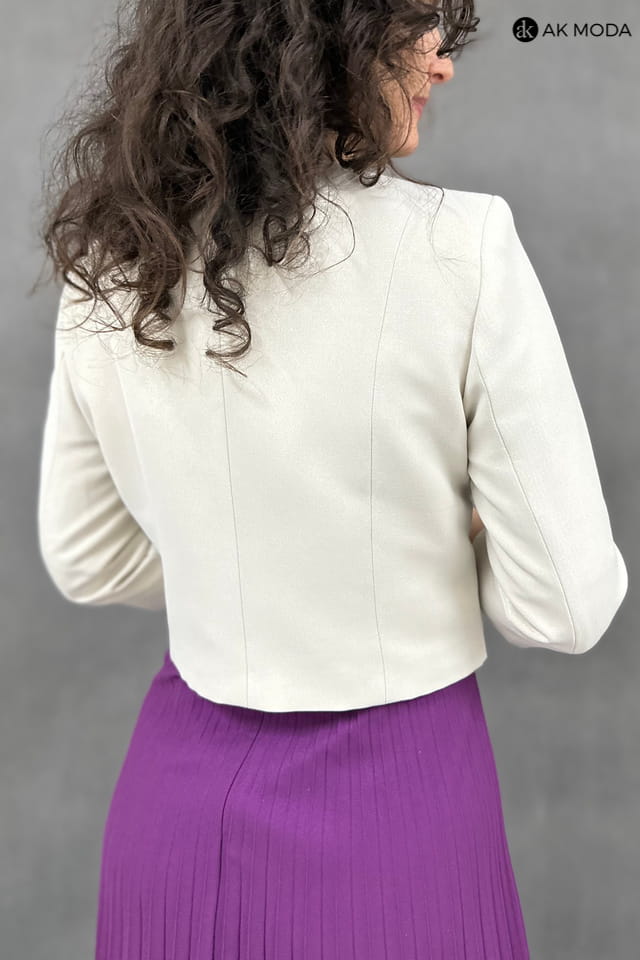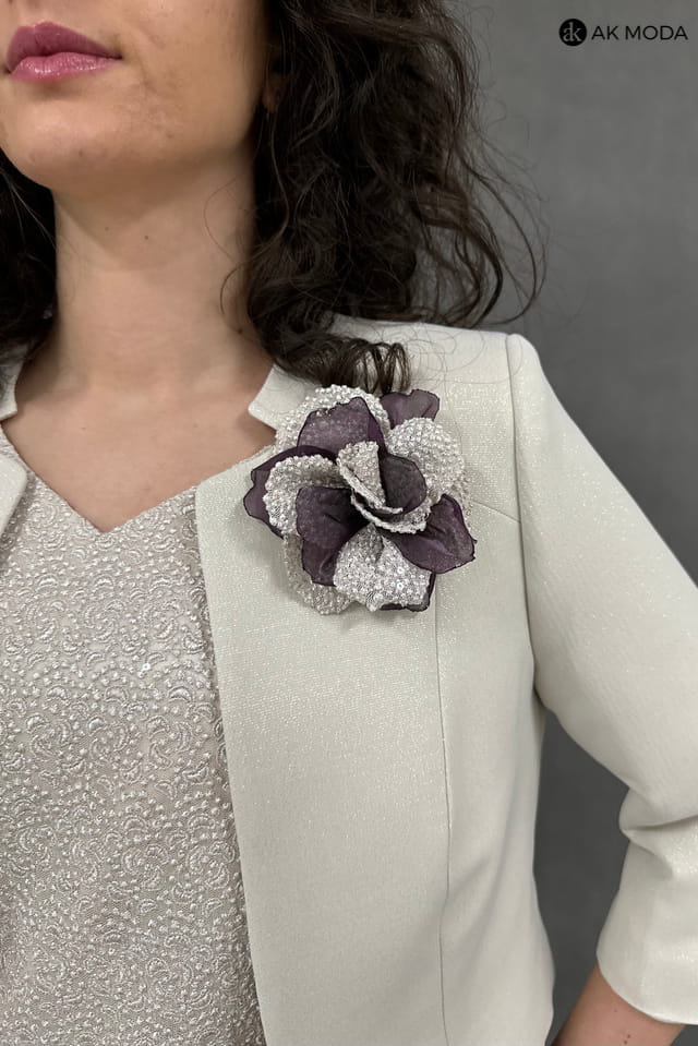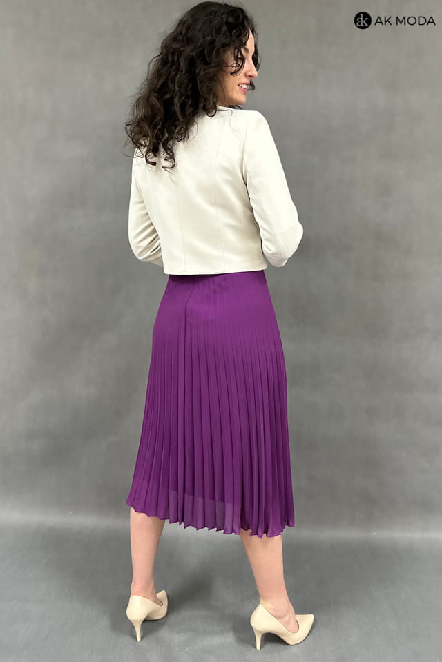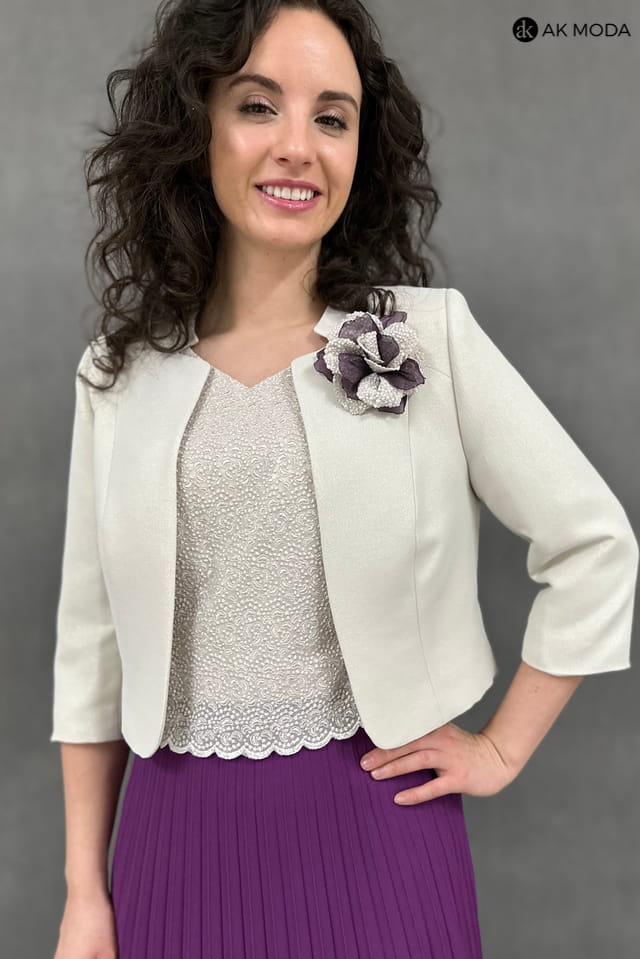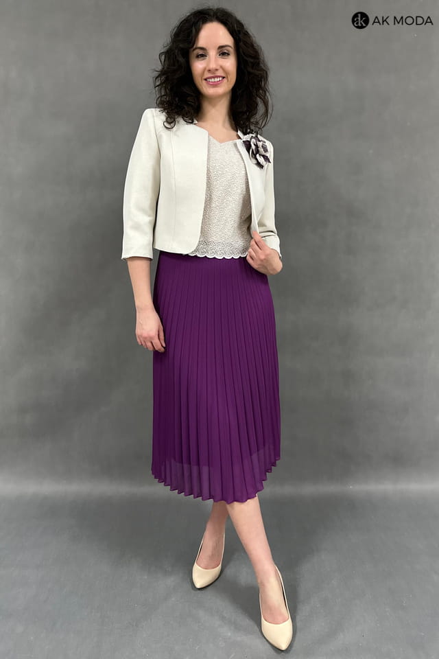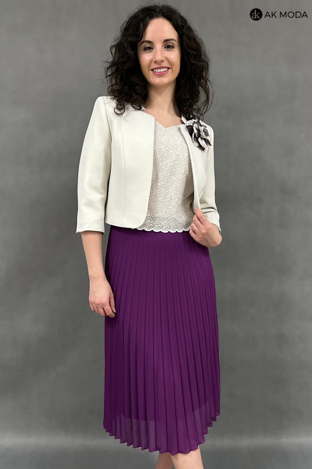 Beżowo - fioletowy komplet damski z żakietem. Sukienka z krótkim rękawem - góra koronkowa, dół plisowany. Żakiet z rękawem 3/4.