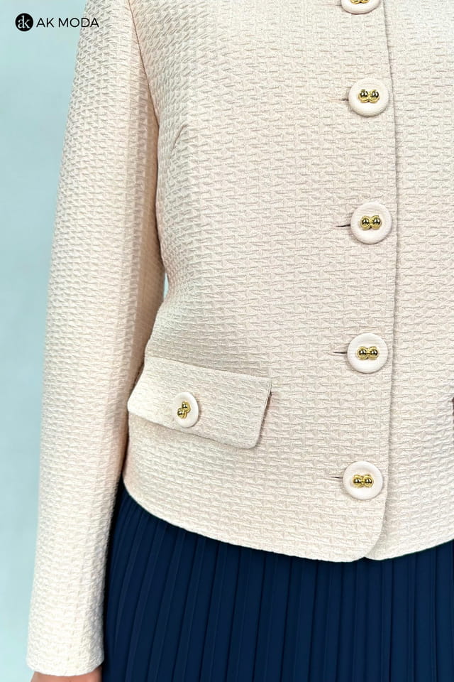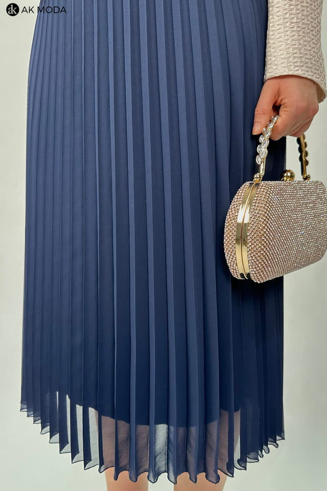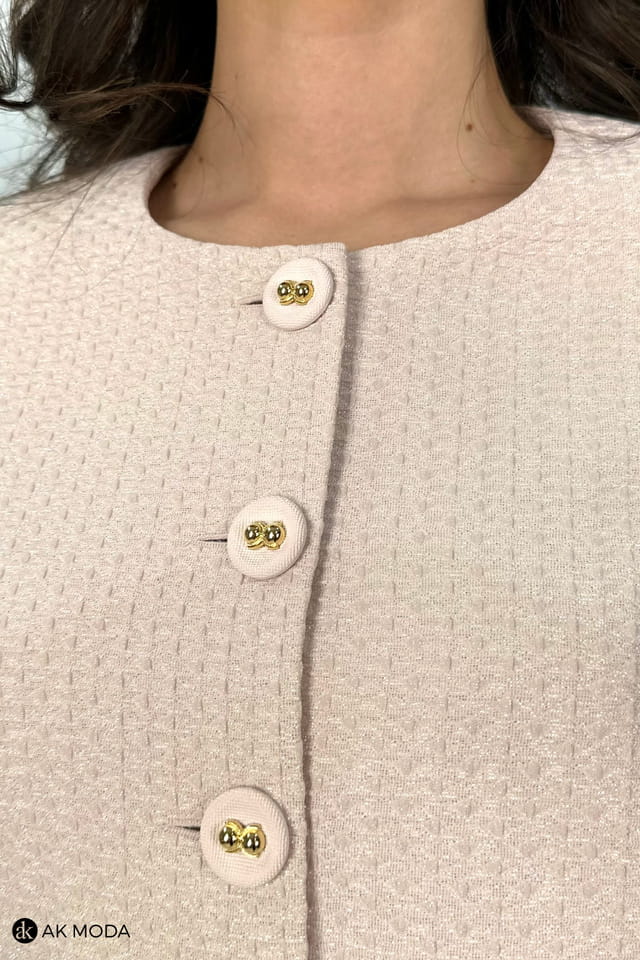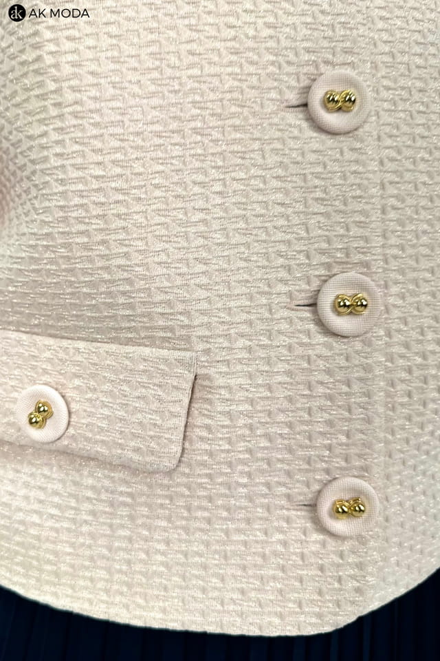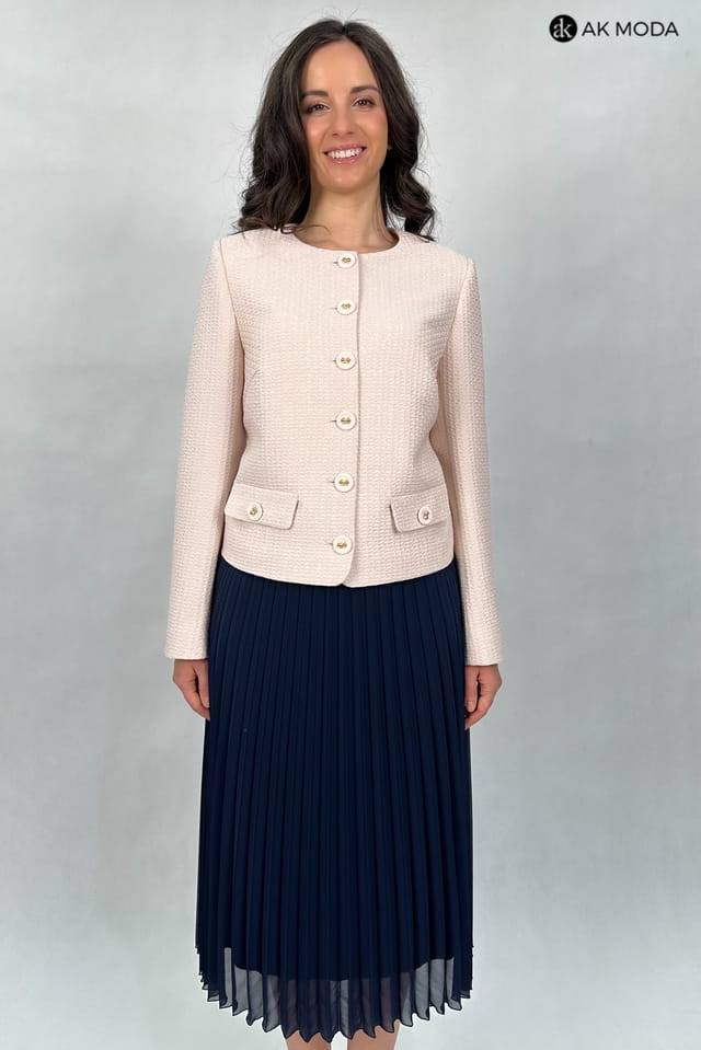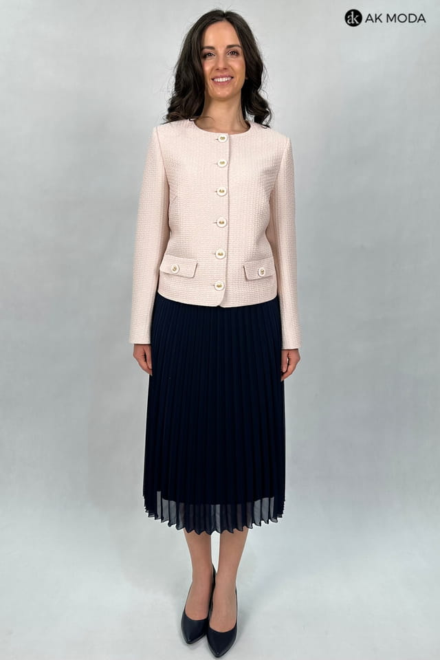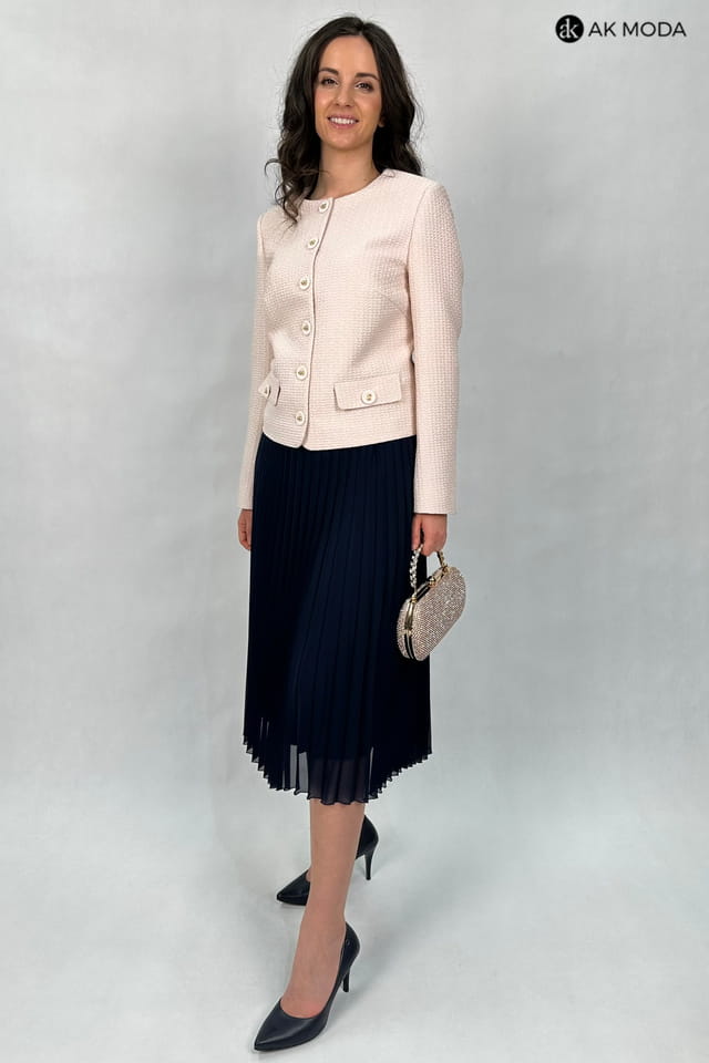 Elegancki komplet damski składający się z rozkloszowanej spódnicy oraz żakietu typu chanelka. Spódnica na gumce, plisowana, w kolorze granatowym, żakiet uszyty z wytłaczanego materiału w kolorze pudrowego rózu z delikatnym złotym połyskiem.