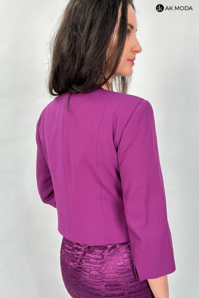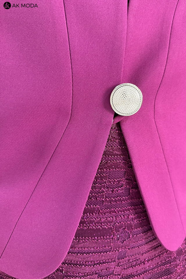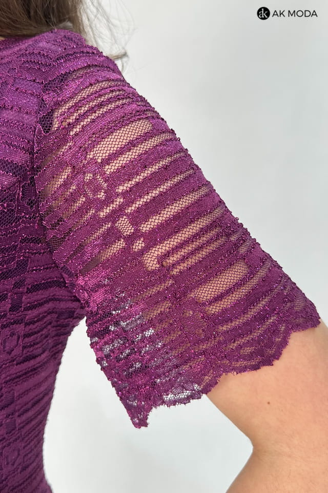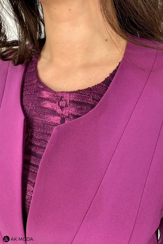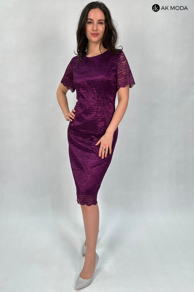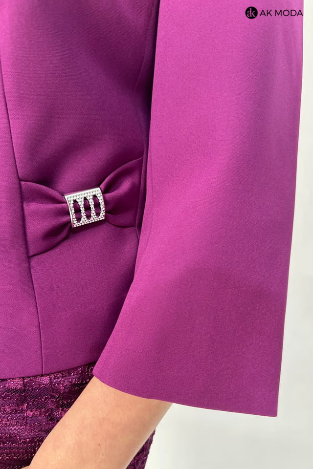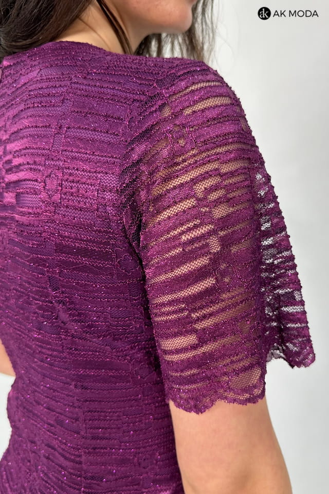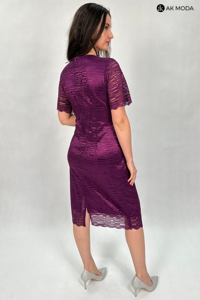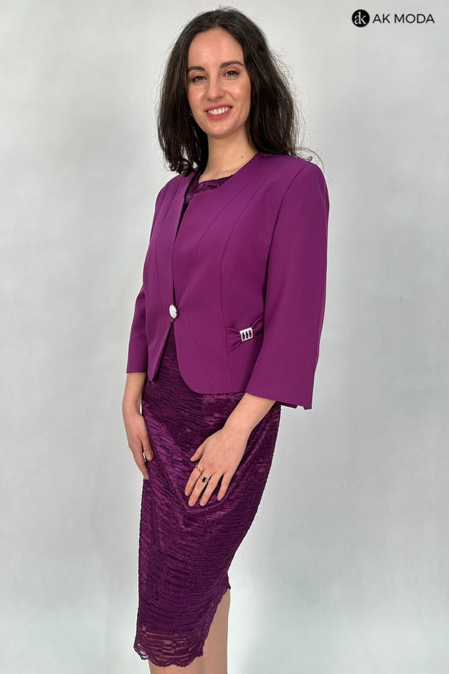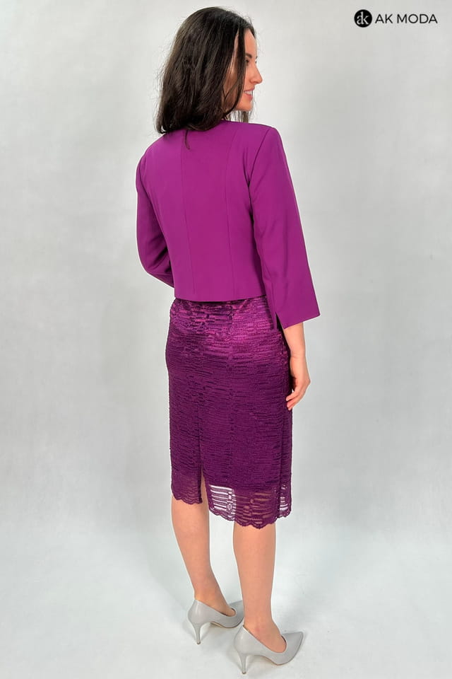 Elegancki komplet damski w kolorze fioletowym, składający się z prostej koronkowej sukienki z brokatowym połyskiem oraz żakietu z rękawami 3/4.