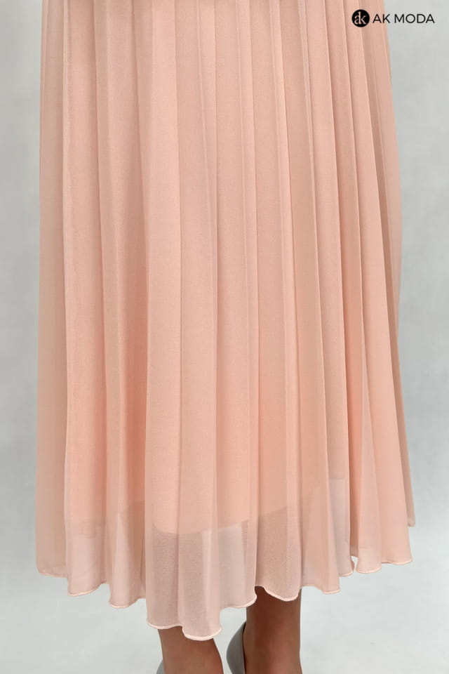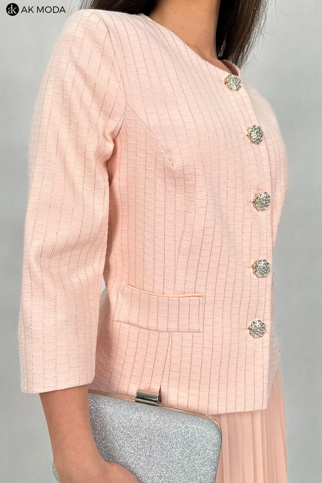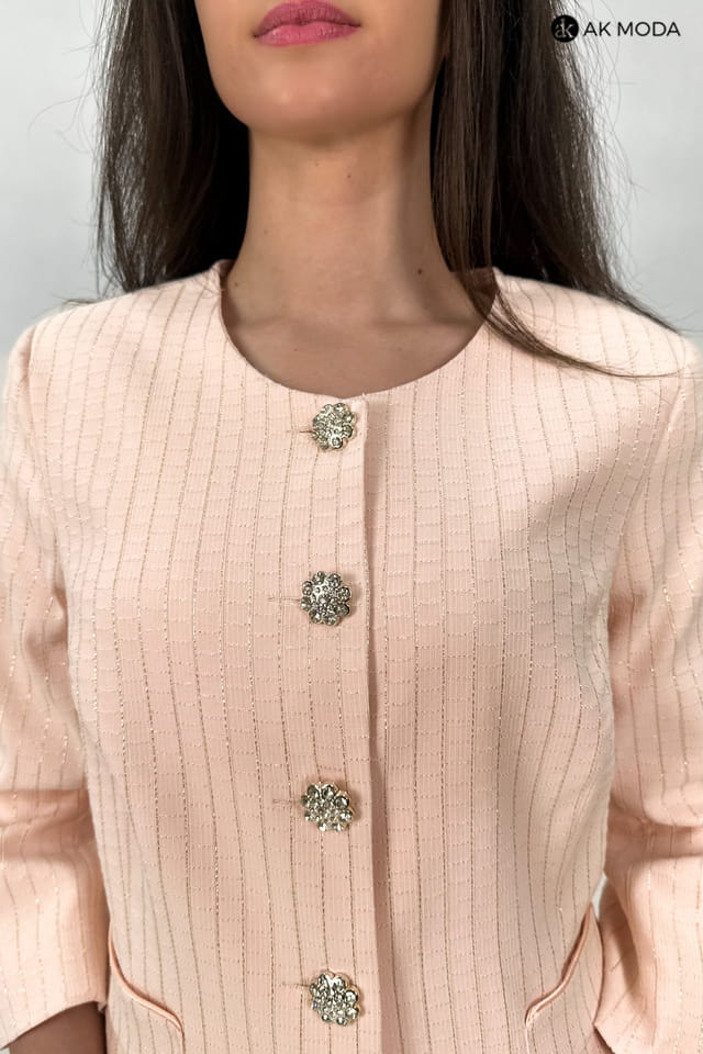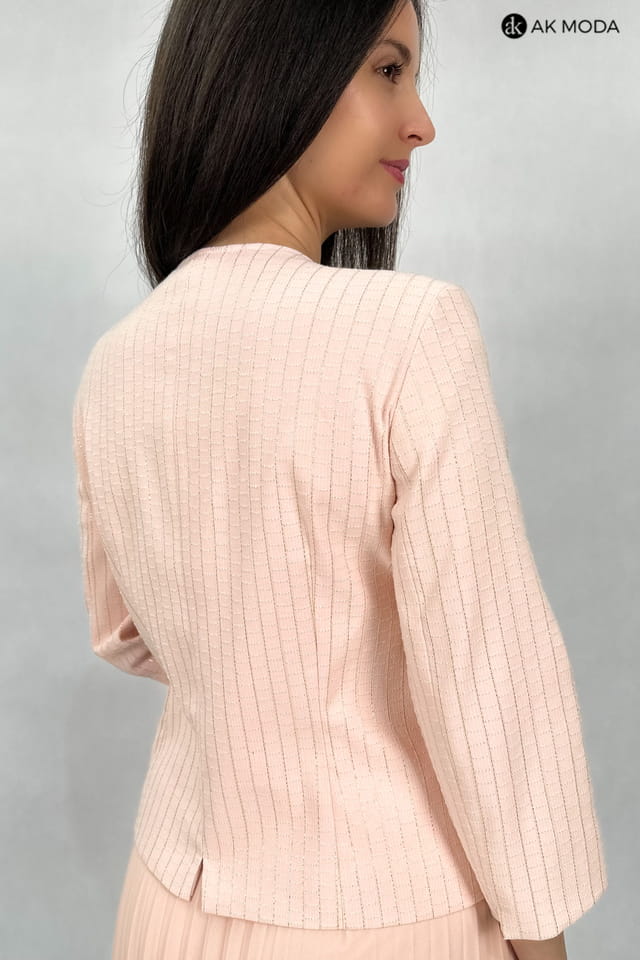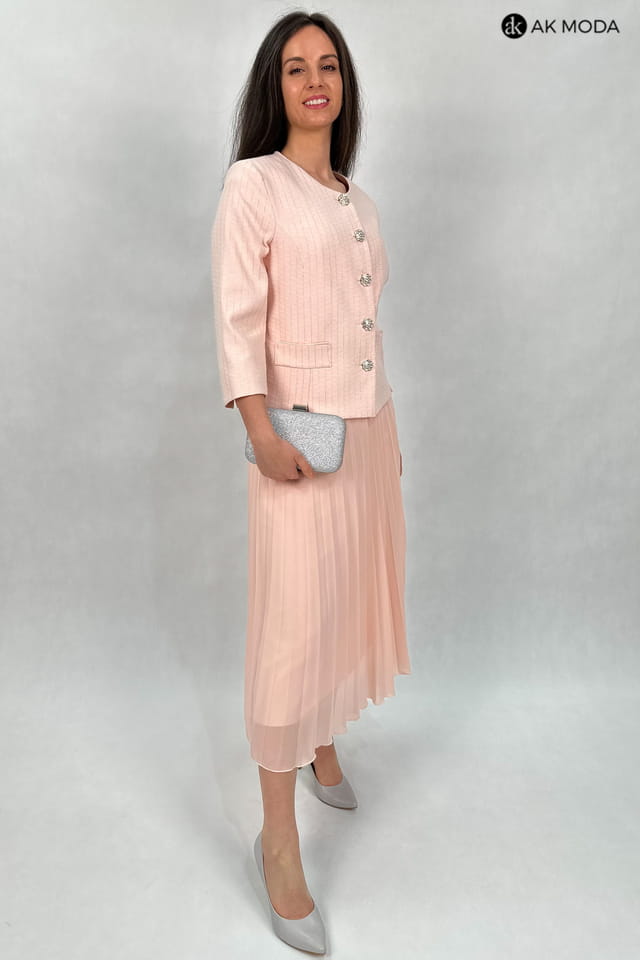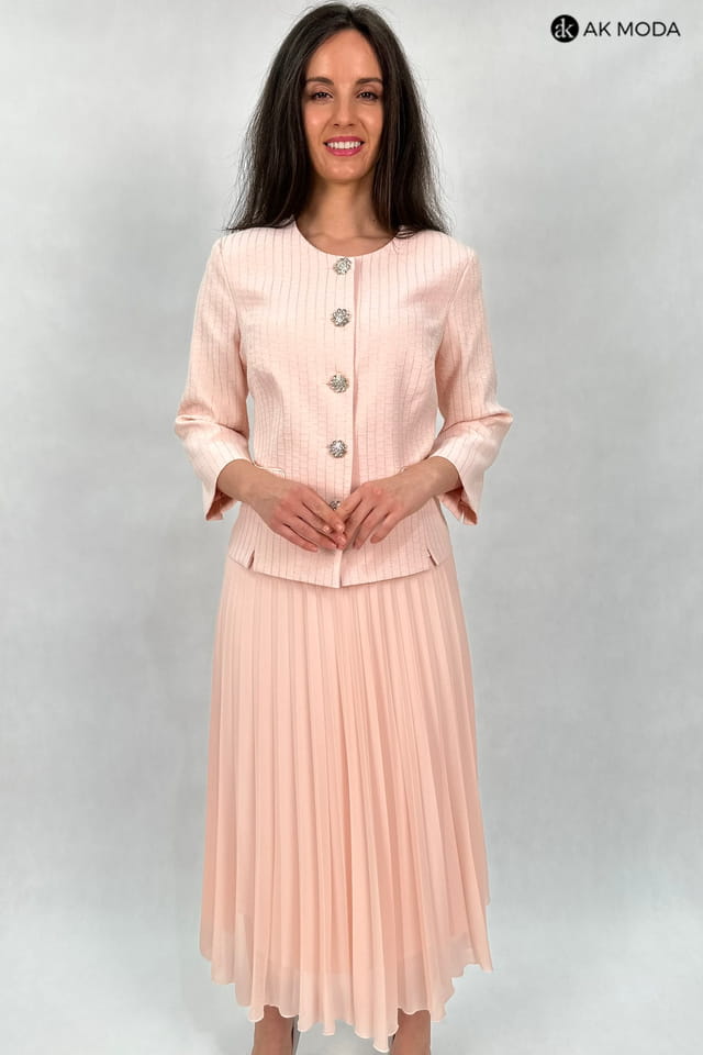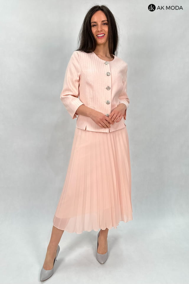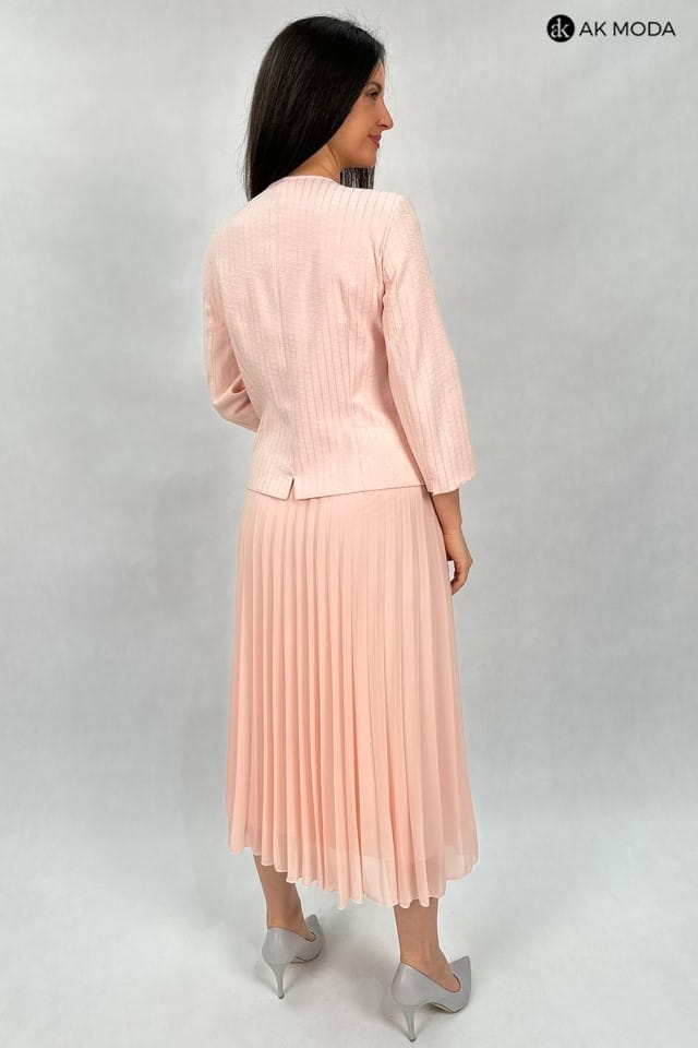 Elegancki komplet damski w kolorze łososiowym, składający się z rozkloszowanej, plisowanej spódnicy oraz żakietu typu chanelka. Żakiet uszyty z wytłaczanego materiału z delikatnym złotym połyskiem.