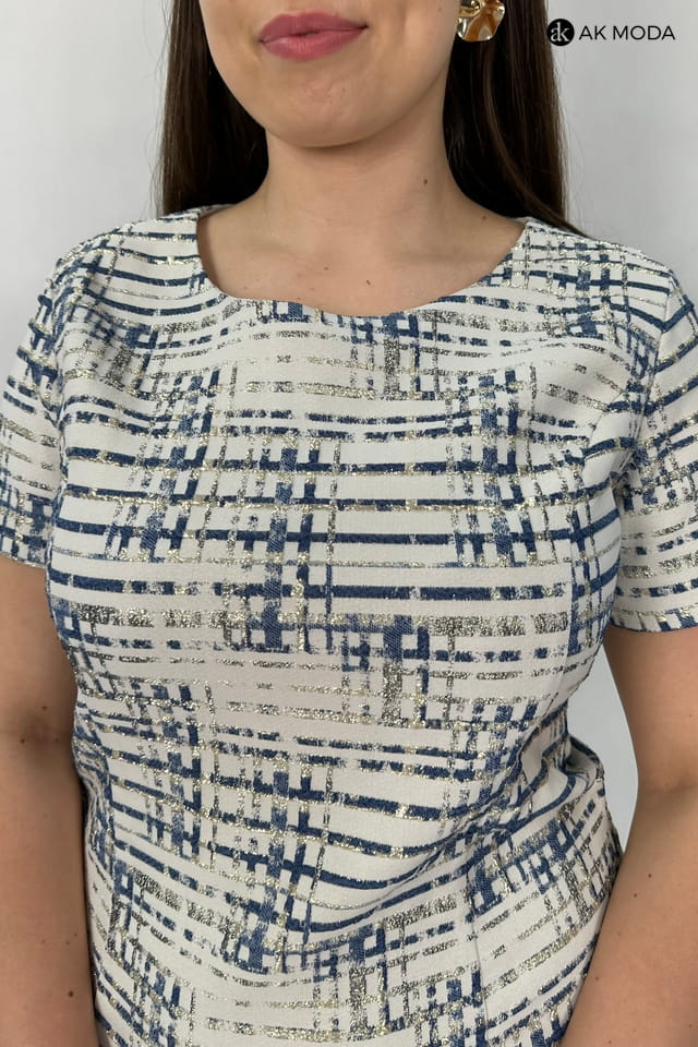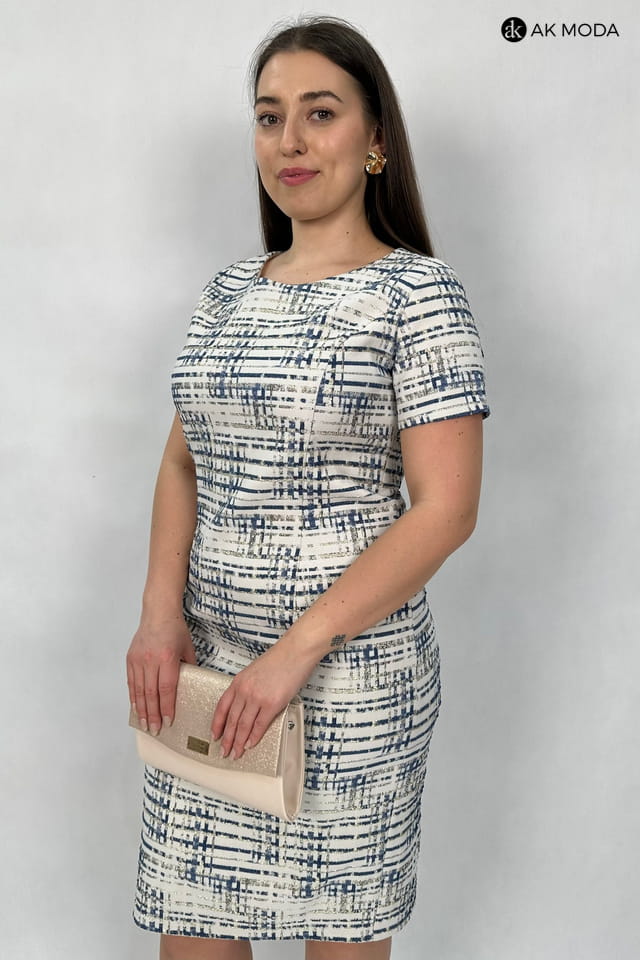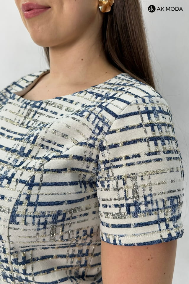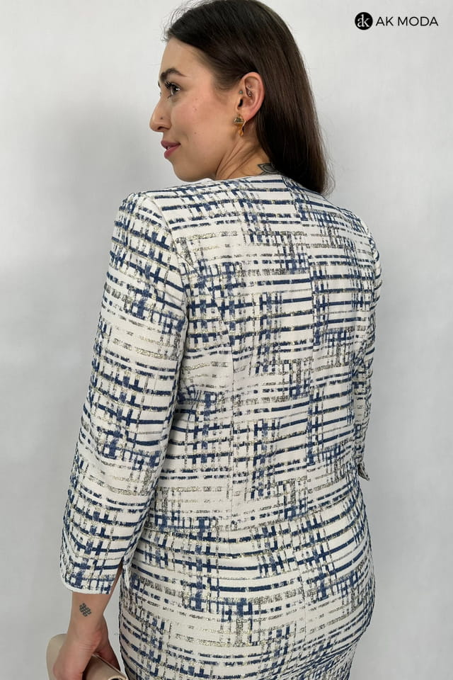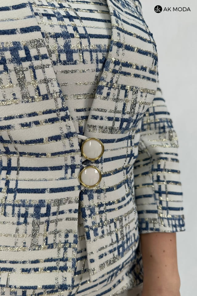 Elegancki komplet damski w kolorze beżowym z tłoczonym granatowo - złotym wzorem. W skład zestawu wchodzi dopasowana sukienka z krótkimi rękawami oraz żakiet z rękawami do łocia, zapinany na ozdobne guziki. Przy żakiecie odpinany kwiatek.