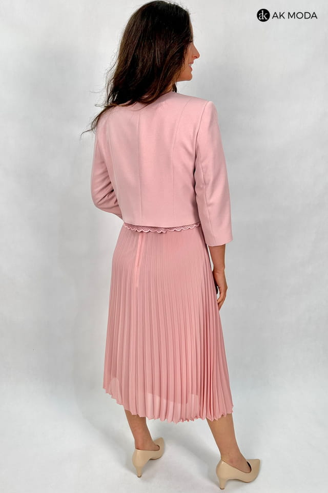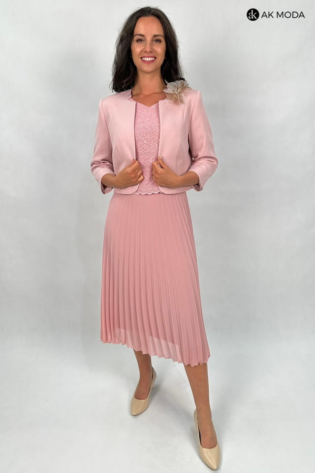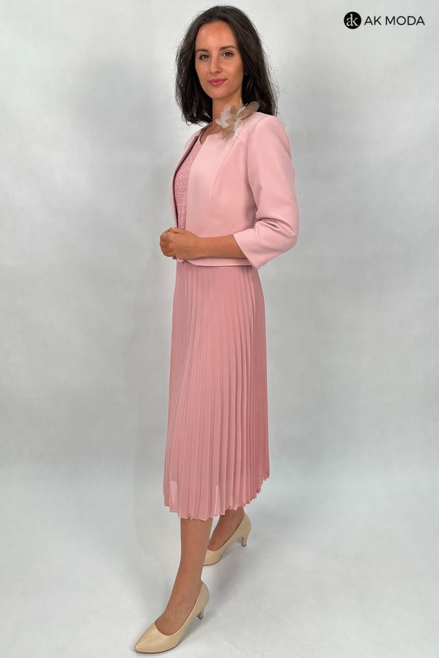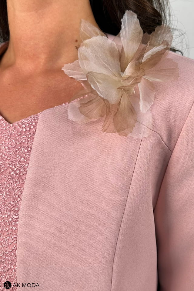 Elegancki komplet damski z żakietem, w kolorze pudrowego różu. Sukienka z krótkimi rękawami - góra koronkowa, dół plisowany. Żakiet z rękawami 3/4 i odpinanym ozdobnym kwiatkiem.