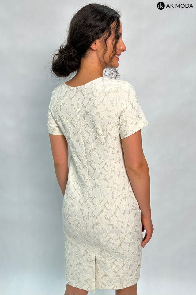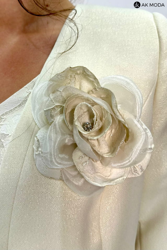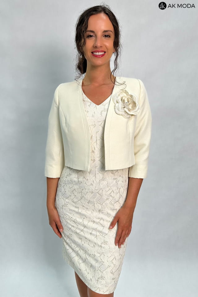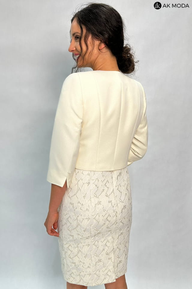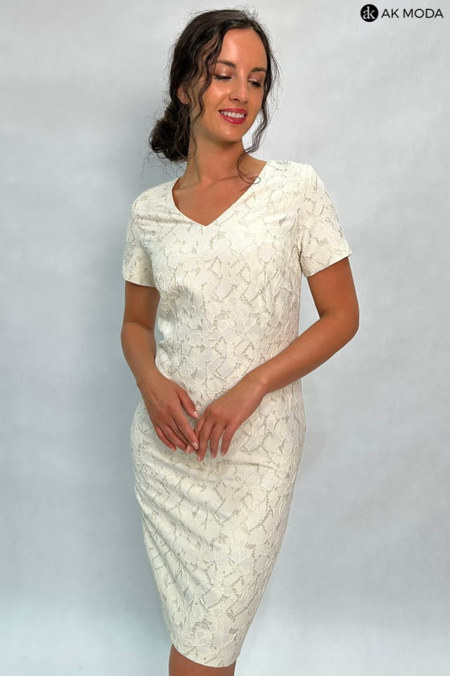 Elegancki komplet damski składający się z prostej sukienki z dekoltem w serek oraz żakietu. Sukienka uszyta z wytłaczanego materiału w kolorze beżu i złota, żakiet - gładki, w kolorze beżowym z delikatnym złotym połyskiem. Przy żakiecie odpinana ozdoba.