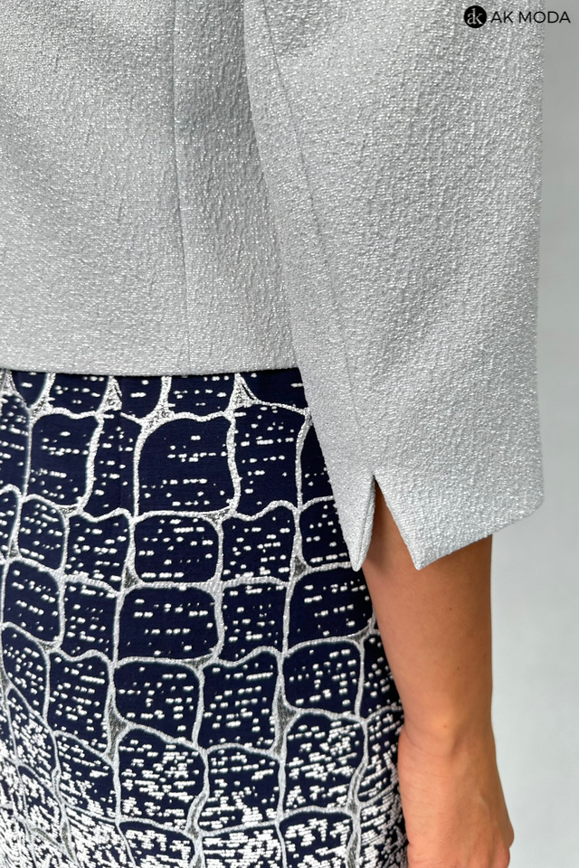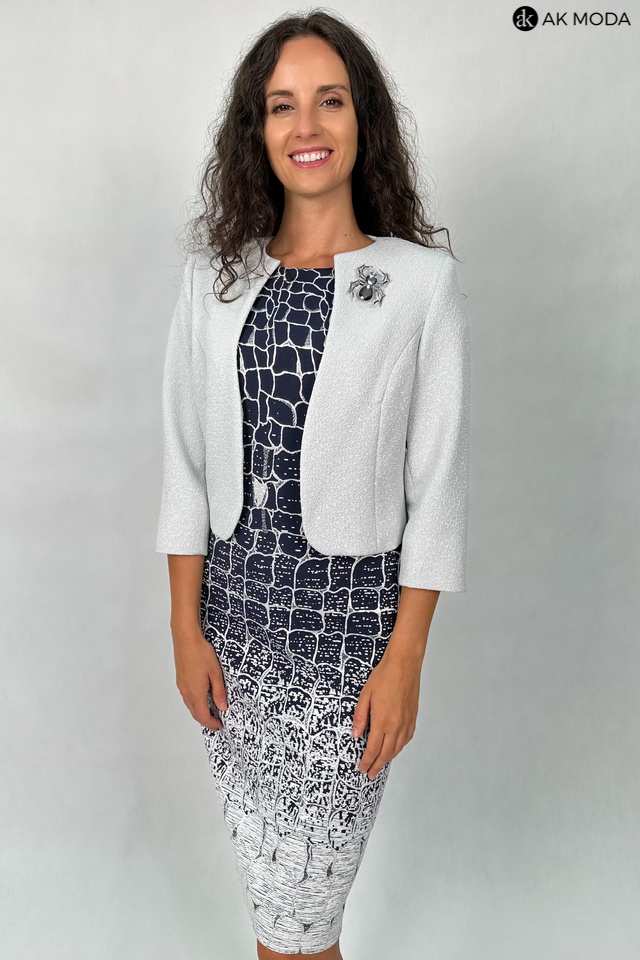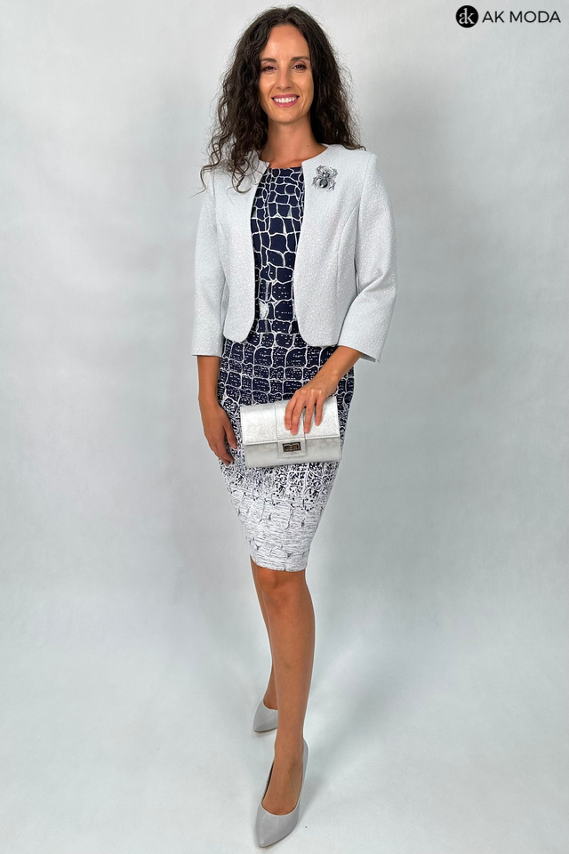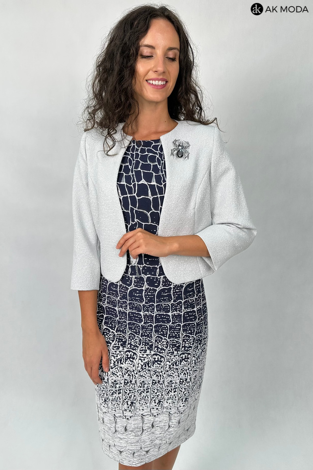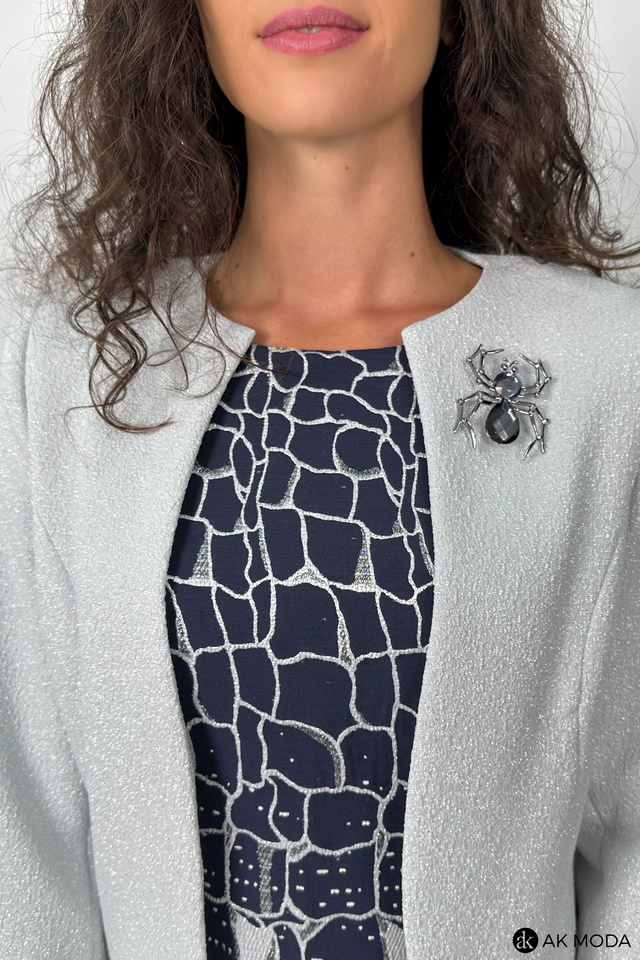 Elegancki komplet damski składający się z prostej sukienki z okrągłym dekoltem oraz żakietu. Sukienka o dopasowanym kroju, ozdobiona srebrno-szarym wzorem na granatowym tle. Jasnoszary, srebrzysty żakiet , o krótkim kroju ma subtelną, fakturowaną powierzchnię, która dodaje mu elegancji. Po lewej stronie znajduje się ozdobna broszka w kształcie pająka.