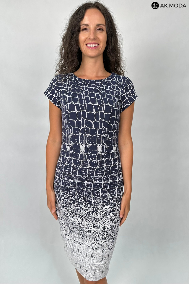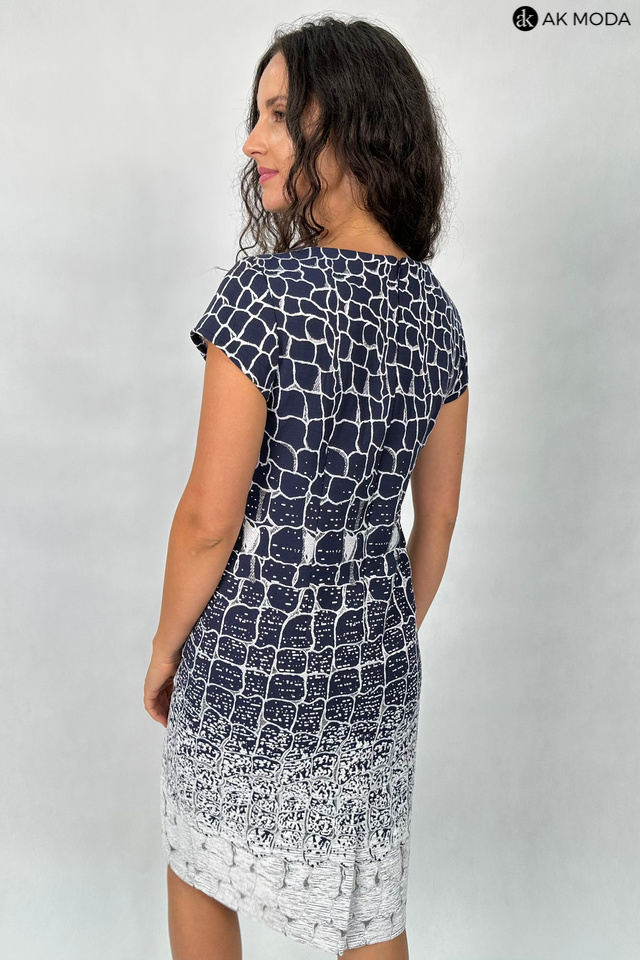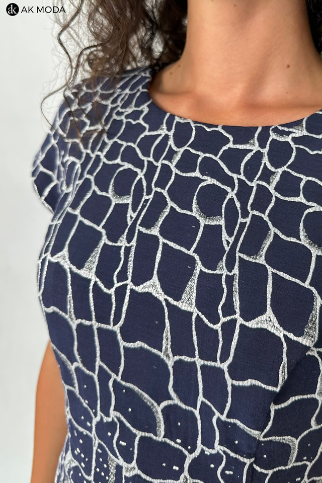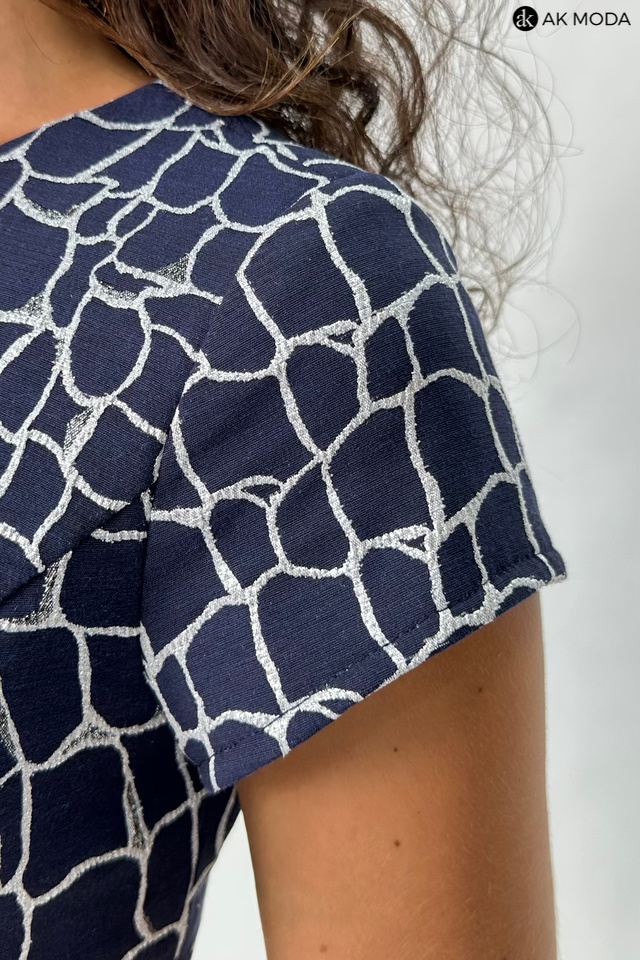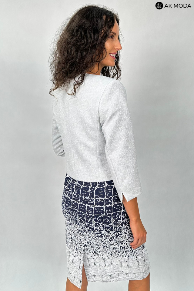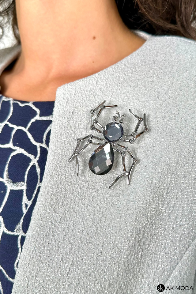 Elegancki komplet damski składający się z prostej sukienki z okrągłym dekoltem oraz żakietu. Sukienka o dopasowanym kroju, ozdobiona srebrno-szarym wzorem na granatowym tle. Jasnoszary, srebrzysty żakiet , o krótkim kroju ma subtelną, fakturowaną powierzchnię, która dodaje mu elegancji. Po lewej stronie znajduje się ozdobna broszka w kształcie pająka.