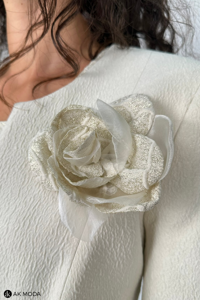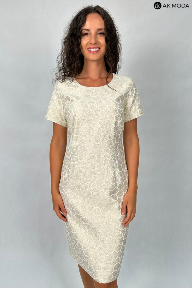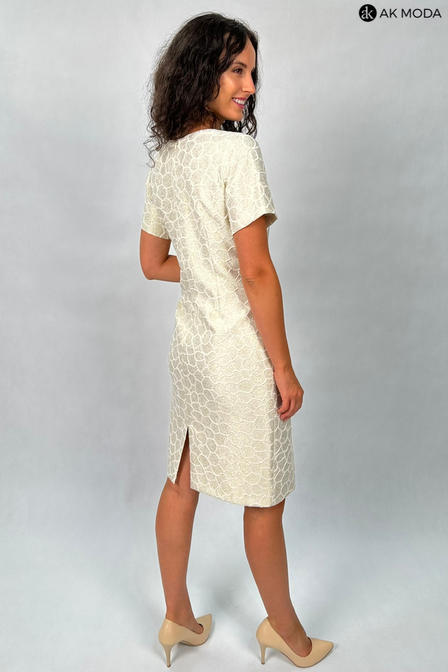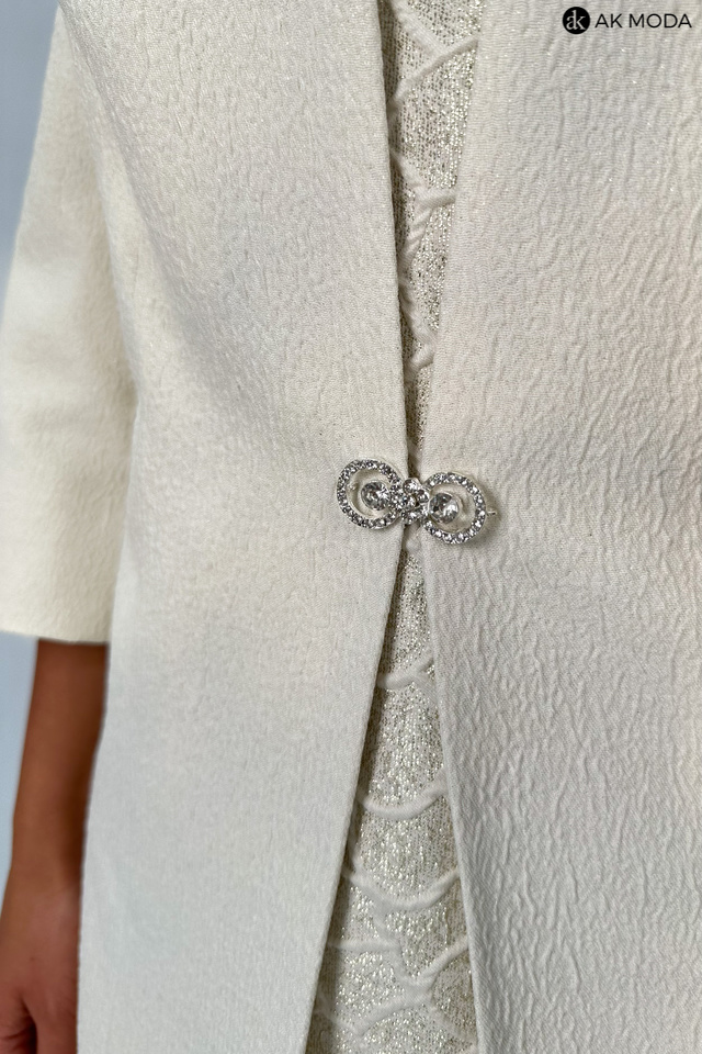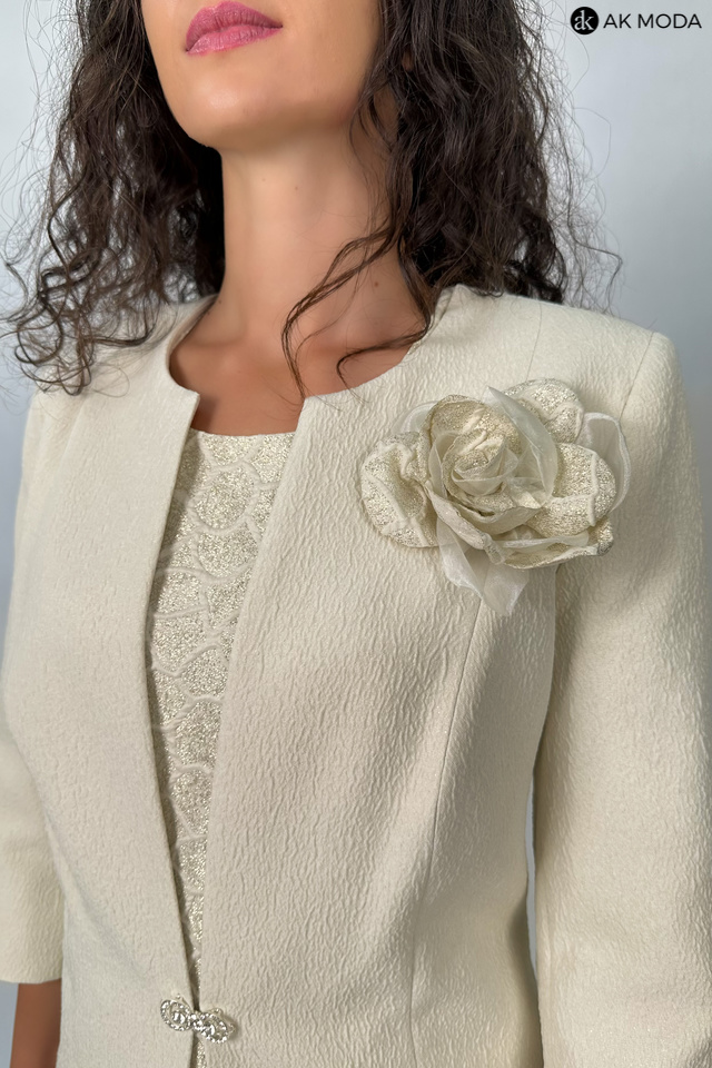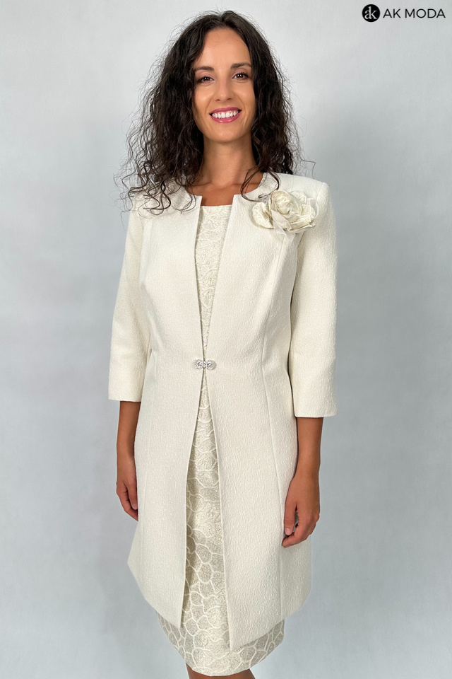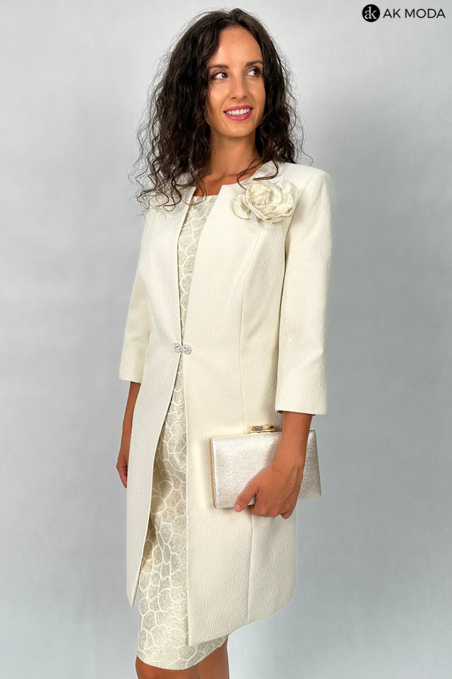 Elegancki komplet damski składający się z prostej sukienki z krótkim rękawem oraz długiego żakietu z odpinanym kwiatkiem. Sukienka o dopasowanym kroju, długości midi w geometryczny wzór, uszyta z wytłaczanego materiału w beżowo-złotym kolorze. Żakiet jasny, uszyty z fakturowanej tkaniny, zapinany na ozdobną haftkę. Rękawy 3/4.