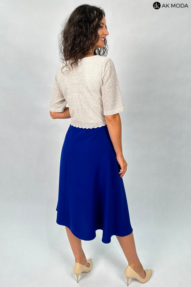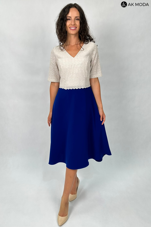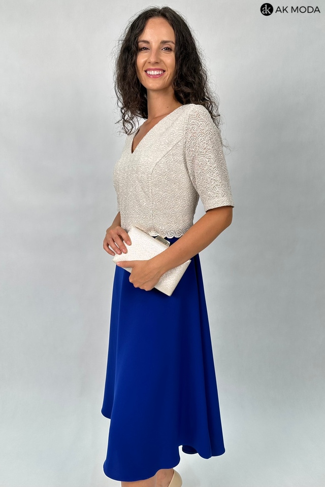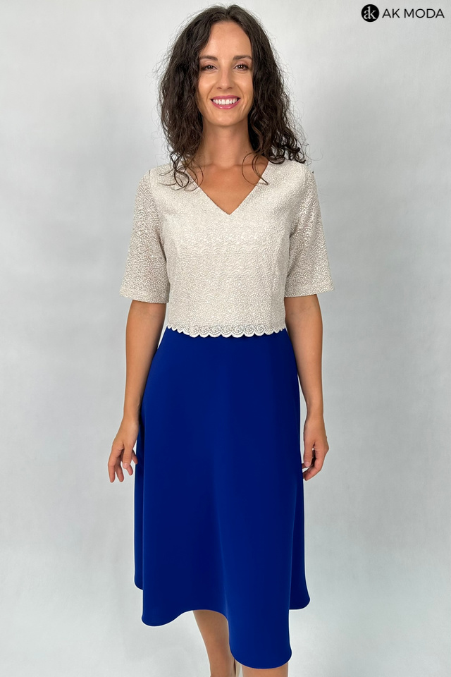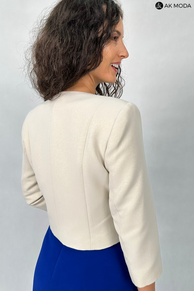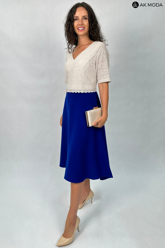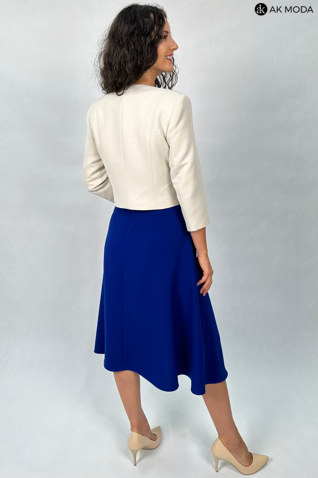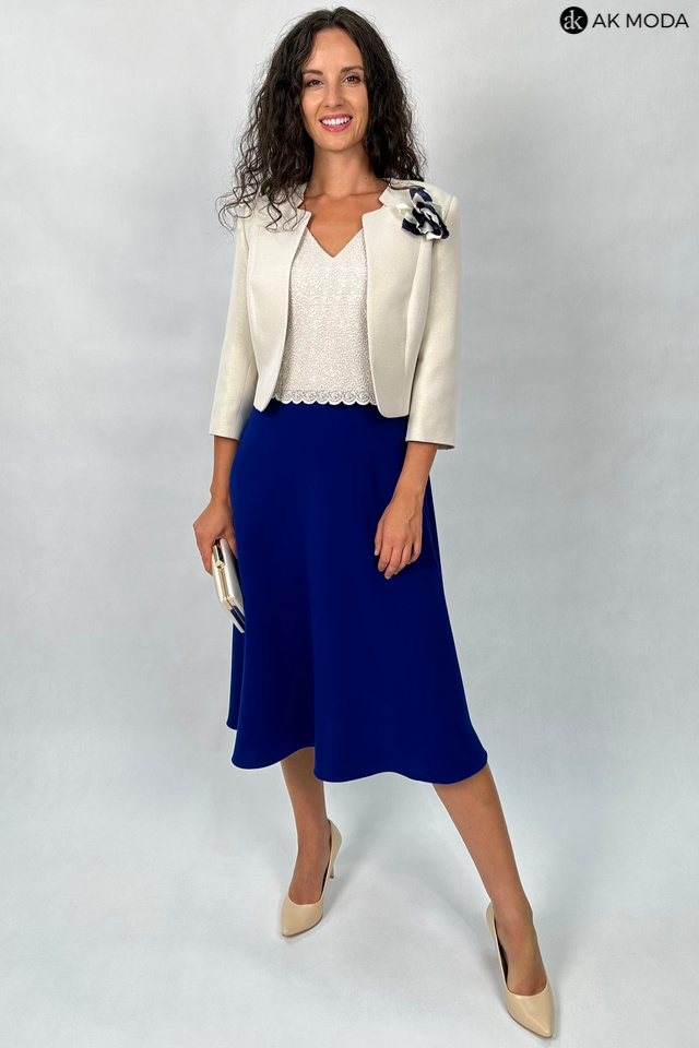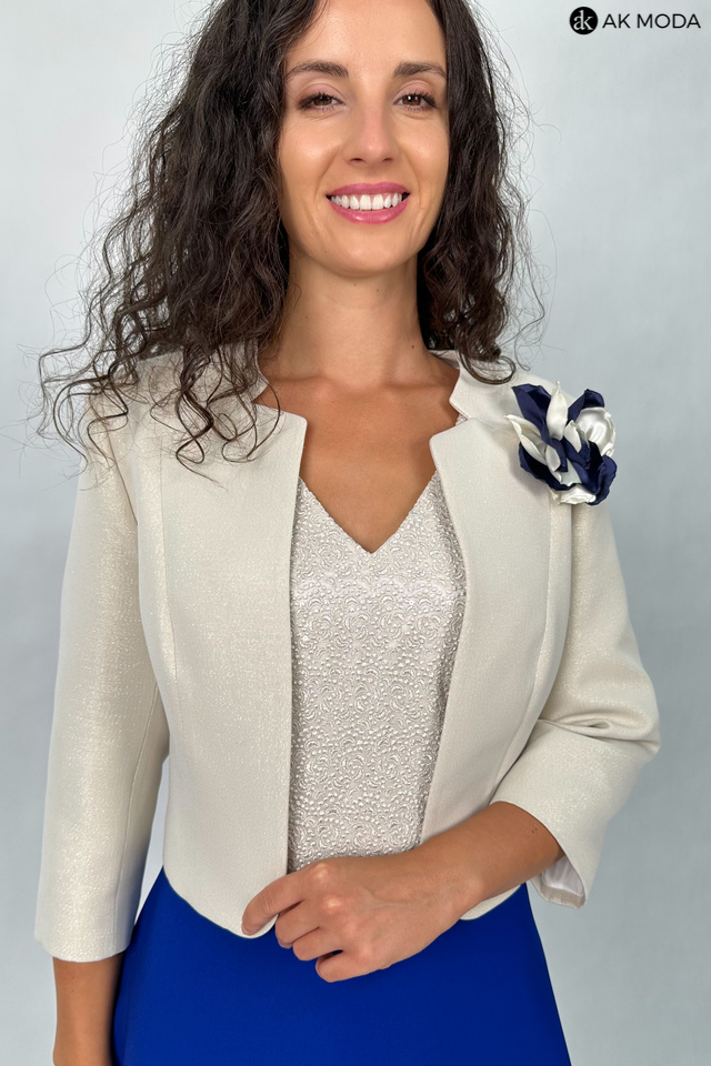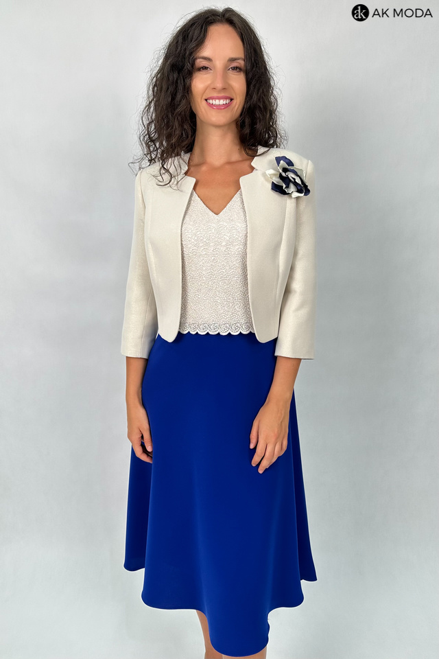 Elegancki komplet damski składający się z krótkiego żakietu oraz sukienki. Sukienka z krótkimi rękawami - koronkowa góra w kolorze beżowo- złotym oraz rozkloszowany dół w kolorze chabrowym. Żakiet z rękawami 3/4 i odpinanym ozdobnym kwiatkiem.