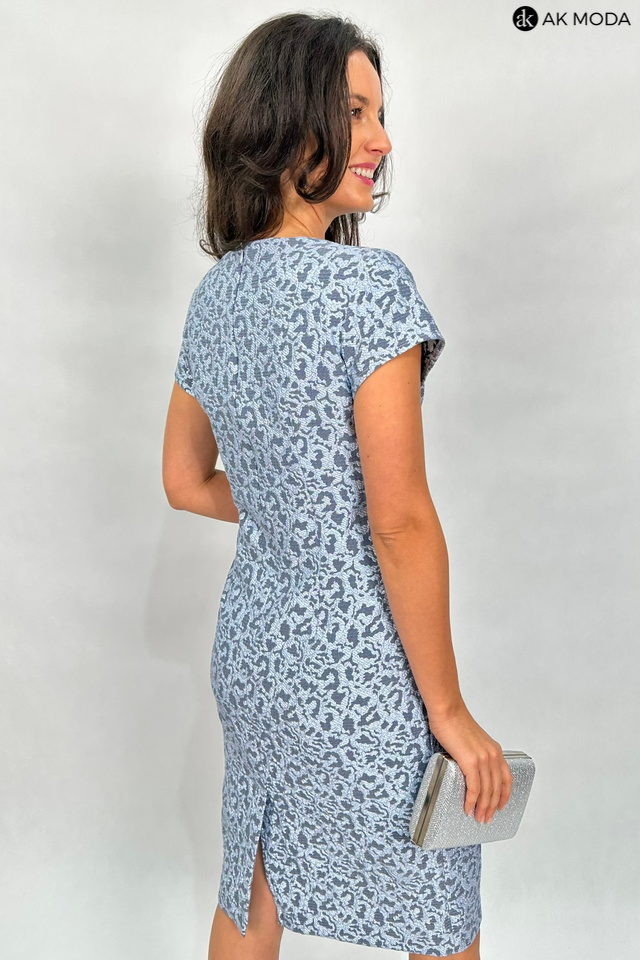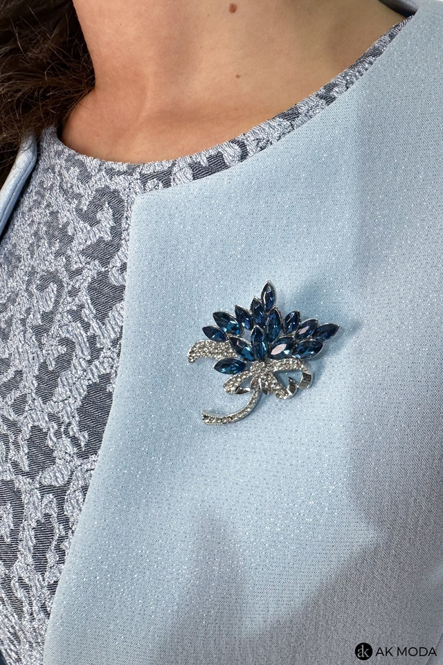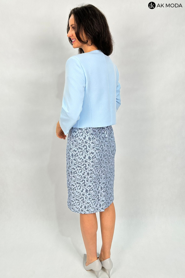 Elegancki komplet damski składający się z dopasowanej sukienki z ozdobną klamrą w talii oraz krótkiego żakietu. Sukienka uszyta z wytłaczanego materiału, żakiet - gładki, w kolorze błękitnym z połyskiem. Przy żakiecie odpinana broszka.