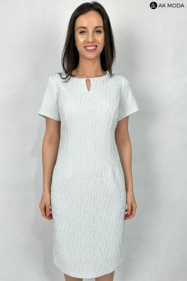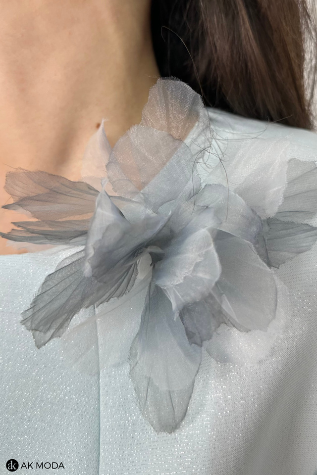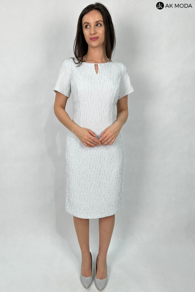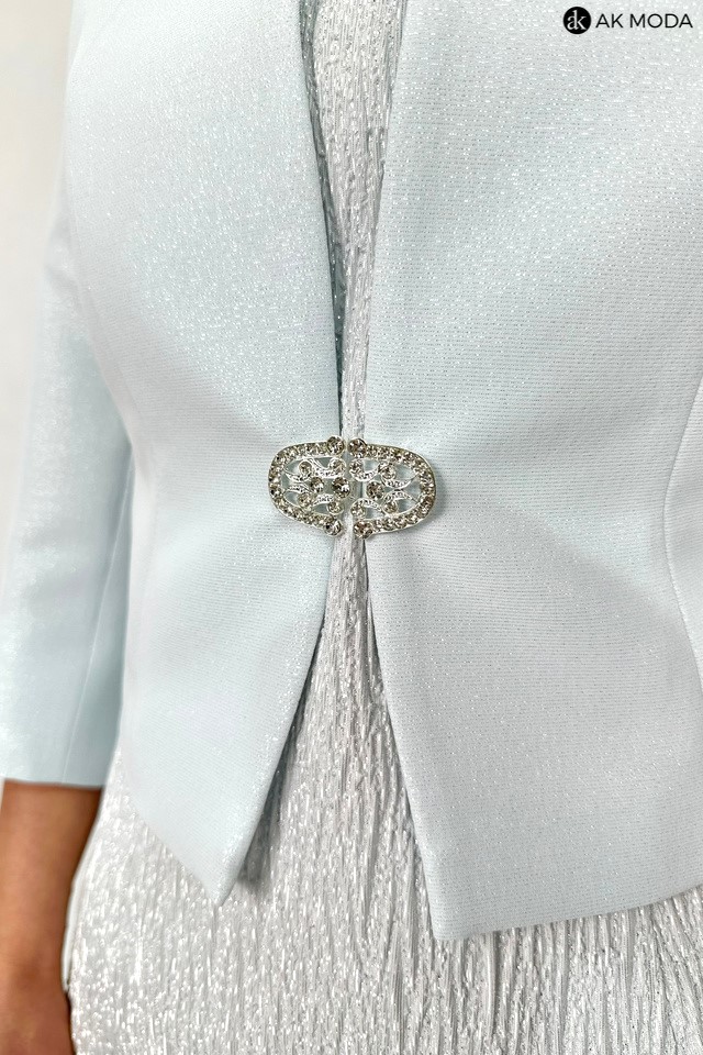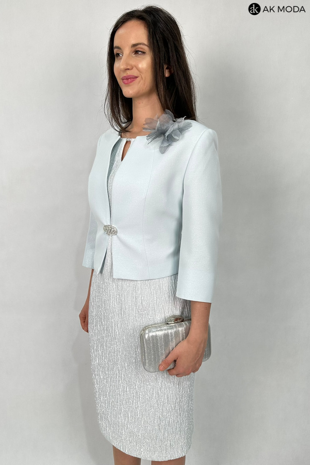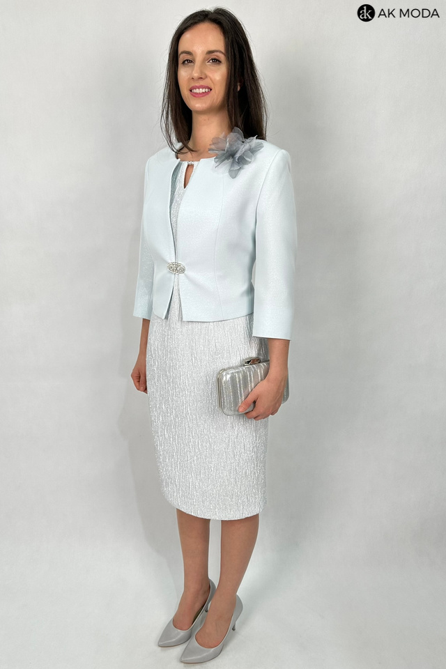 Elegancki komplet damski w kolorze niebiesko-srebrnym, składający się z prostej sukienki z krótkimi rękawami oraz żakietu. Sukienka uszyta z wytłaczanego, błyszczącego materiału, żakiet gładki ze srebrnym połyskiem. Przy żakiecie odpinany ozdobny kwiatek.