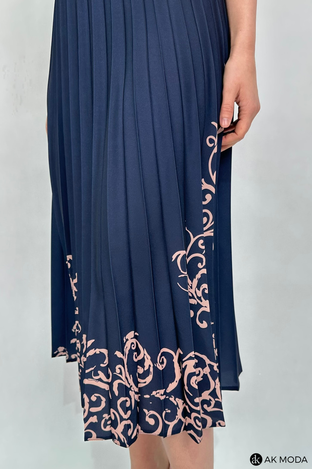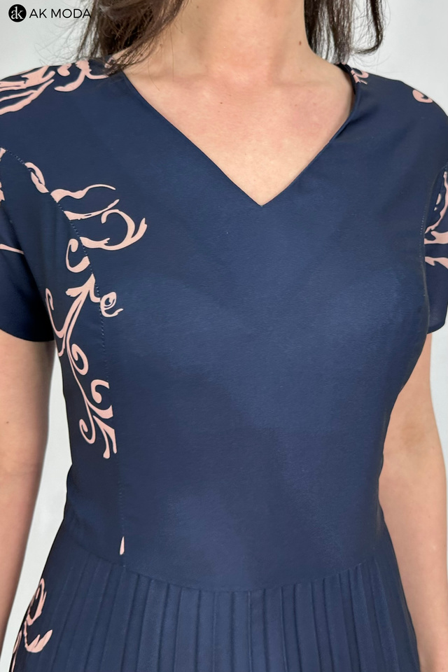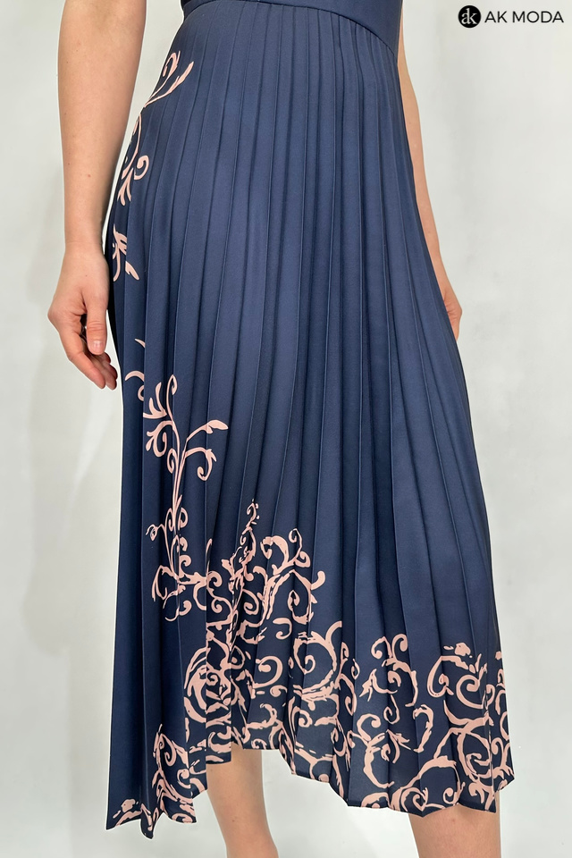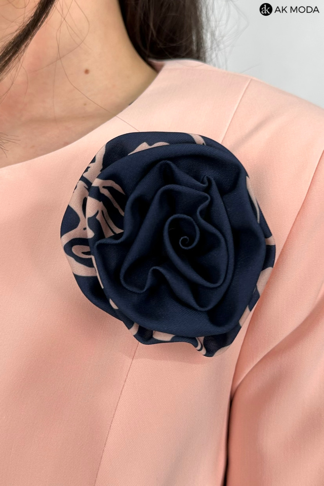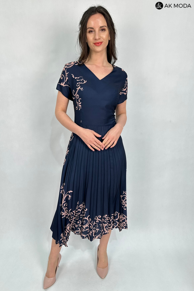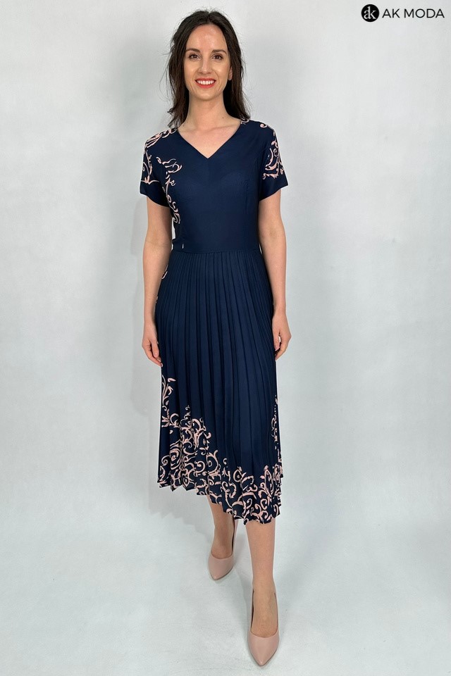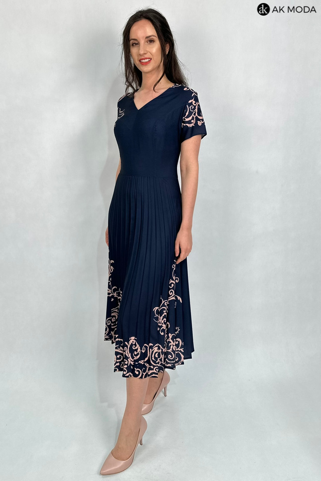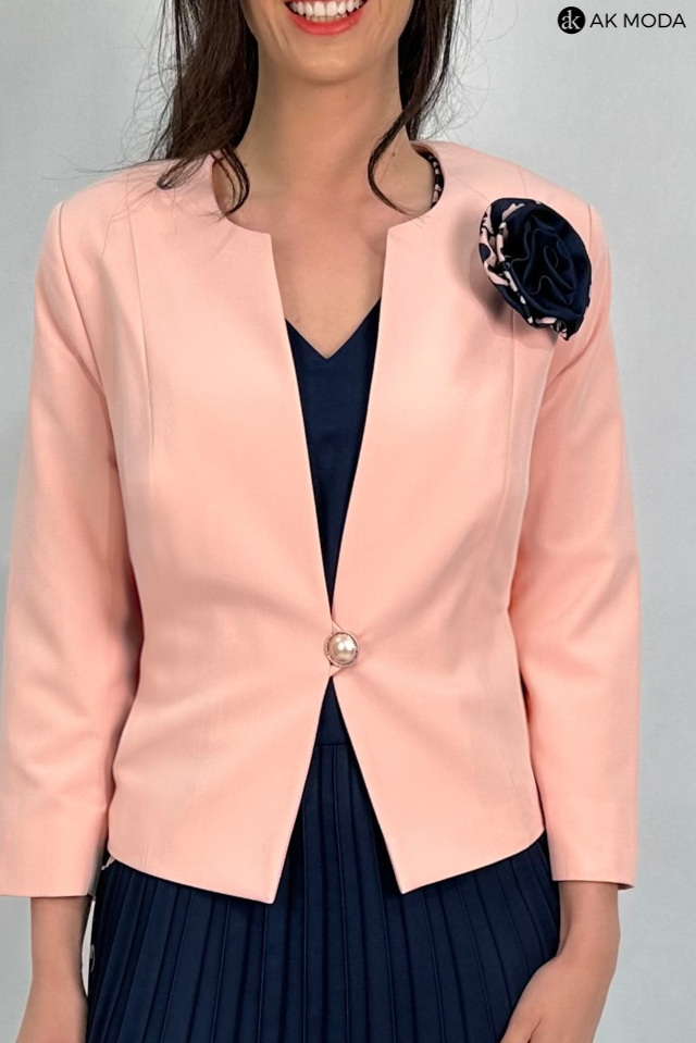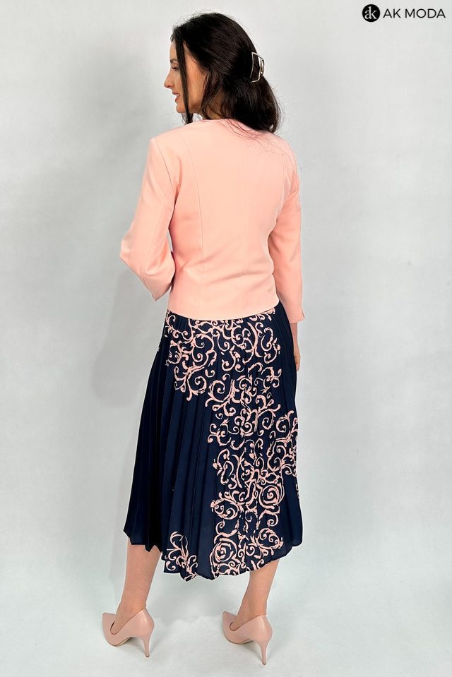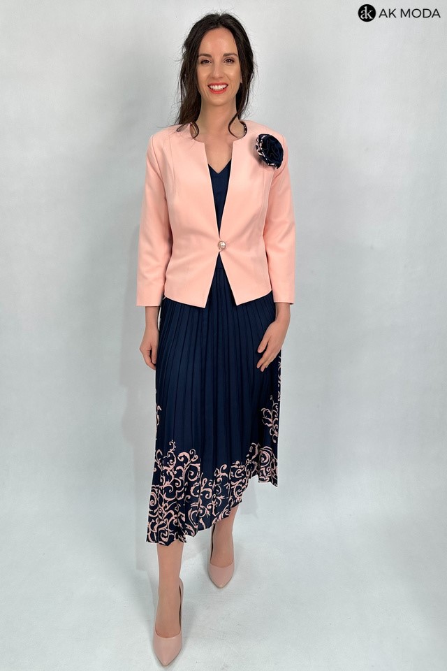Elegancki komplet damski składający się z rozkloszowanej sukienki oraz żakietu. Sukienka w kolorze granatowym z różowym wzorem, z krótkimi rękawami i dekoltem w szpic. Żakiet w kolorze różowym z rękawami 3/4 i odpinanym ozdobnym kwiatkiem.