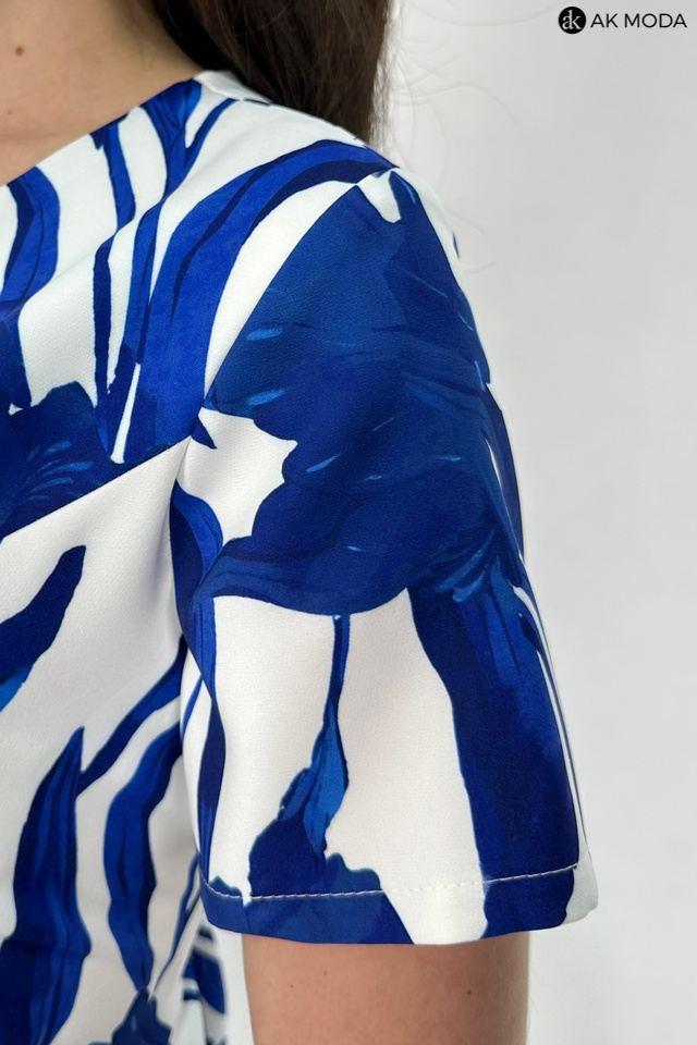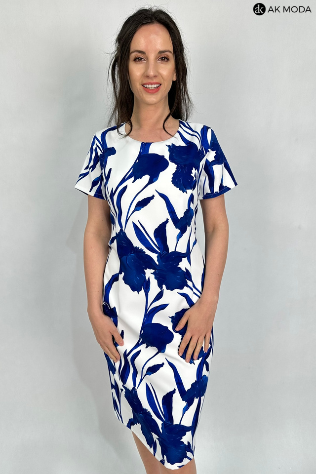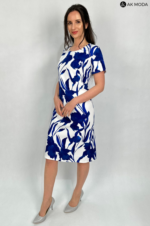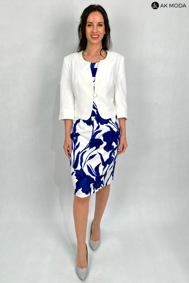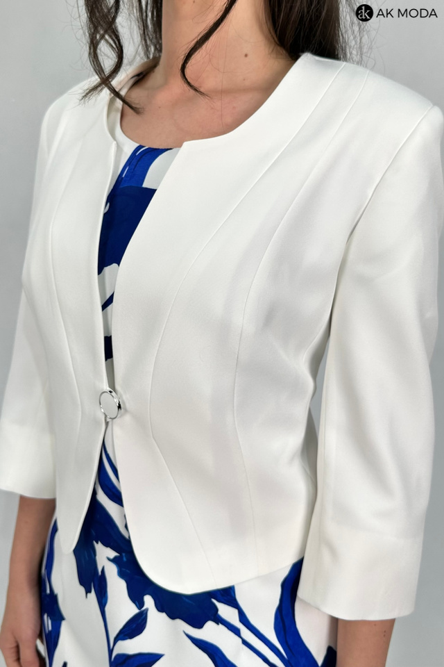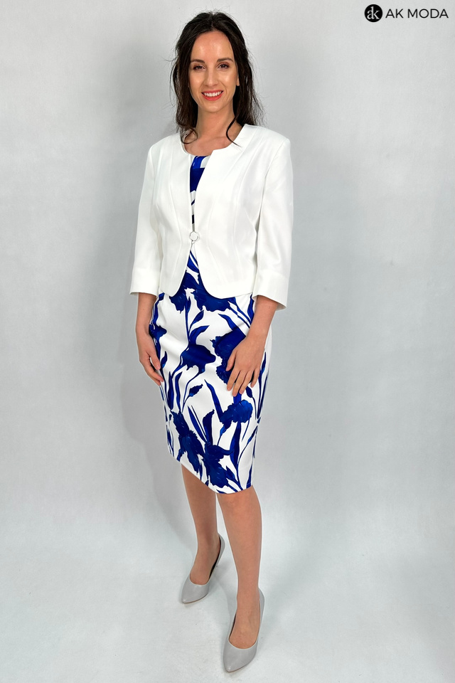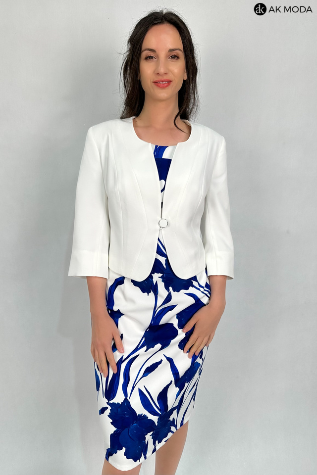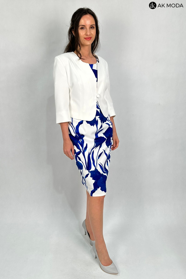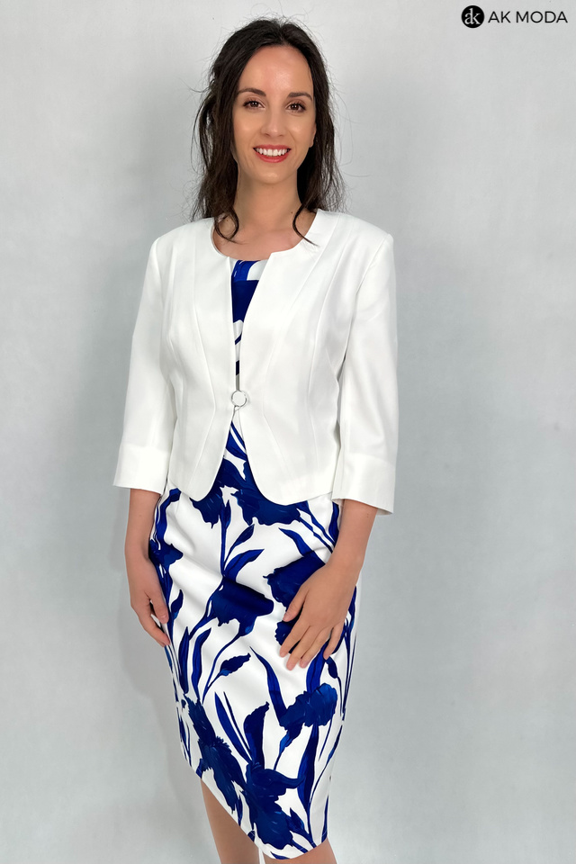 Elegancki komplet damski składający się z prostej sukienki z krótkimi rękawami oraz żakietu z rękawami 3/4. Sukienka w kolorze śmietankowym z kwiatowym wzorem w kolorze chabrowynm, żakiet gładki - śmietankowy.