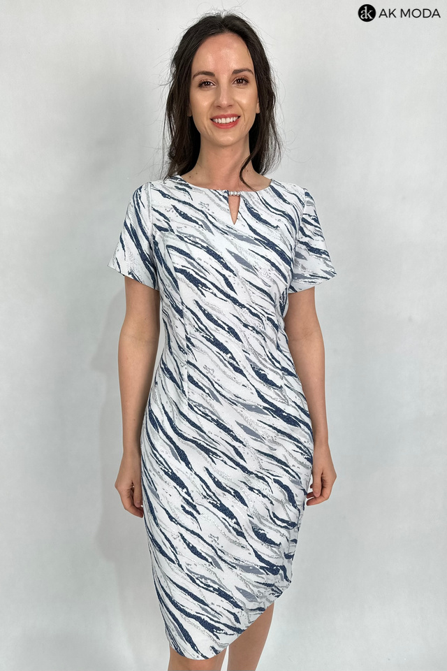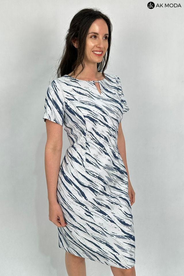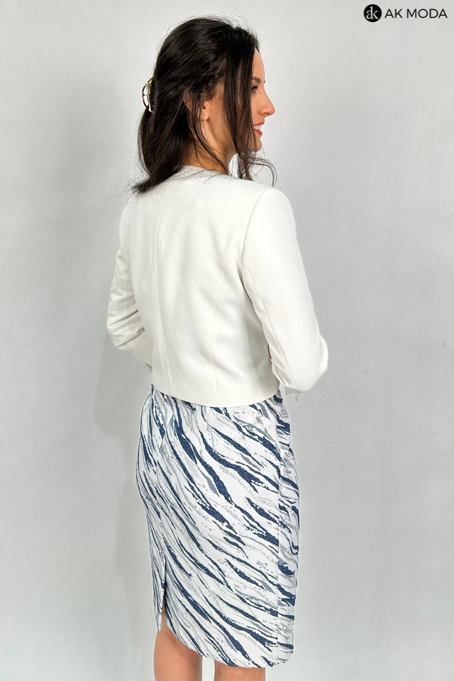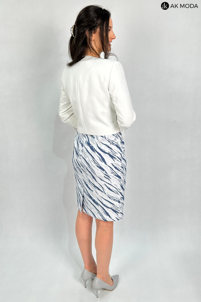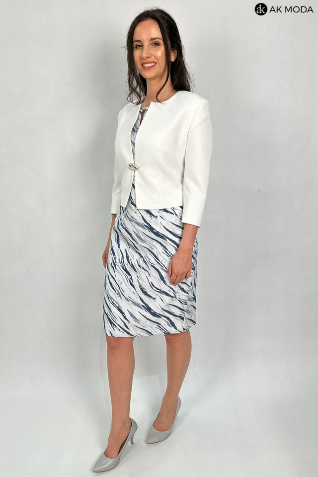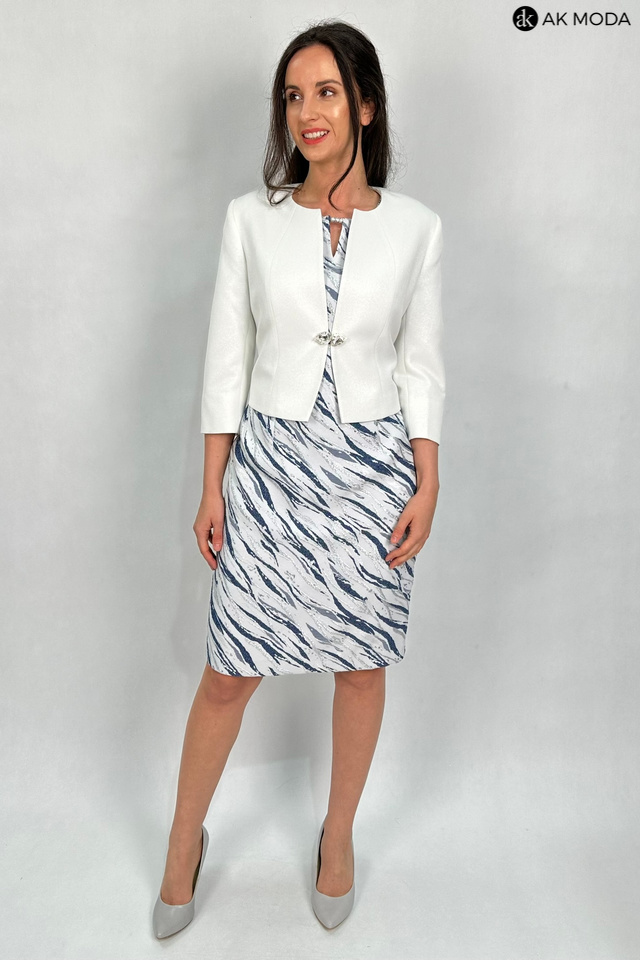 Elegancki komplet damski w kolorze srebrno-granatowym, składający się z prostej sukienki z krótkimi rękawami oraz żakietu. Sukienka uszyta z wytłaczanego, błyszczącego materiału, żakiet gładki ze srebrnym połyskiem. Przy żakiecie odpinany ozdobny kwiatek.