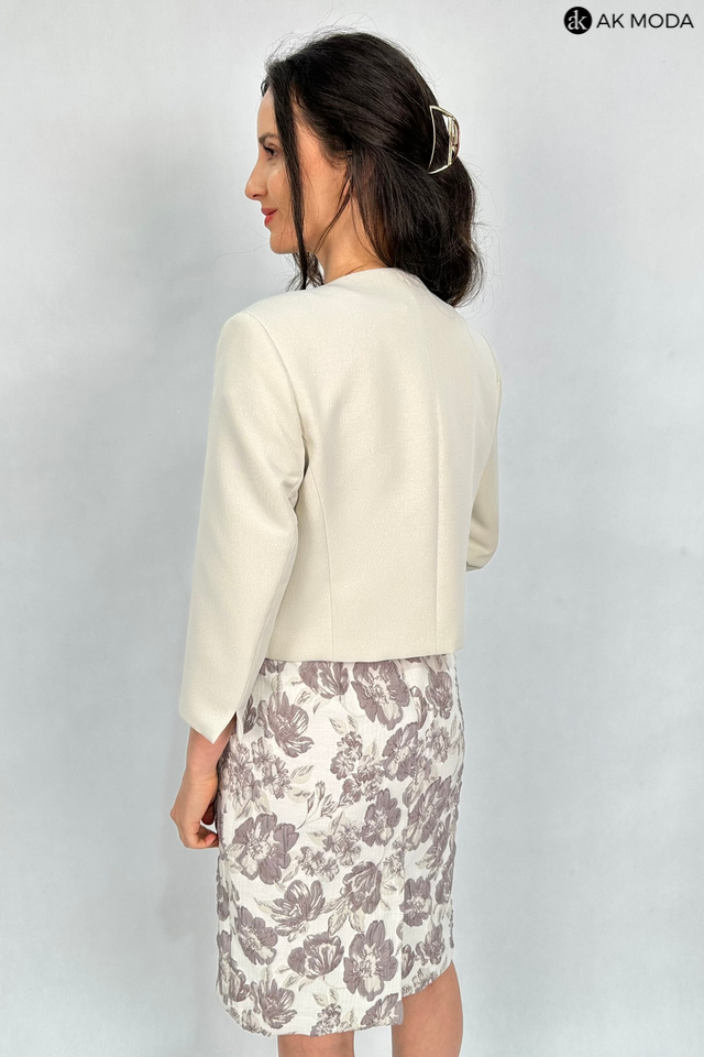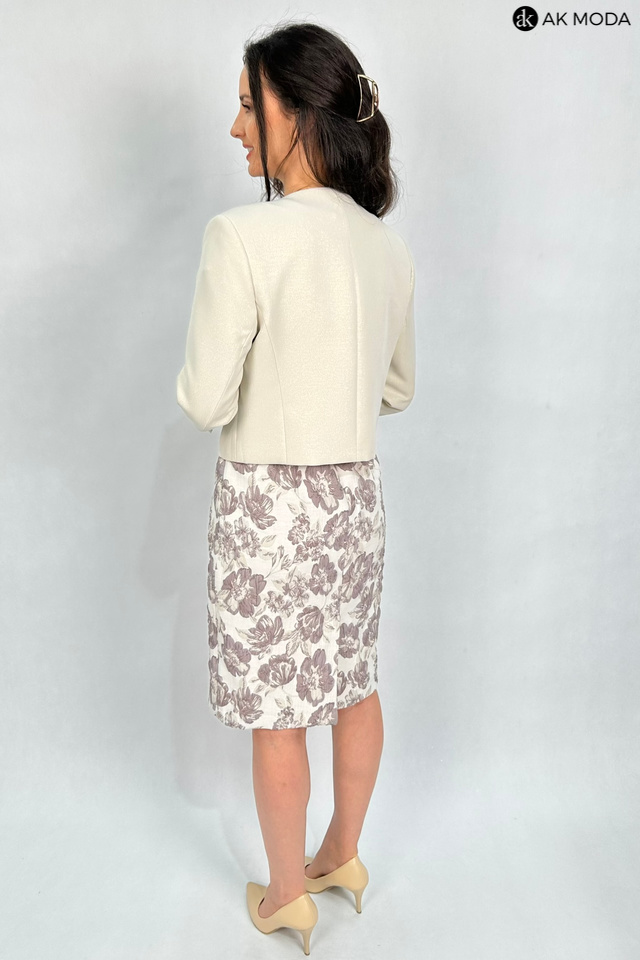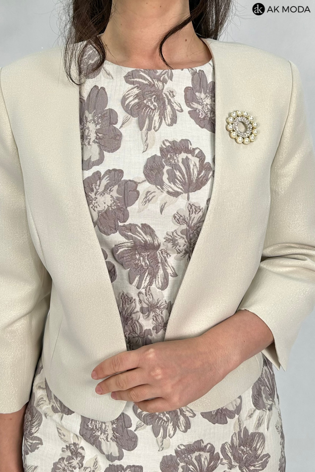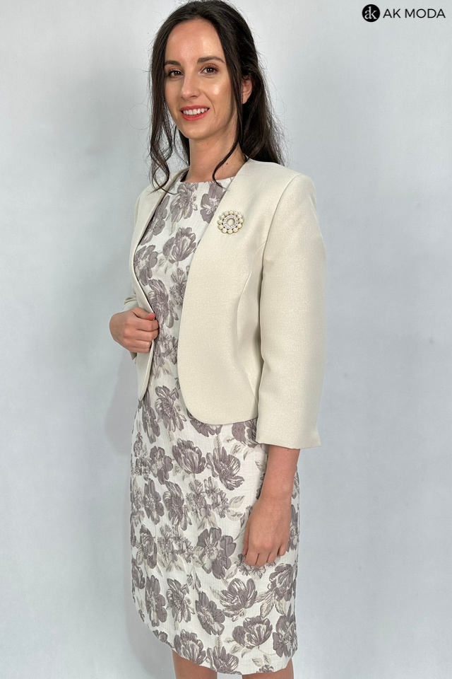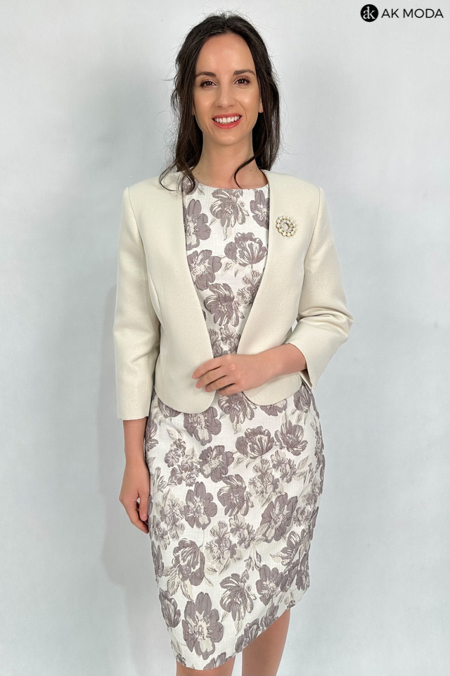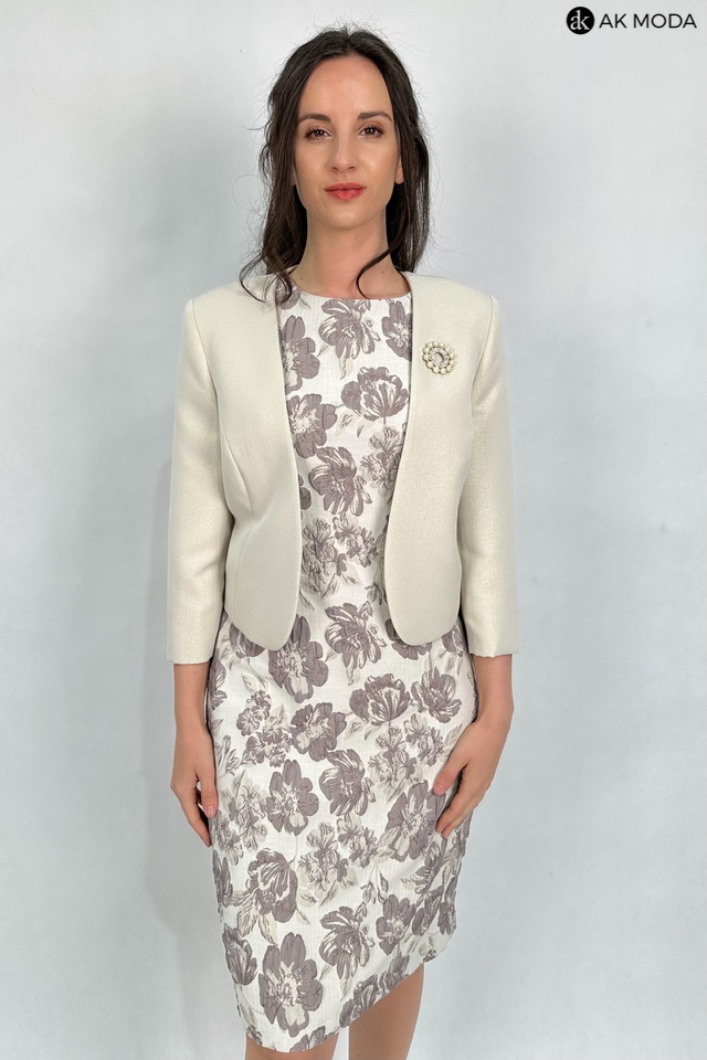 Elegancki komplet damski, składający się z prostej sukienki z okrągłym dekoltem oraz żakietu z rękawami 3/4. Sukienka beżowo-brązowa z tłoczonym kwiatowym wzorem, żakiet miętowy ze złotym połyskiem. Przy żakiecie odpinana ozdobna broszka.