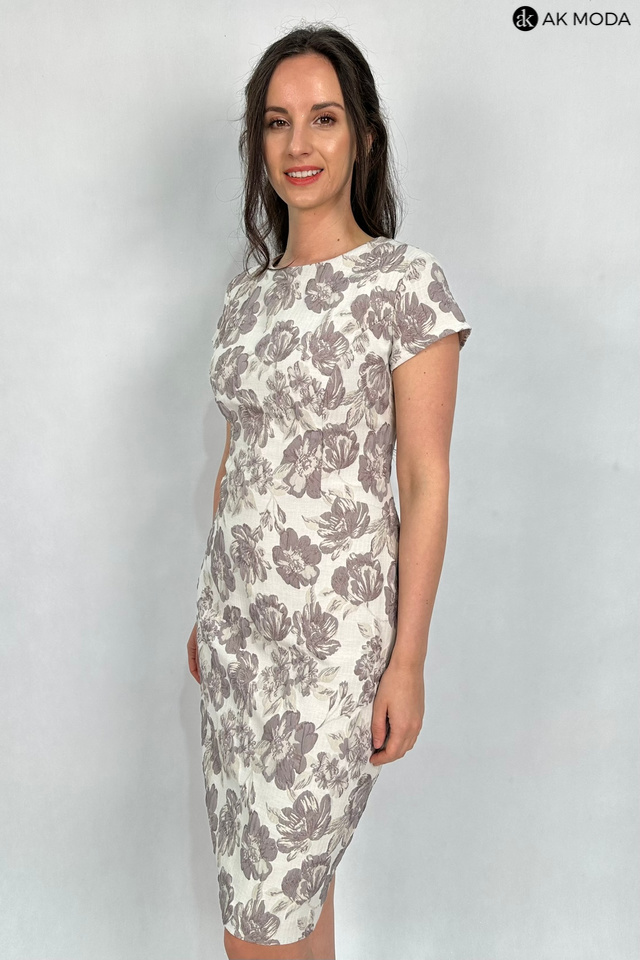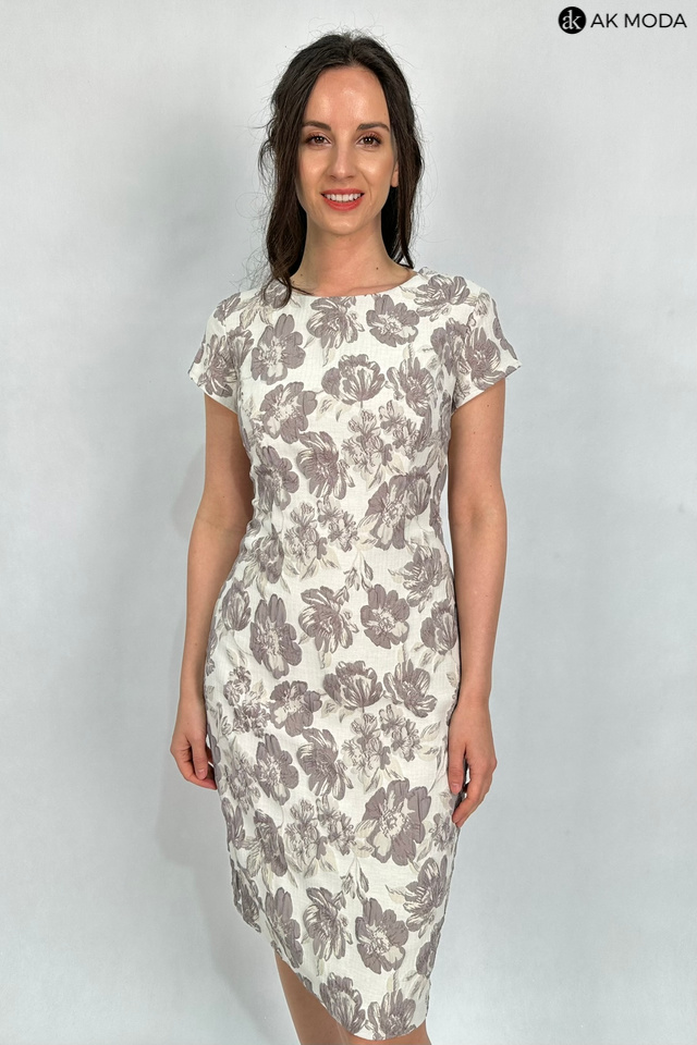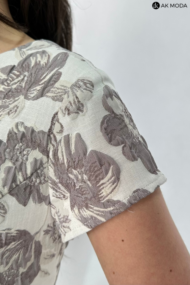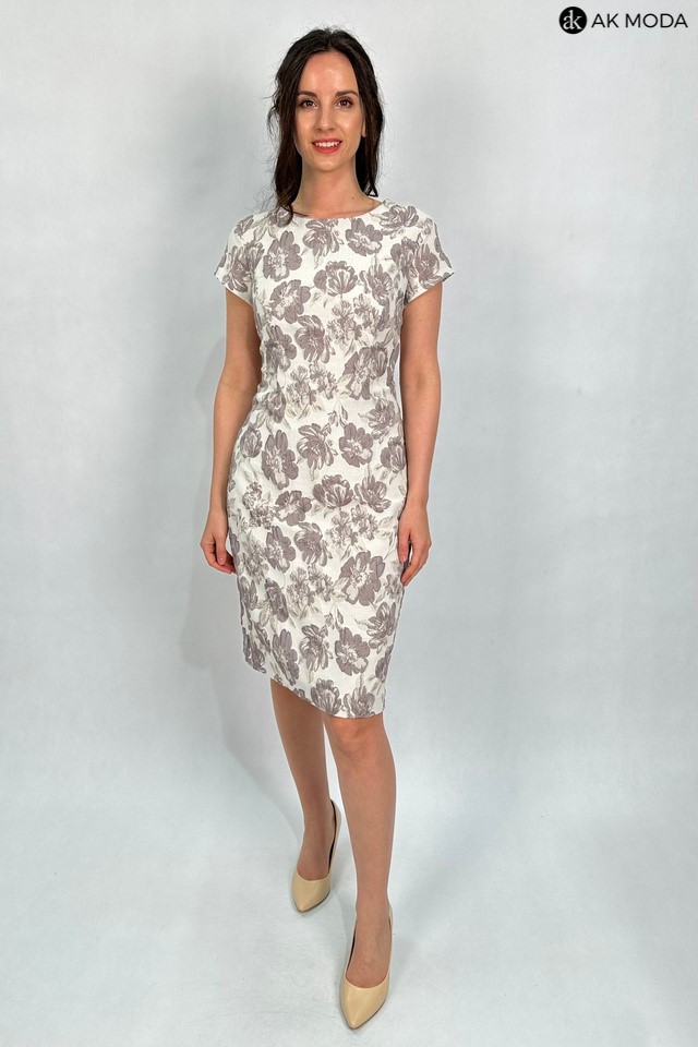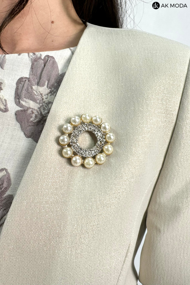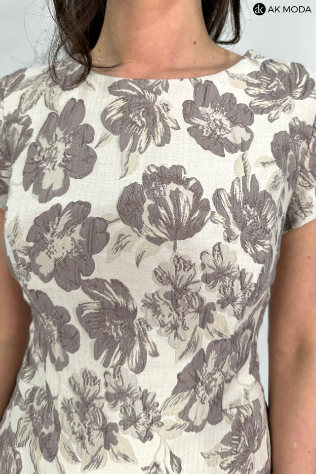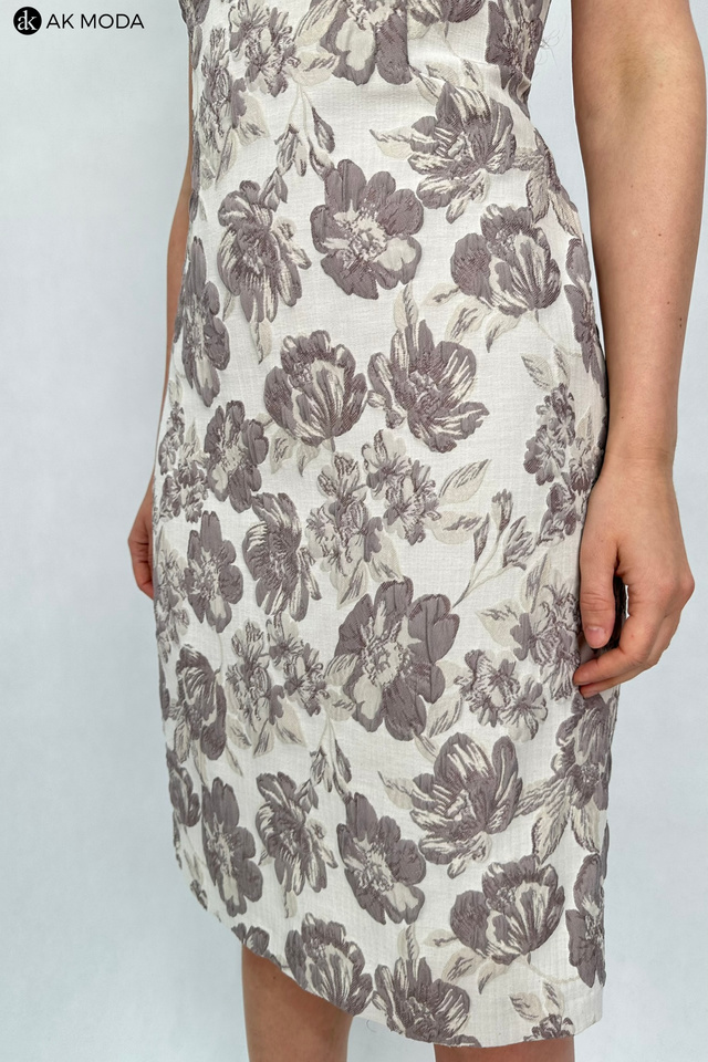 Elegancki komplet damski, składający się z prostej sukienki z okrągłym dekoltem oraz żakietu z rękawami 3/4. Sukienka beżowo-brązowa z tłoczonym kwiatowym wzorem, żakiet miętowy ze złotym połyskiem. Przy żakiecie odpinana ozdobna broszka.