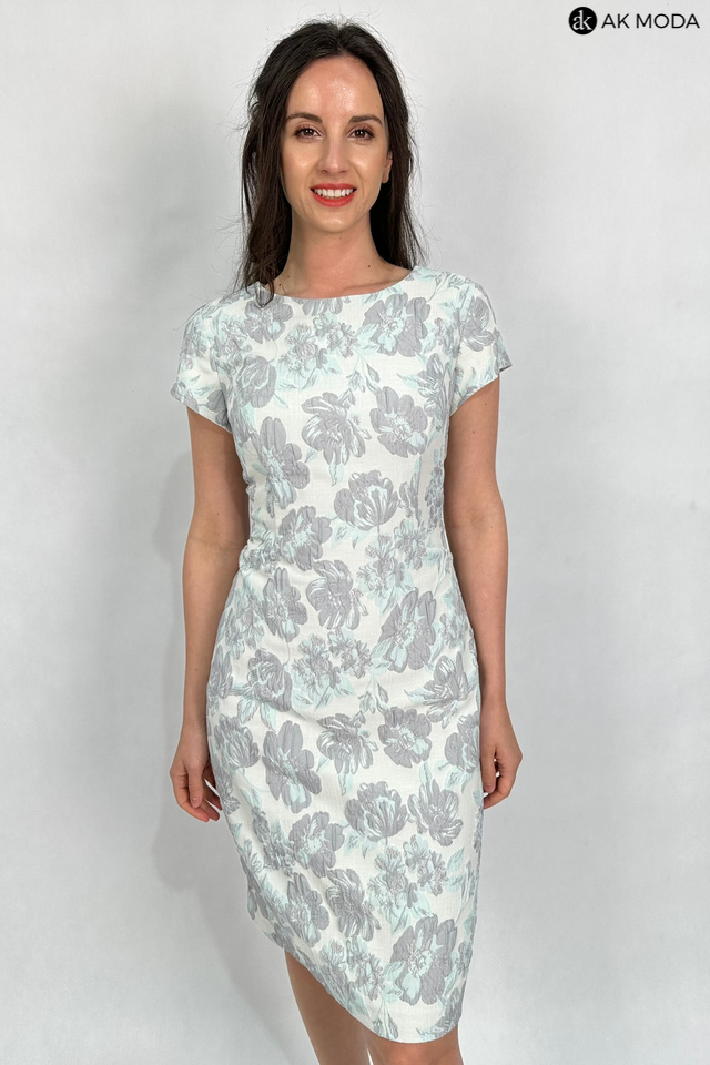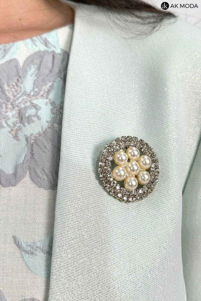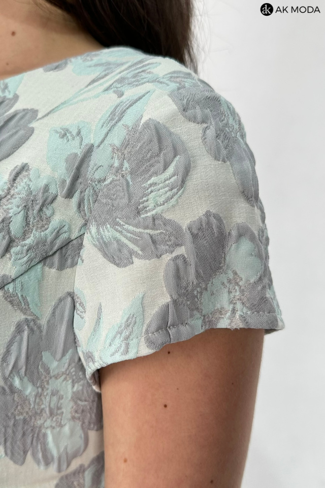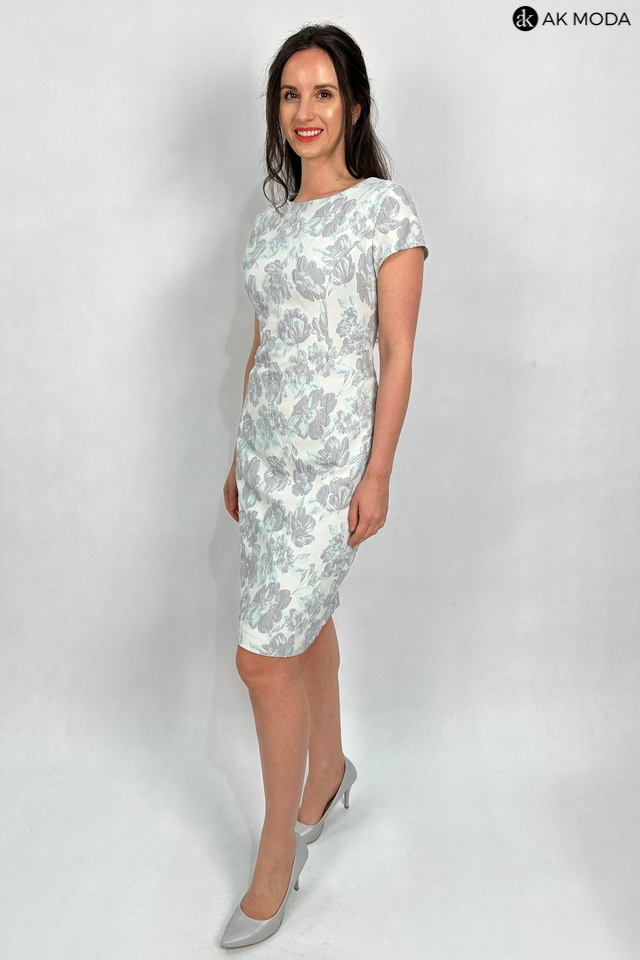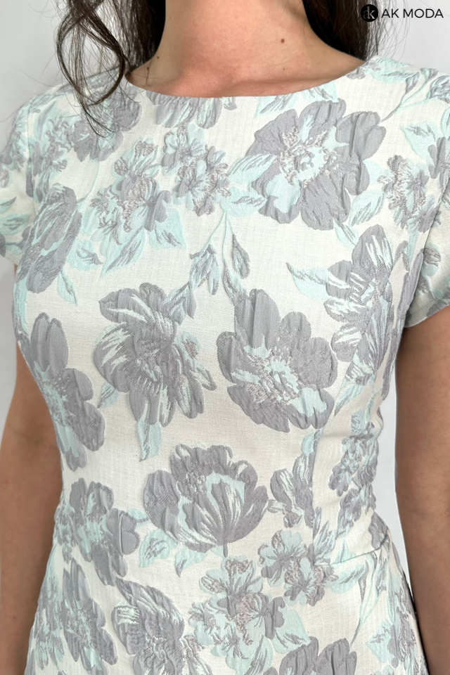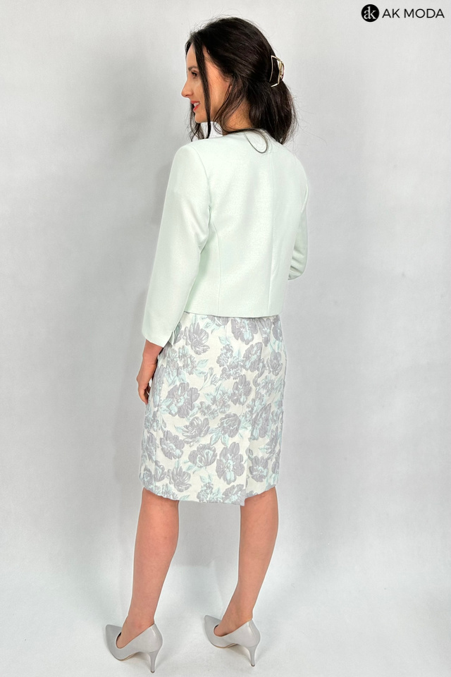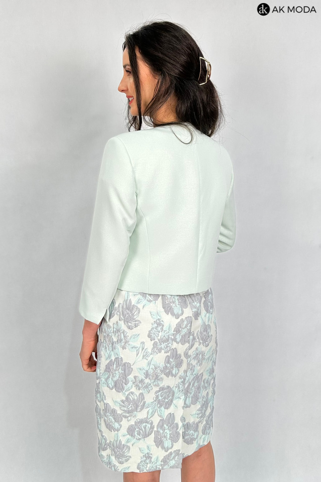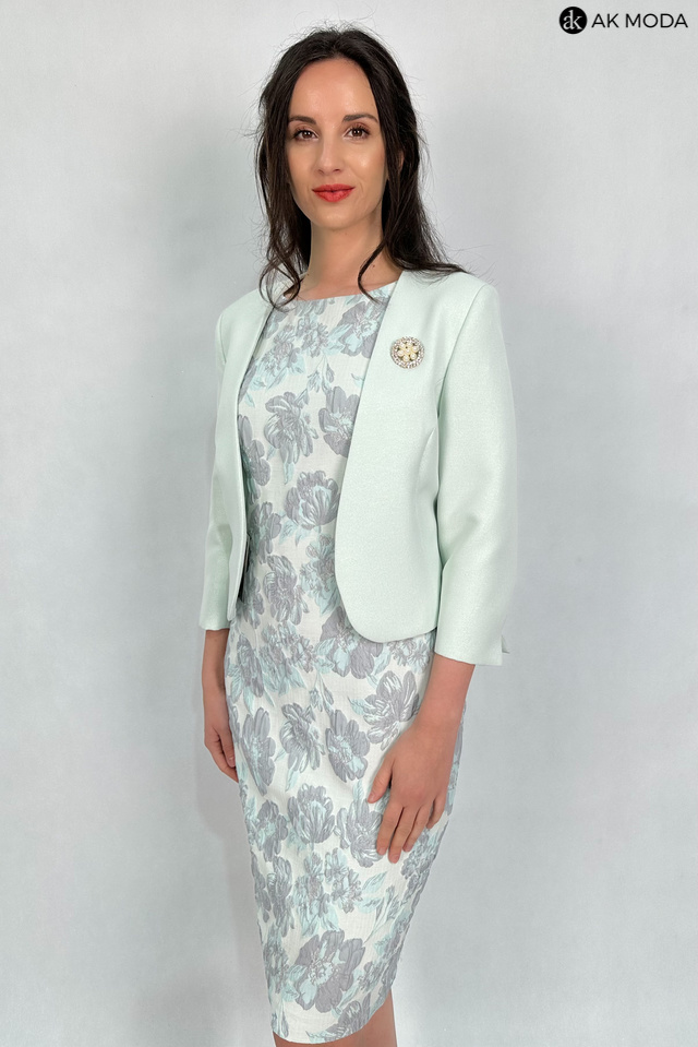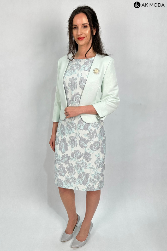 Elegancki komplet damski, składający się z prostej sukienki z okrągłym dekoltem oraz żakietu z rękawami 3/4. Sukienka miętowo-szara z tłoczonym kwiatowym wzorem, żakiet miętowy ze srebrną nitką. Przy żakiecie odpinana ozdobna broszka.