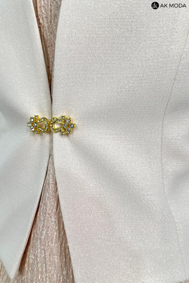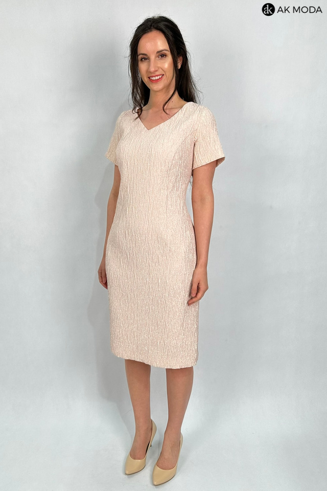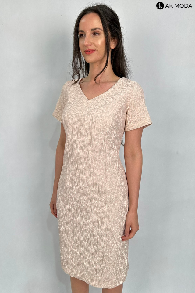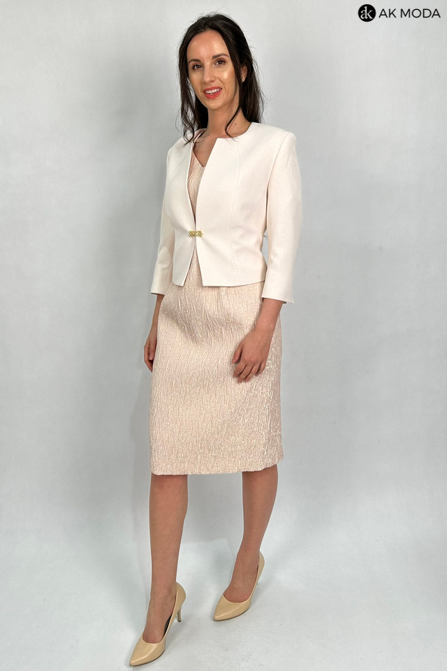 Elegancki komplet damski w kolorze różowym, składający się z prostej sukienki z dekoltem w szpic oraz żakietu z rękawami 3/4. Sukienka uszyta z wytłaczanego, błyszczącego materiału. Żakiet - gładki z delikatnym połyskiem. Przy żakiecie odpinany ozdobny kwiatek.