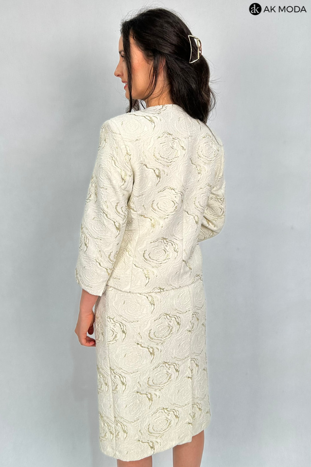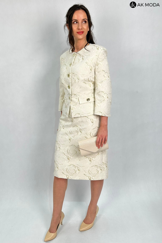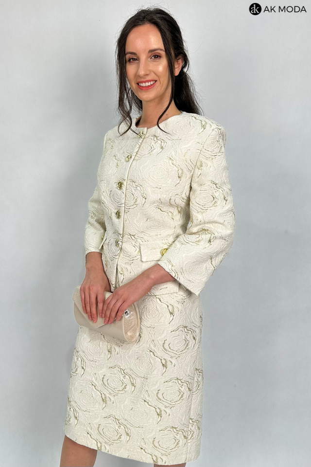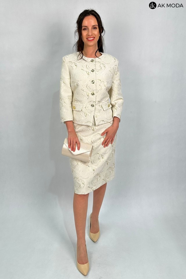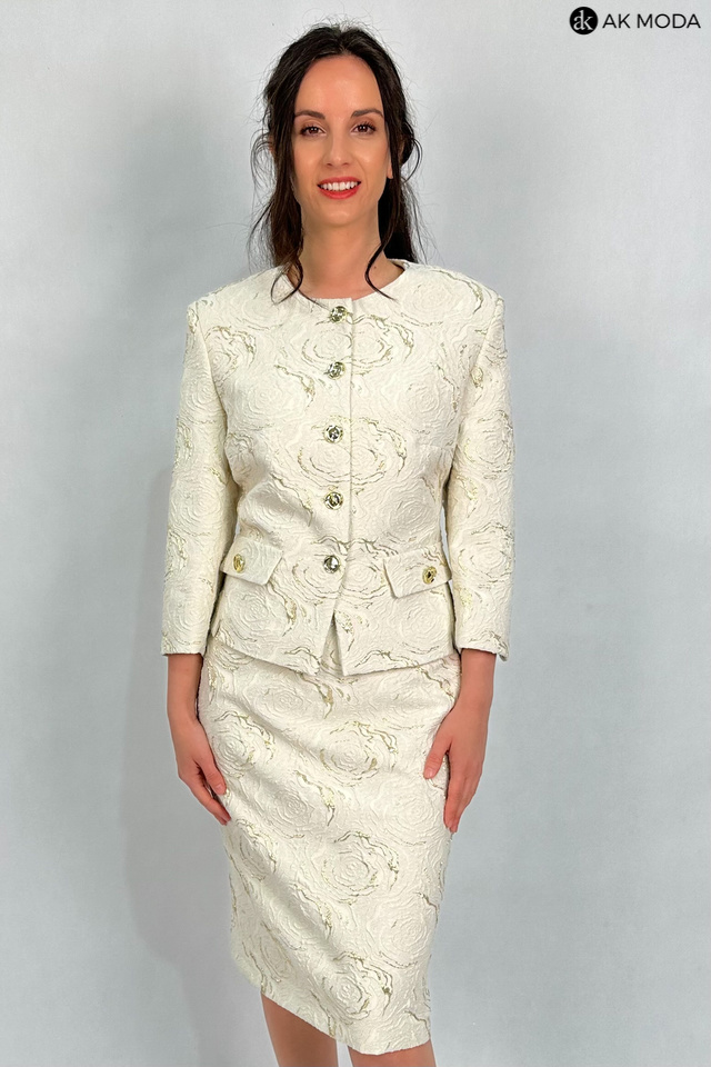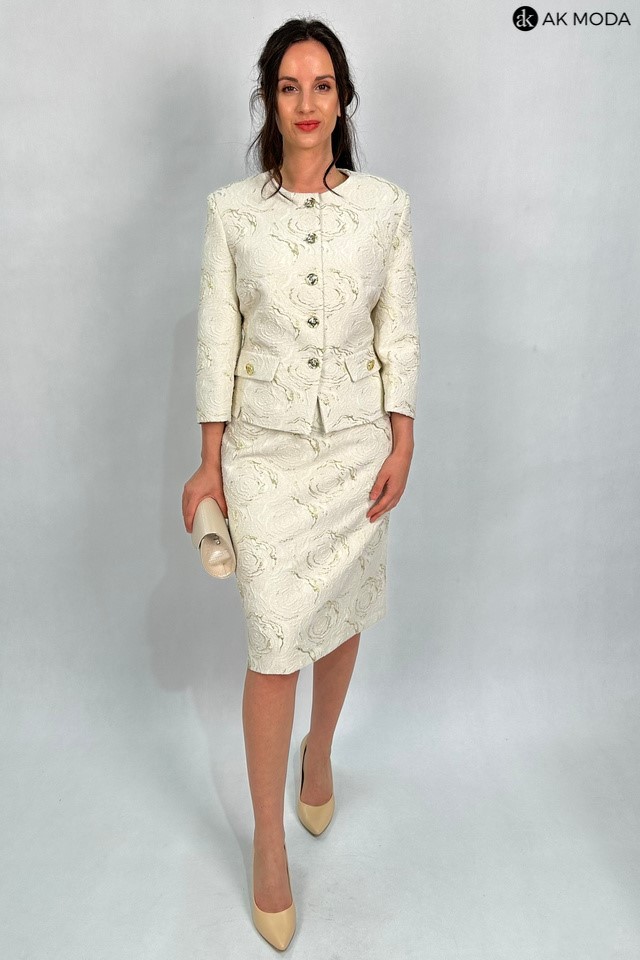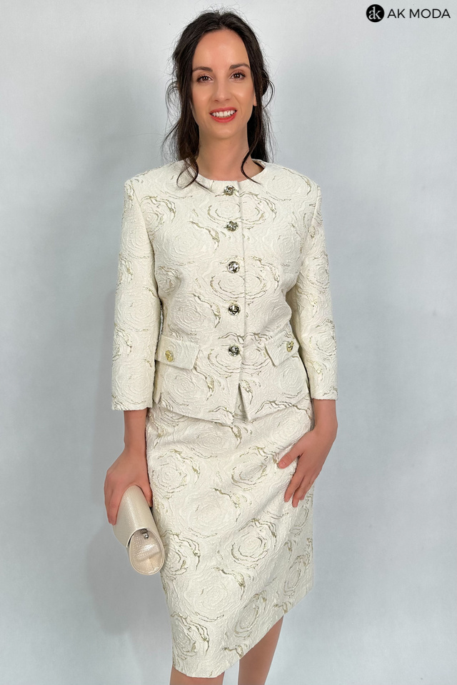 Elegancki komplet damski w kolorze beżowym ze złotymi zdobieniami, uszyty z wytłaczanego materiału.W skład zestawu wchodzi prosta spódnica oraz żakiet typu chanelka.