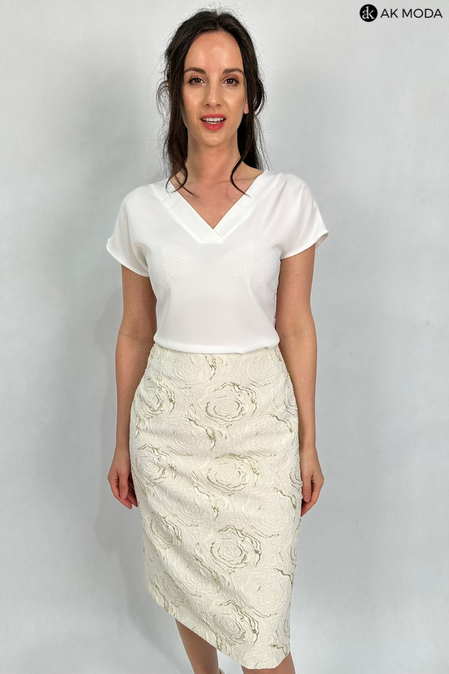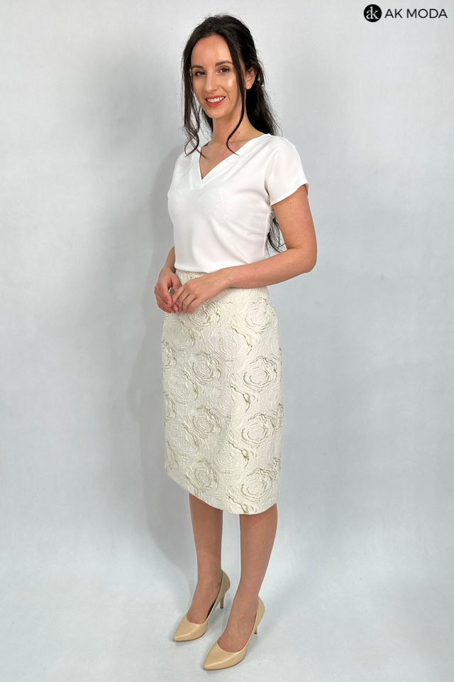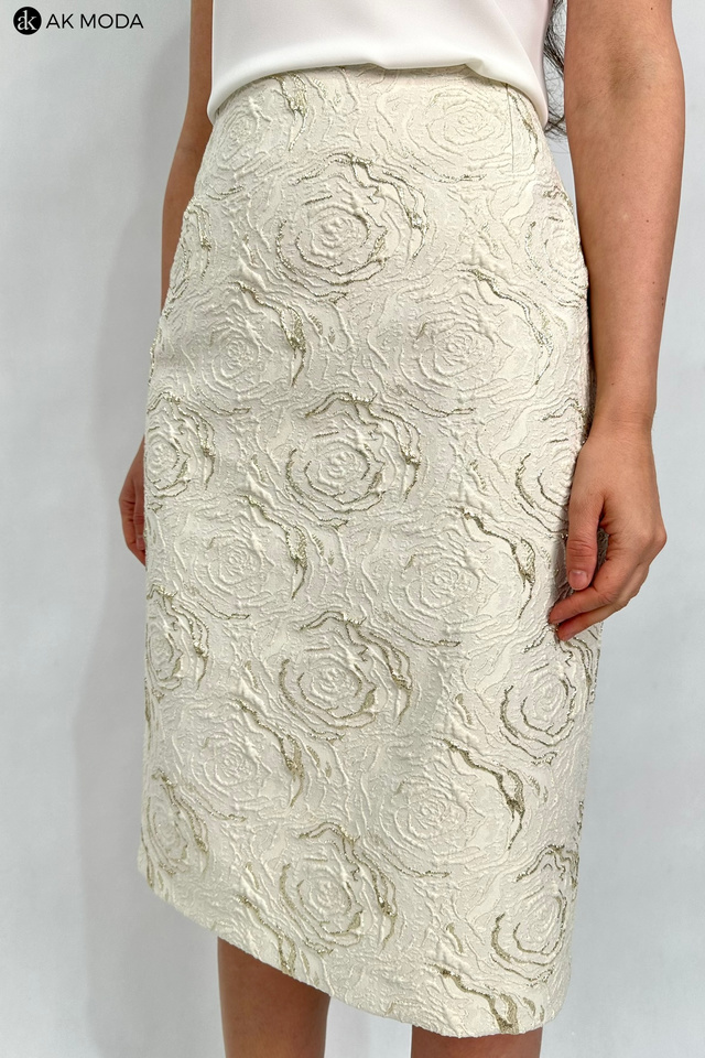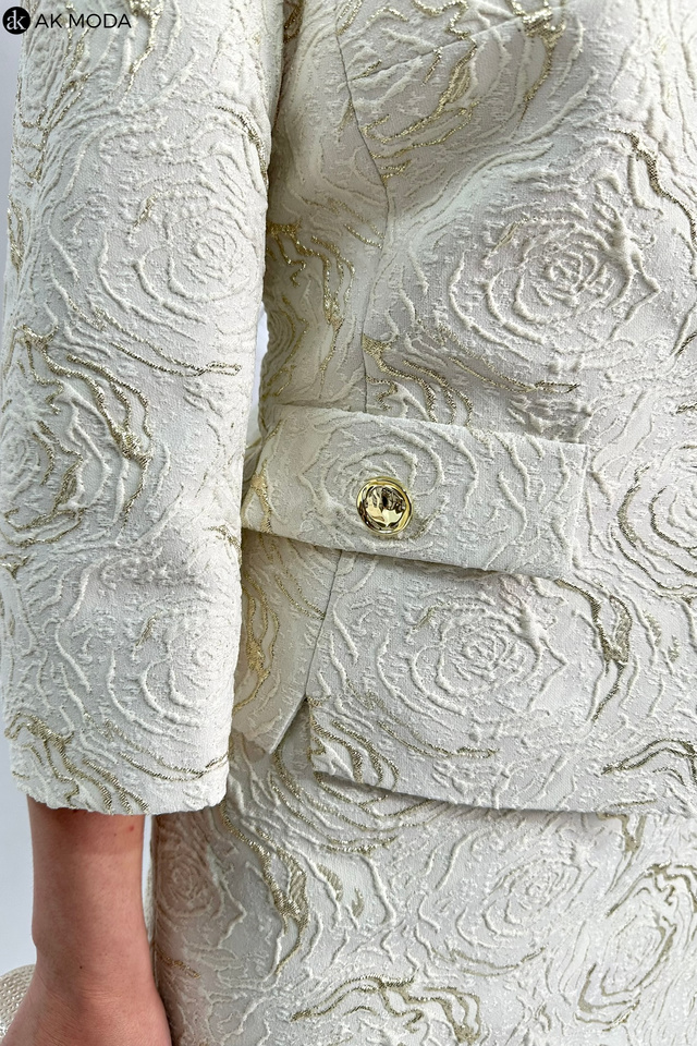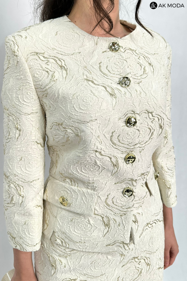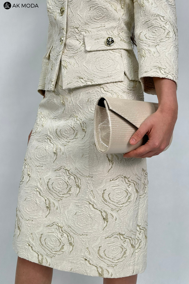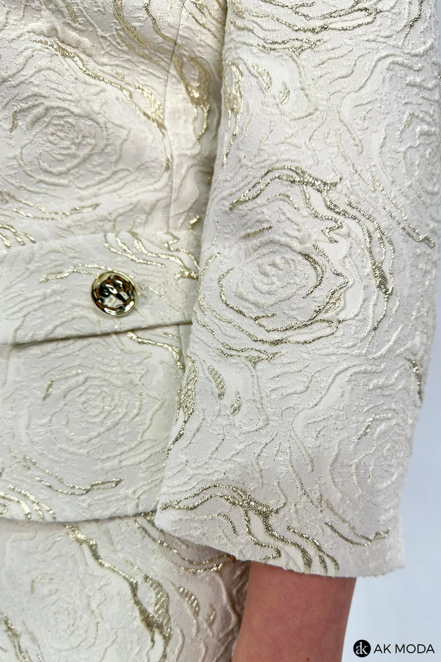 Elegancki komplet damski w kolorze beżowym ze złotymi zdobieniami, uszyty z wytłaczanego materiału.W skład zestawu wchodzi prosta spódnica oraz żakiet typu chanelka.
