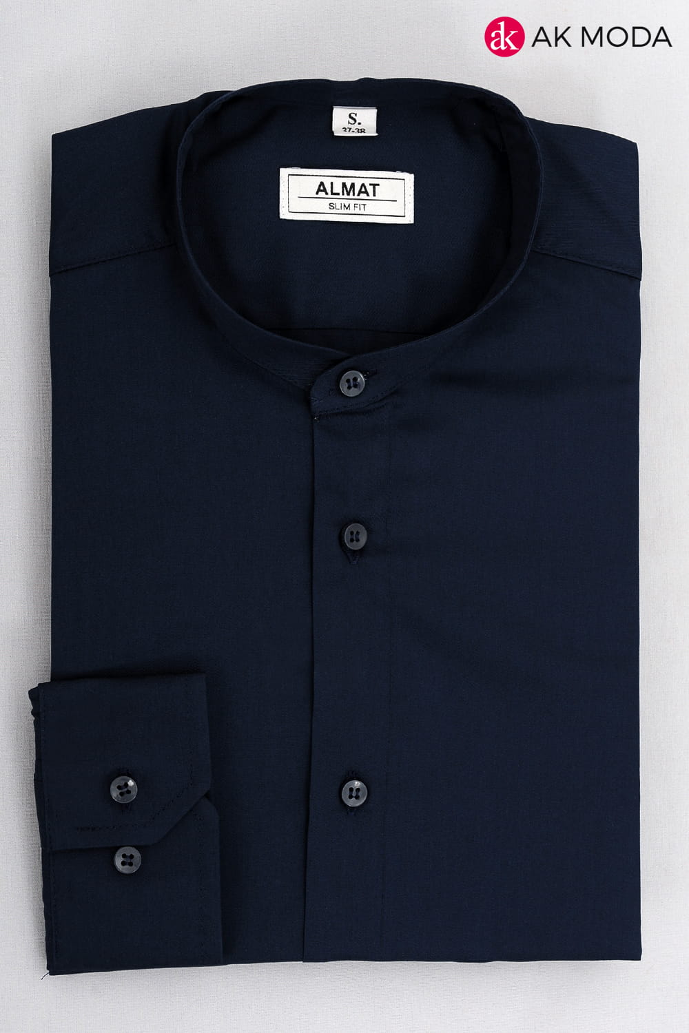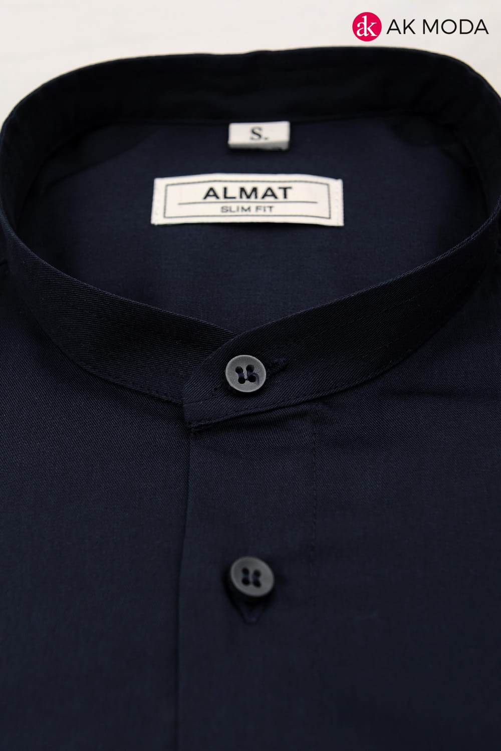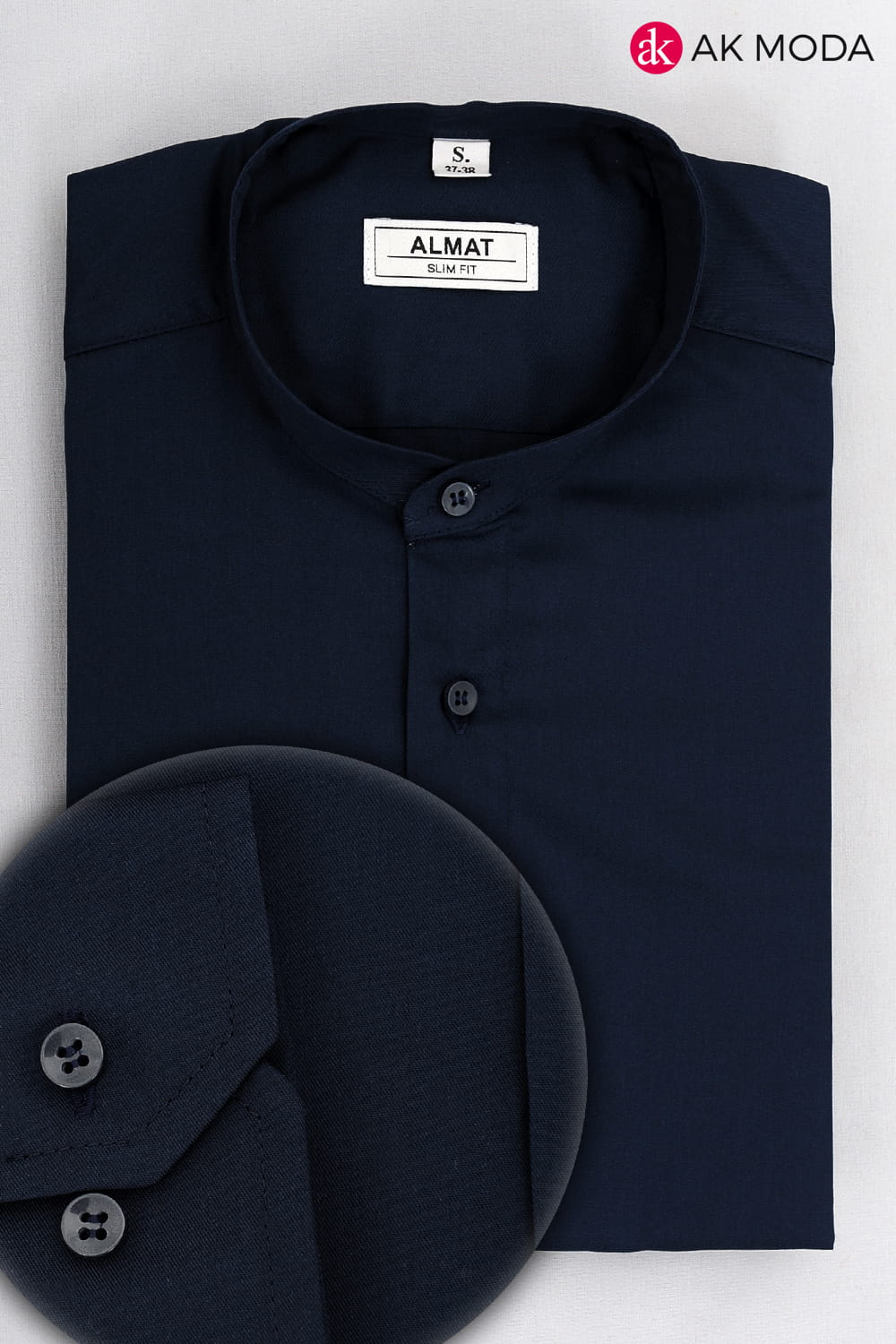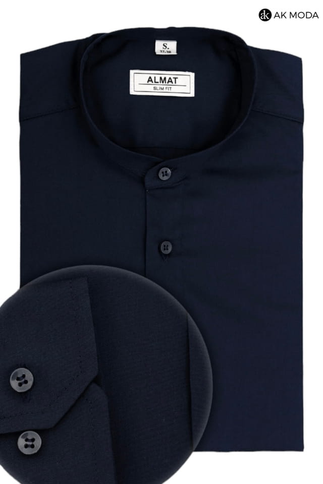 Granatowa, taliowana koszula męska ze stójką i długim rękawem.