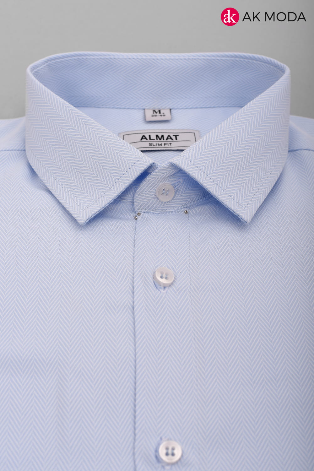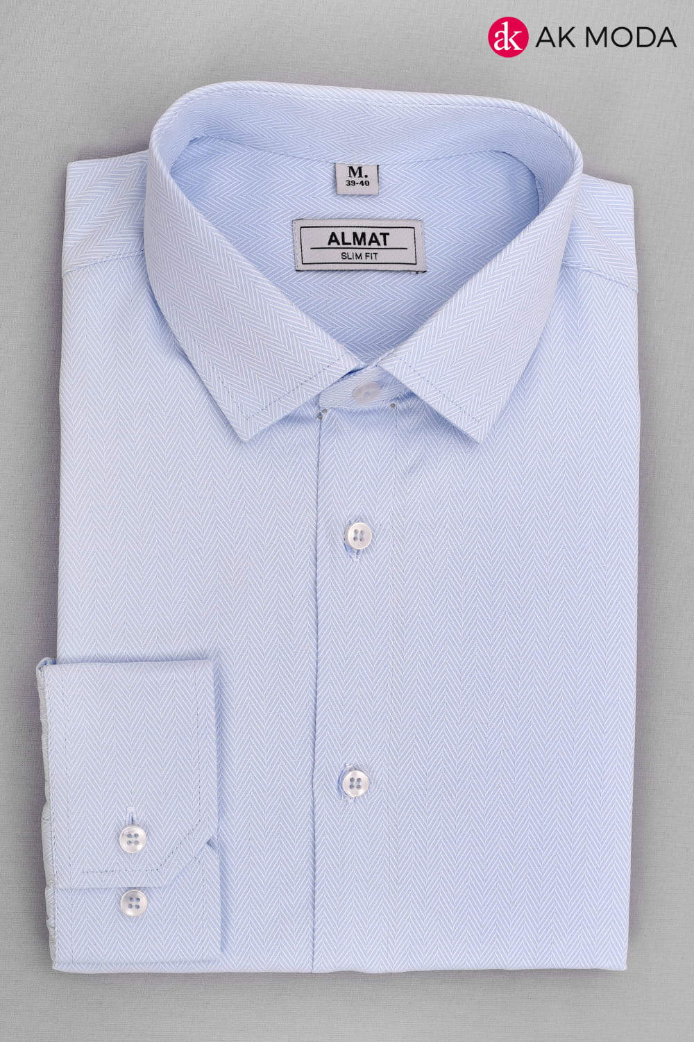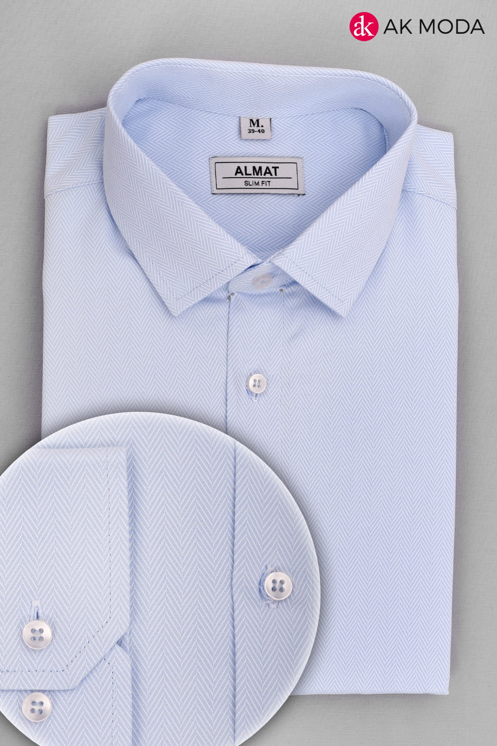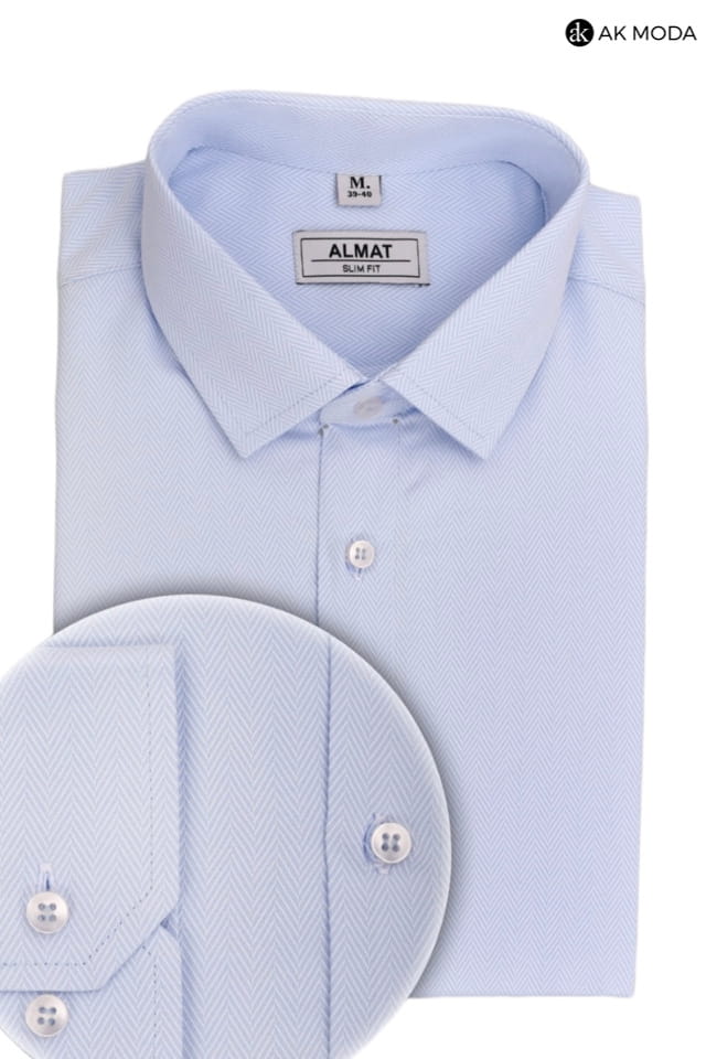 Taliowana koszula męska w kolorze błękitnym w strukturalny wzór jodełki z długim rękawem.