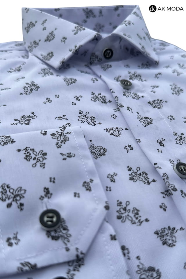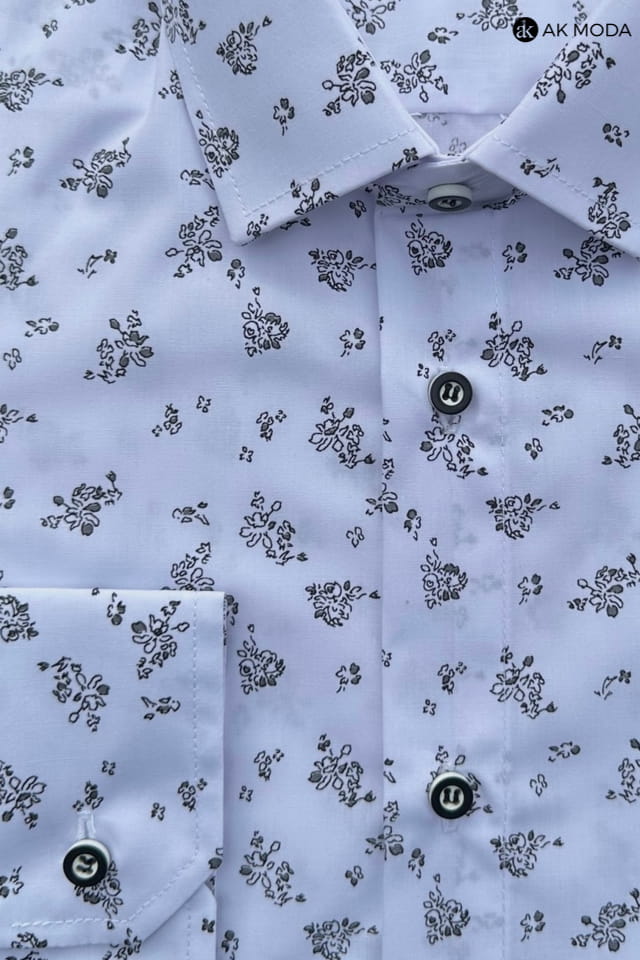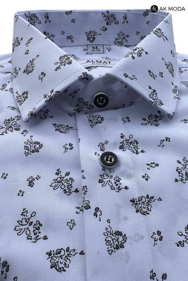 Koszula męska slim fit, niebieska z czarnym wzorkiem, z długim rękawem.