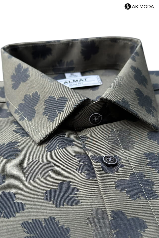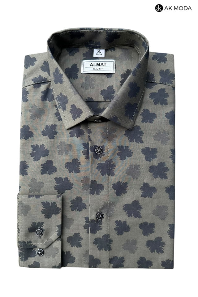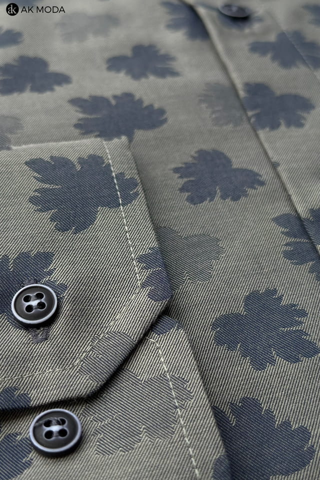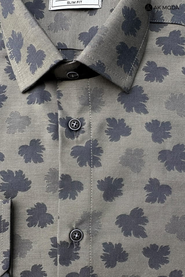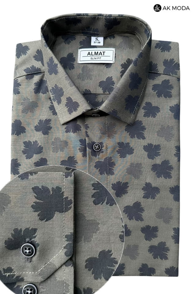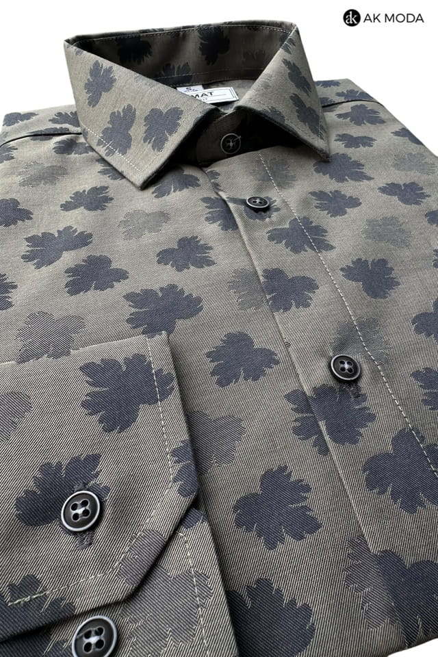 Taliowana koszula męska z długim rękawem, w kolorze grafitowym, w granatowe listki.
