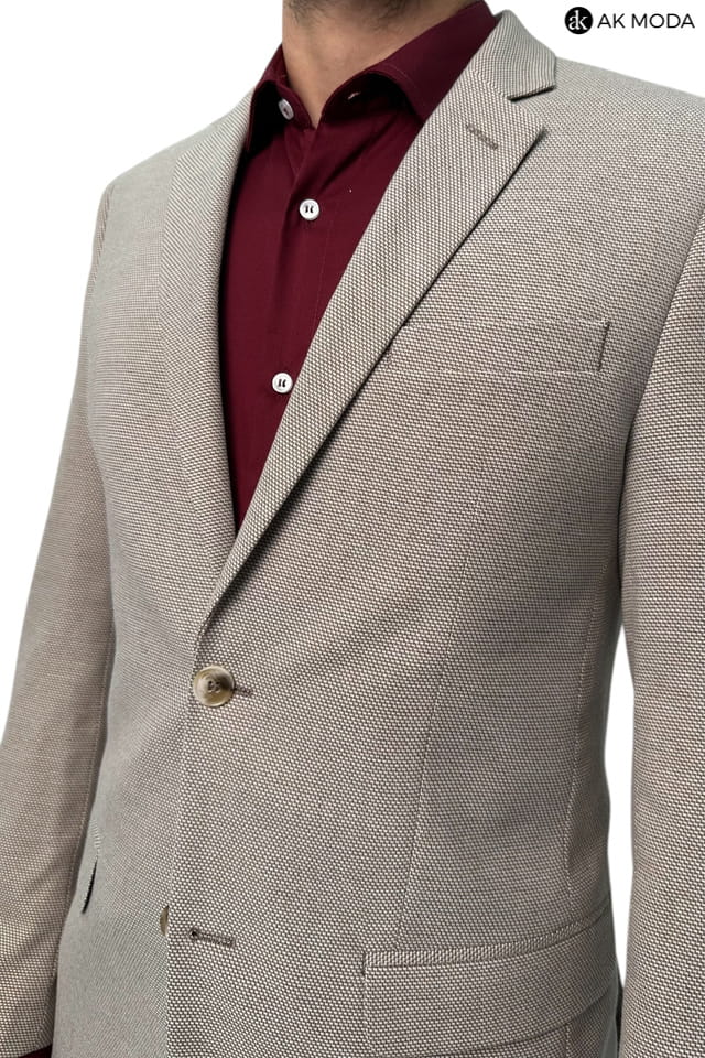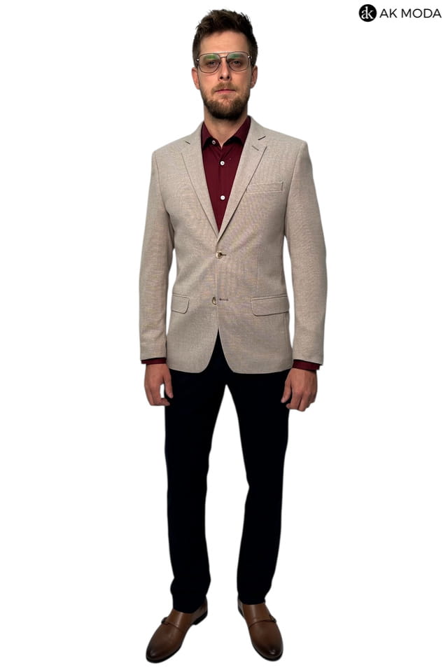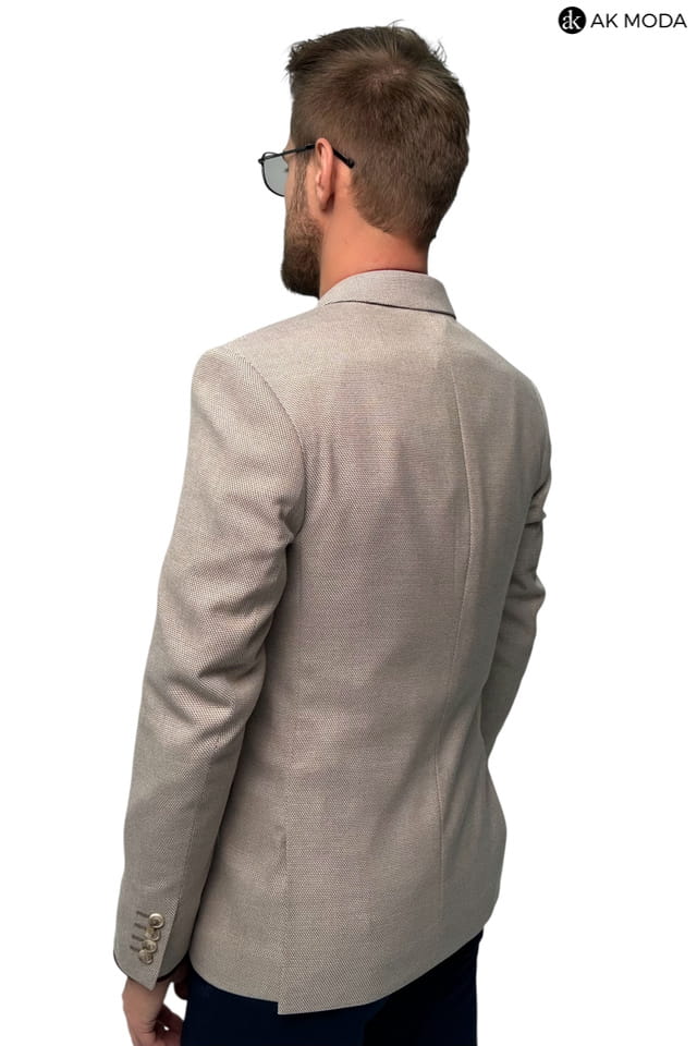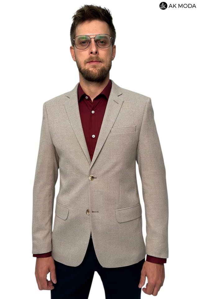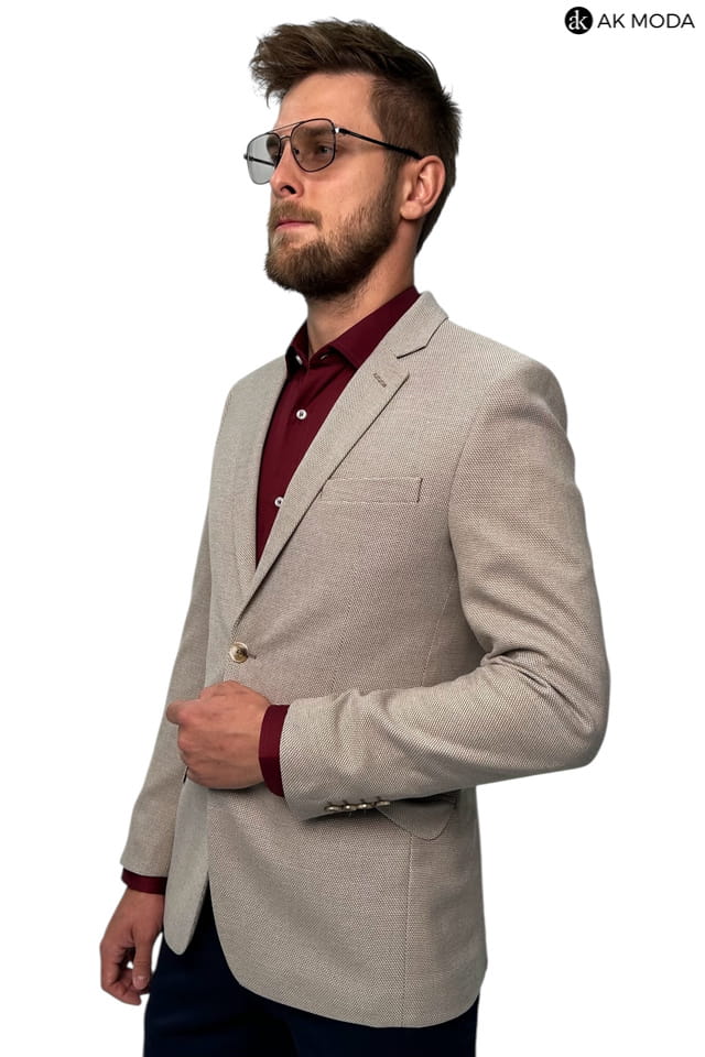 Elegancka beżowa marynarka, uszyta z fakturowanego materiału. Model jednorzędowy, zapinany na 2 guziki. Z tyłu dwa rozcięcia.