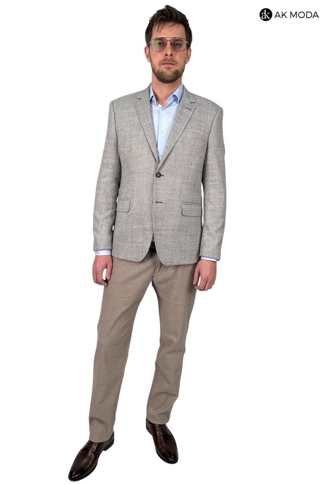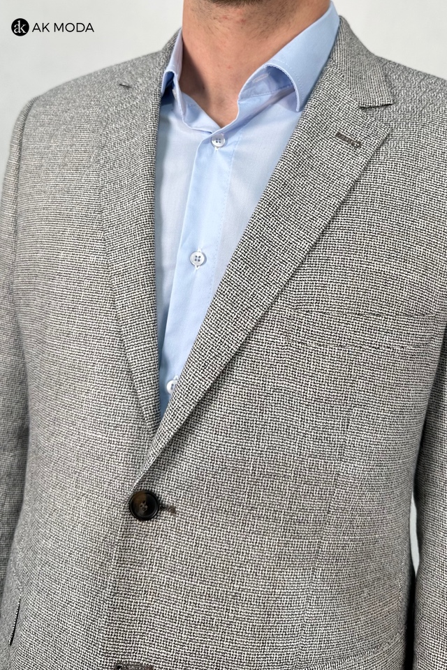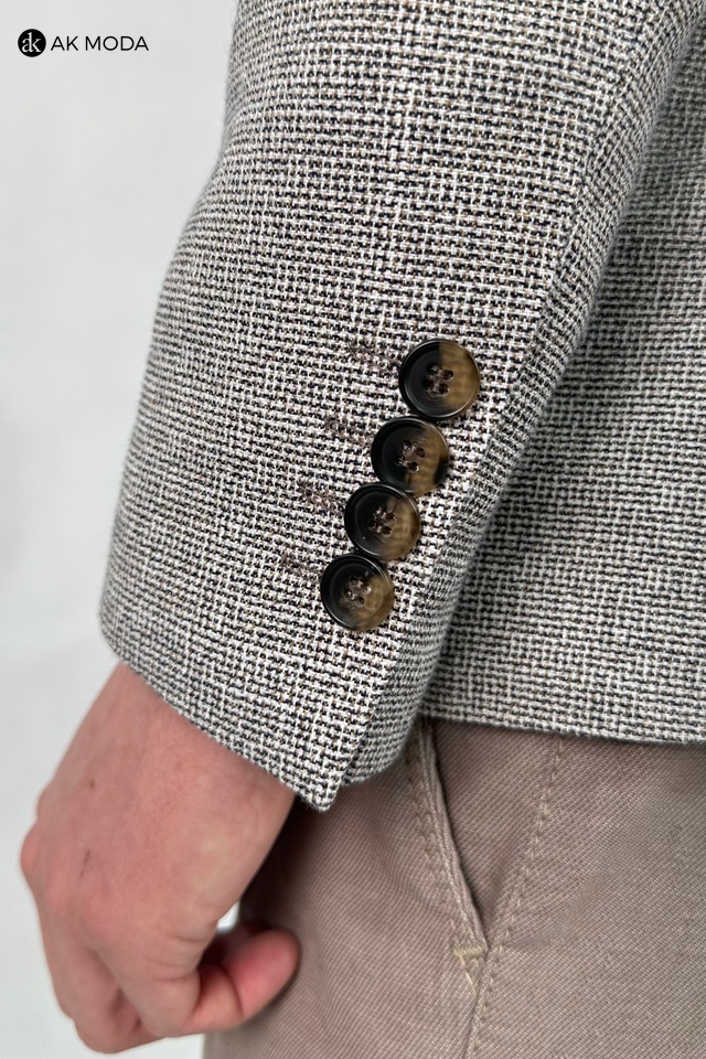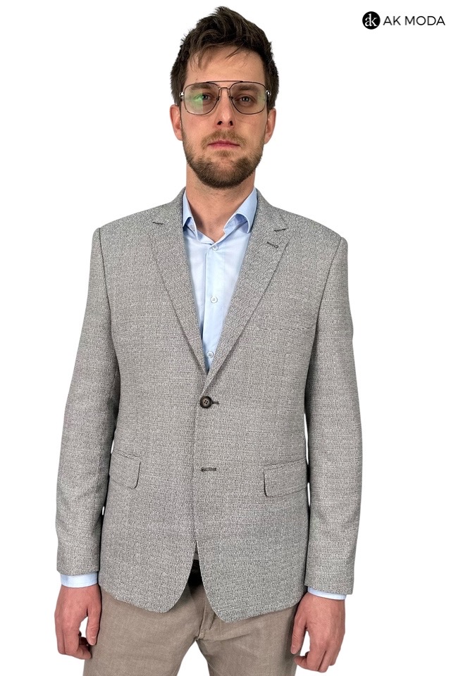 Elegancka marynarka w kolorze czarno-brązowym, uszyta z fakturowanego materiału . Model jednorzędowy, zapinany na 2 guziki. Z tyłu dwa rozcięcia.