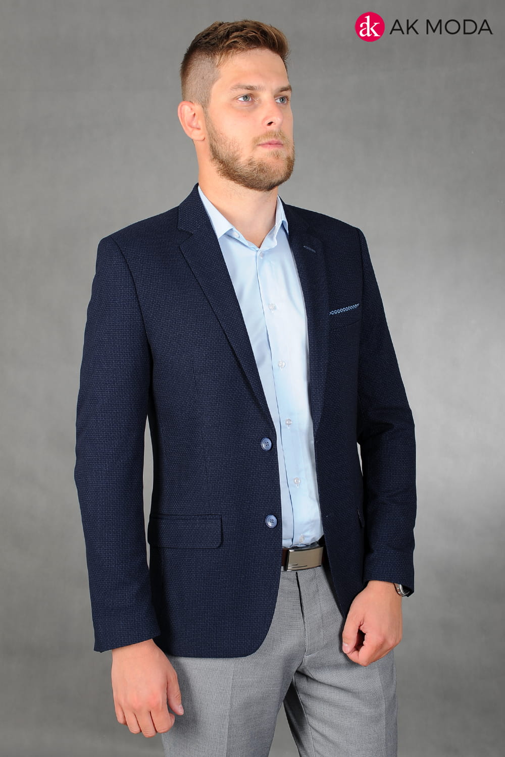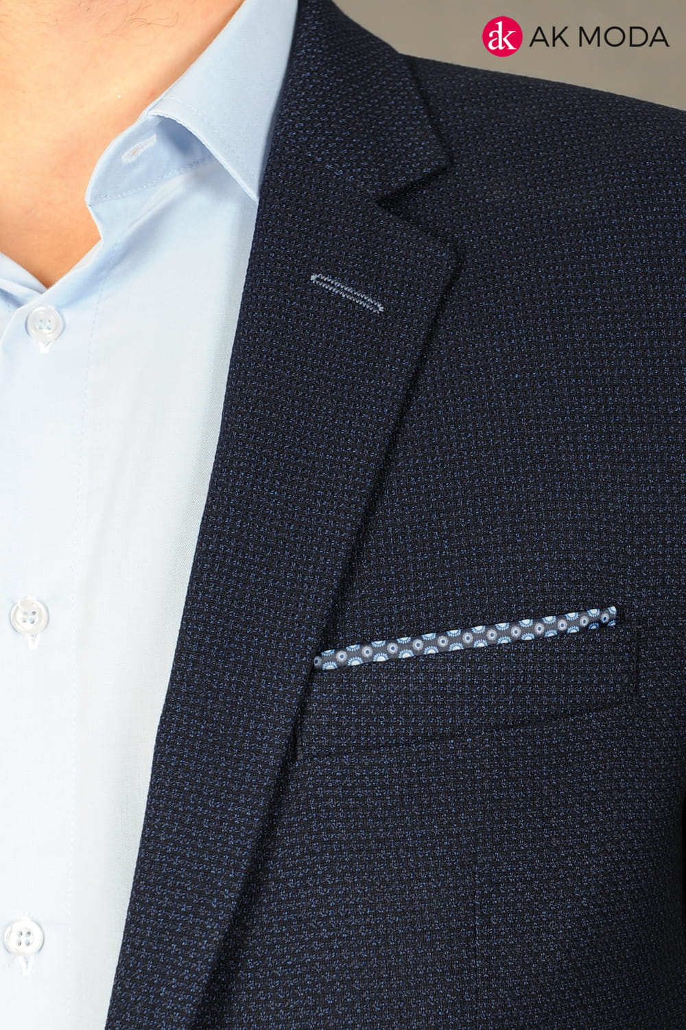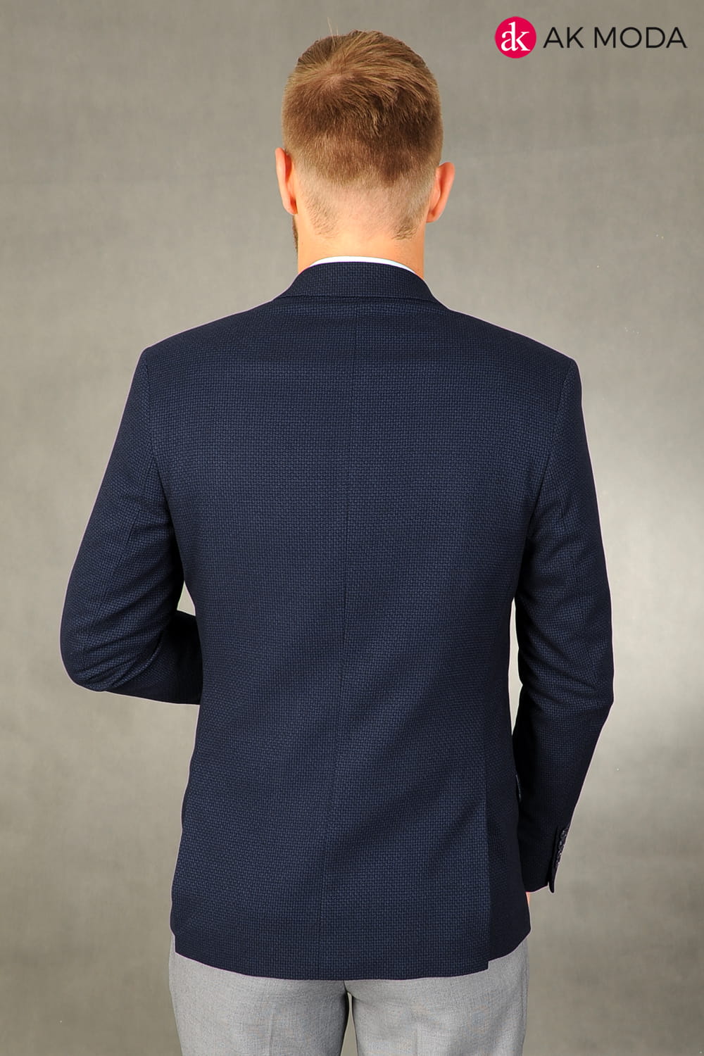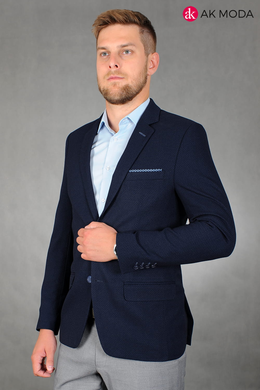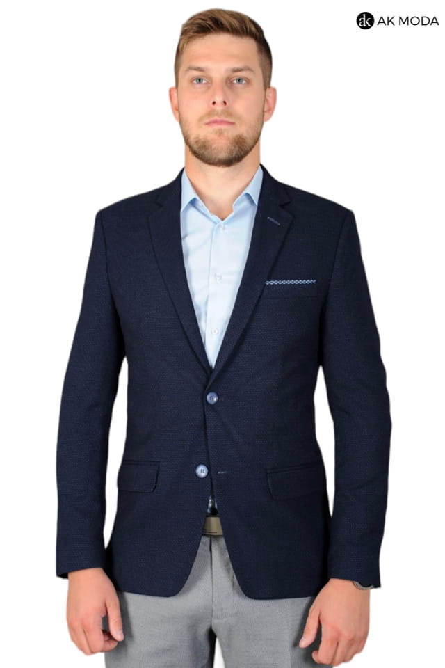 Granatowa marynarka męska uszyta z fakturowanego materiału.