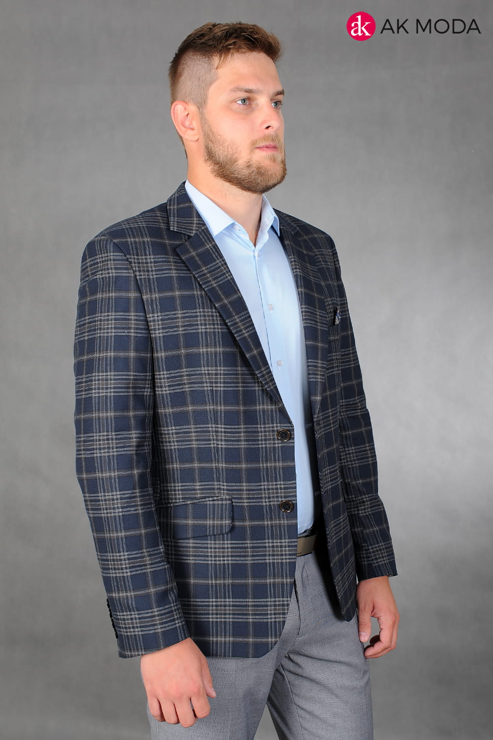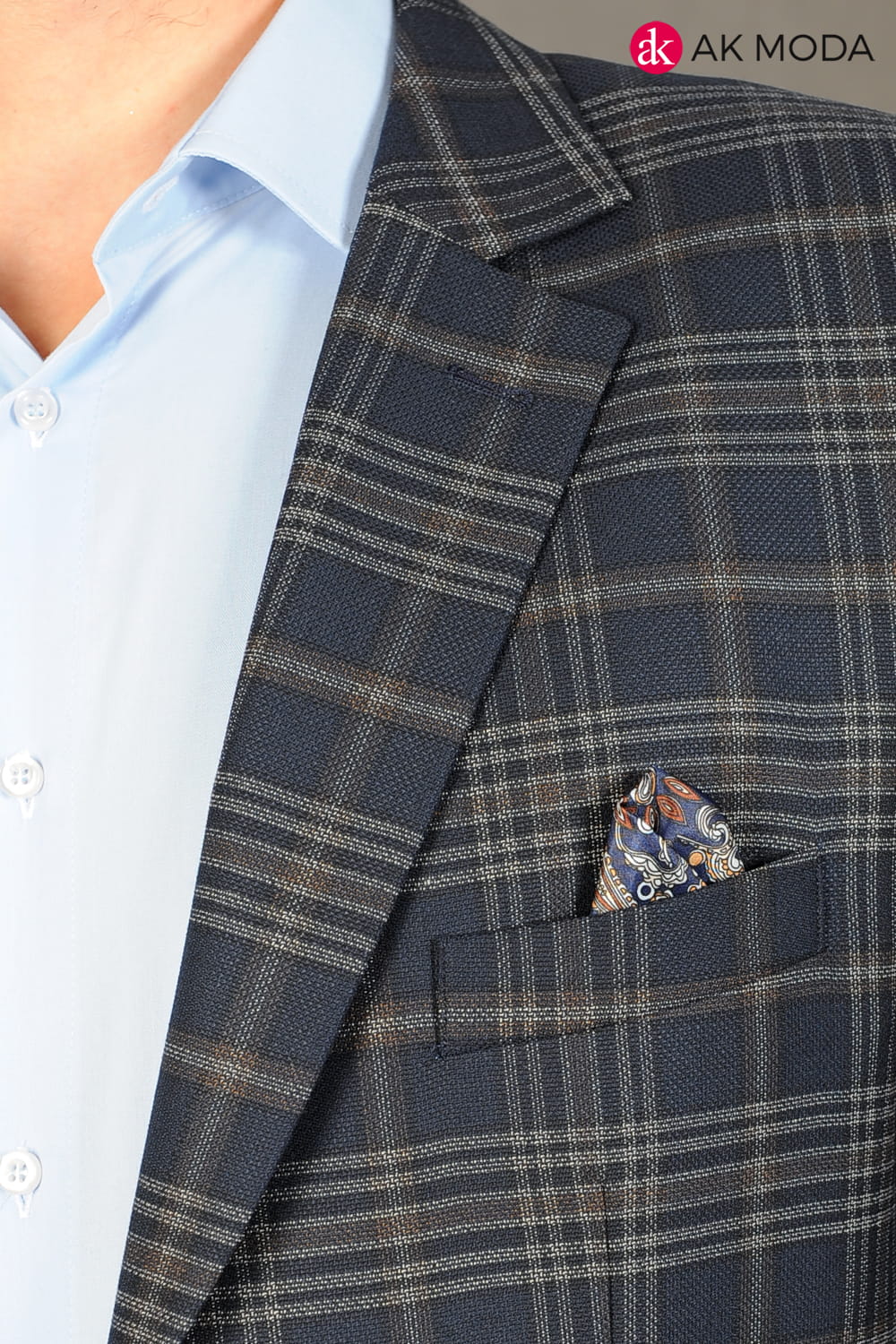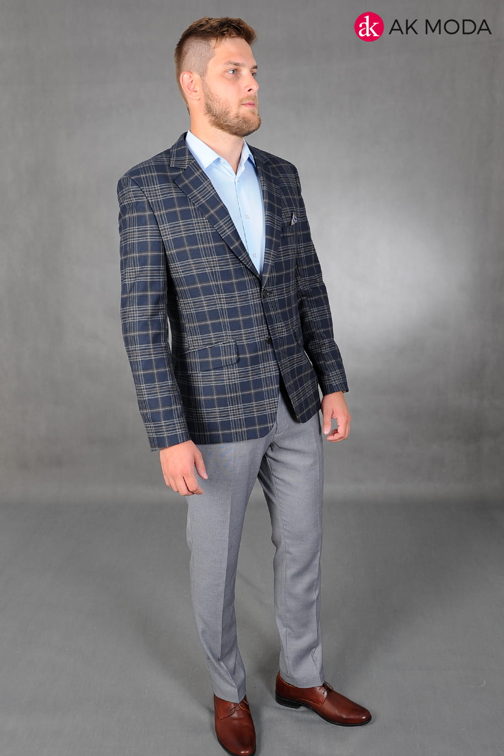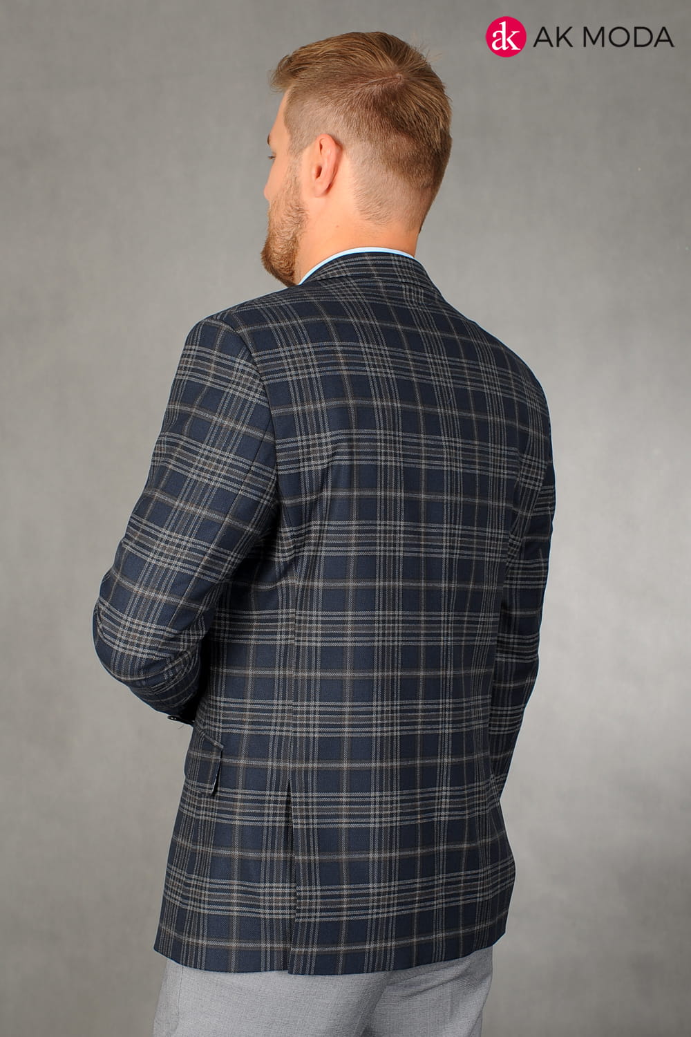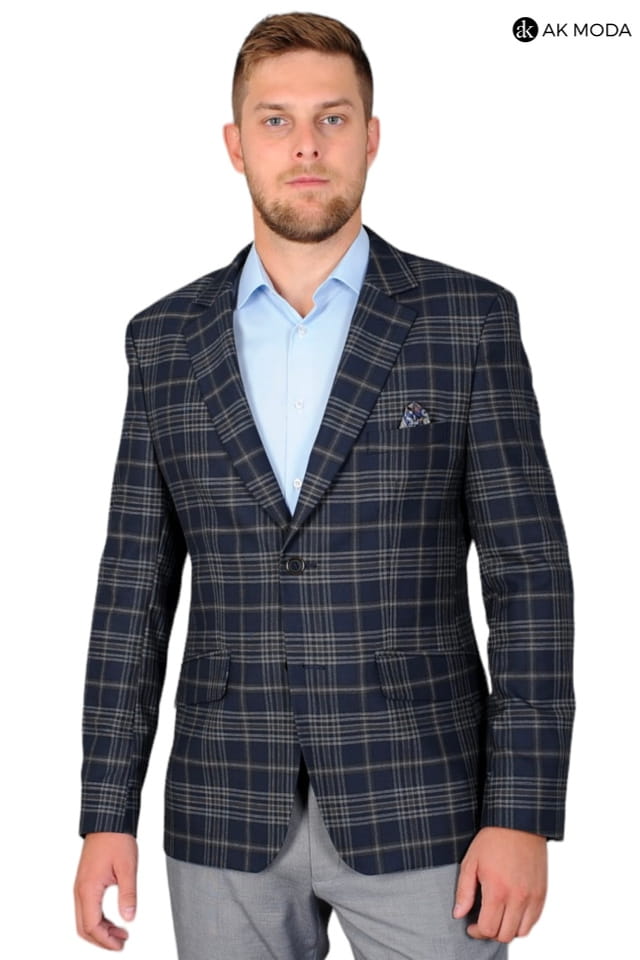 Ciemnogranatowa marynarka męska w brązowo - beżową kratę.