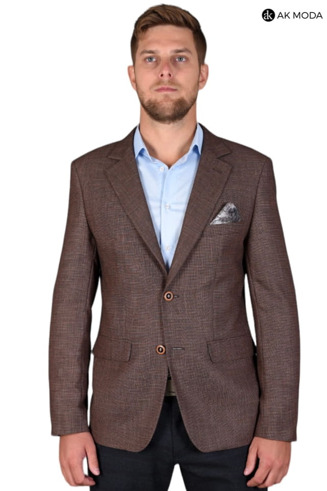 Brązowa marynarka męska uszyta z fakturowanego materiału.