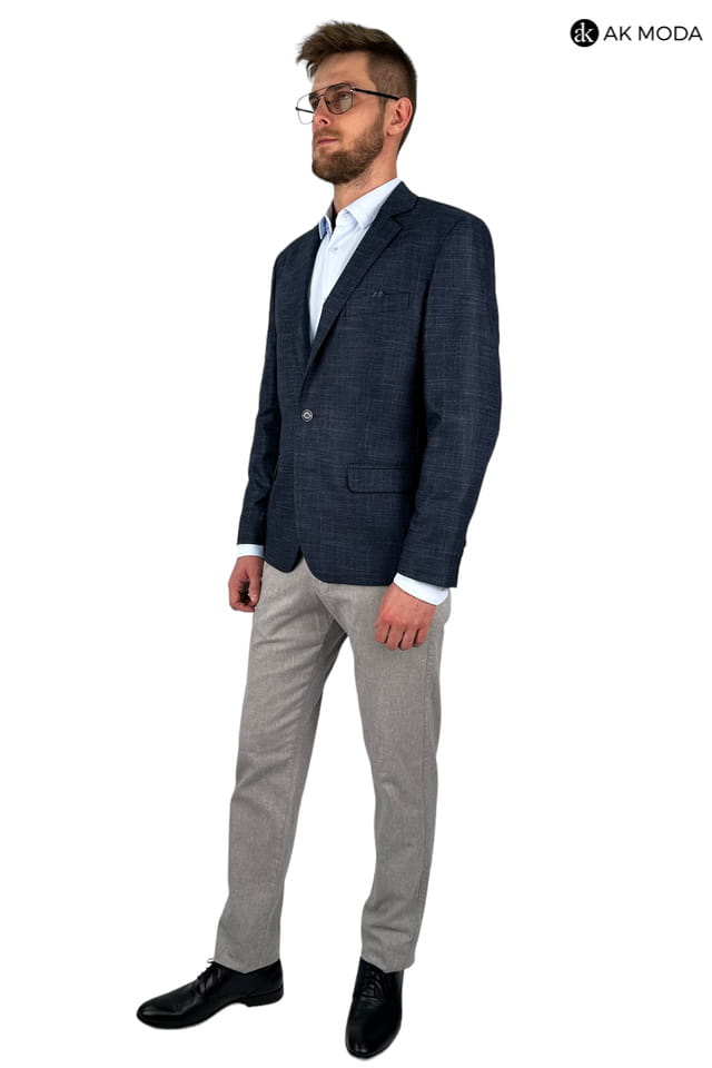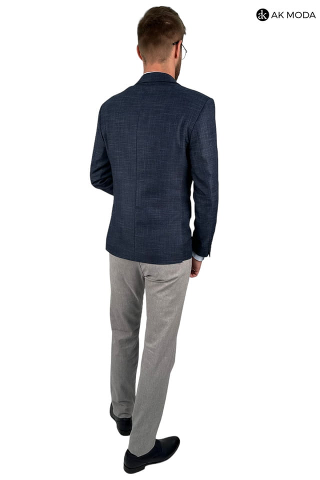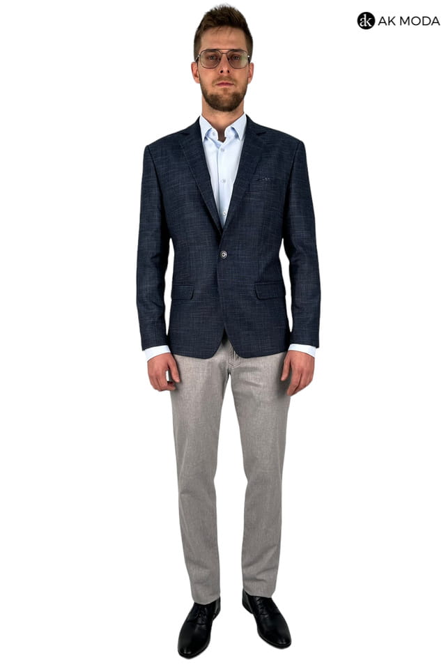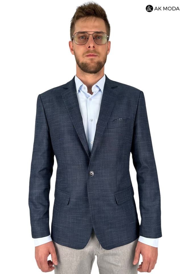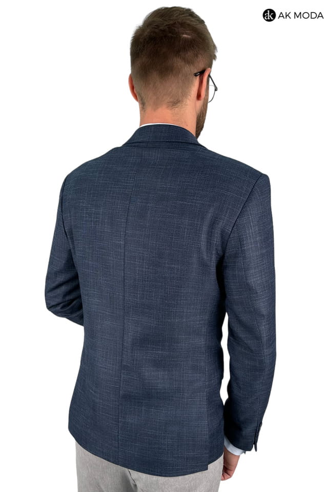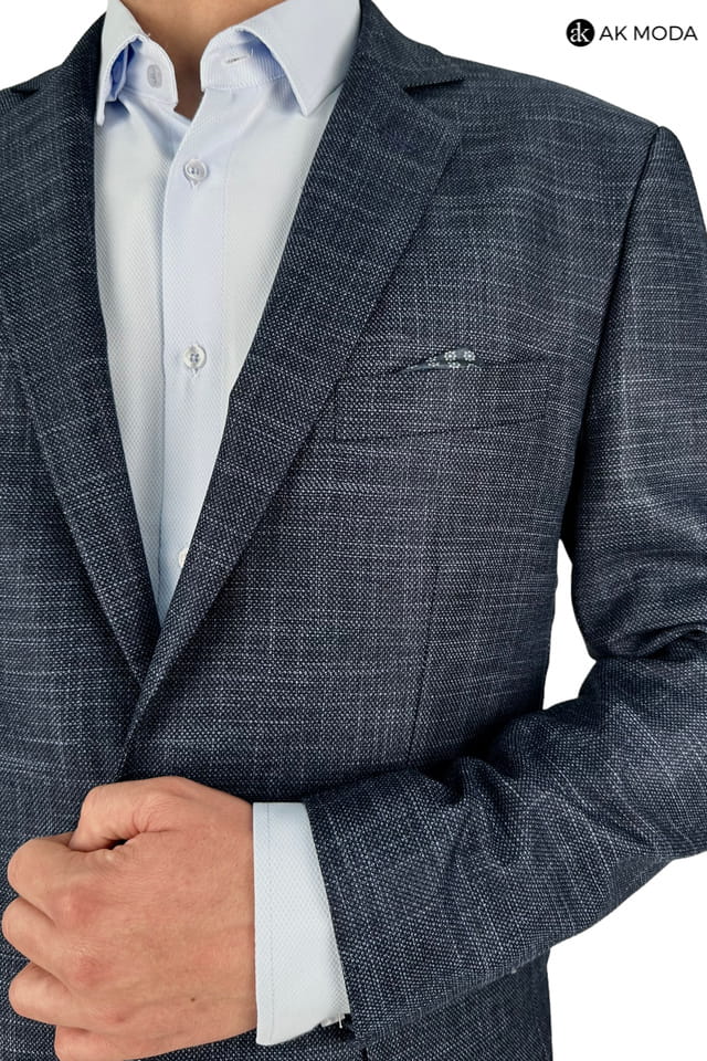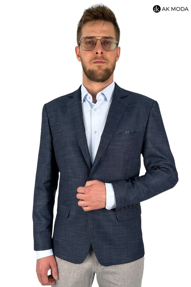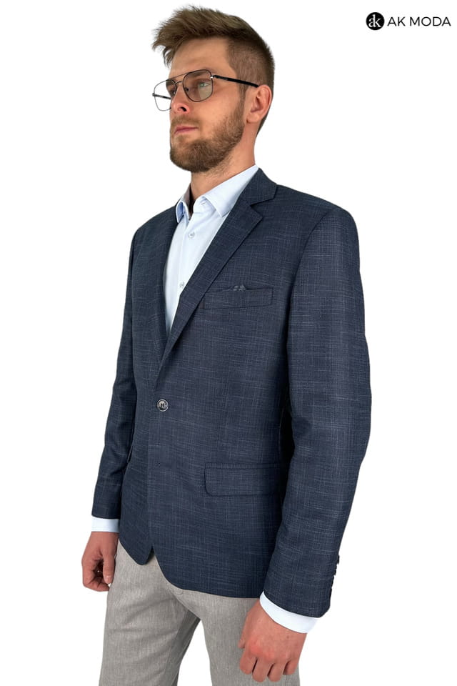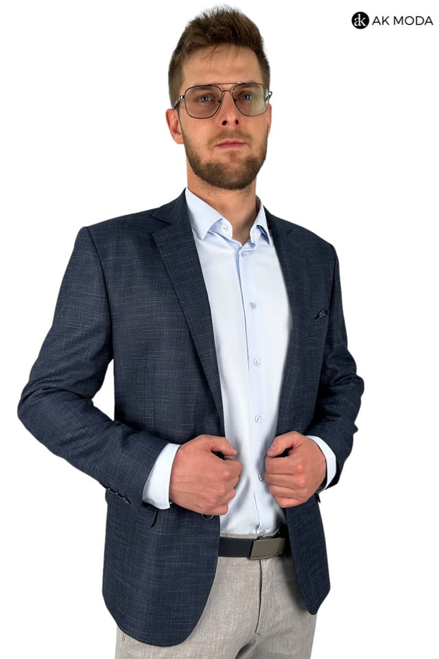 Granatowa marynarka męska uszyta z fakturowanego materiału.