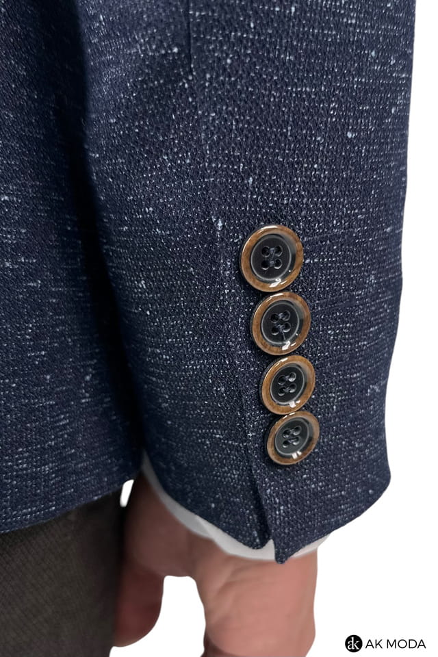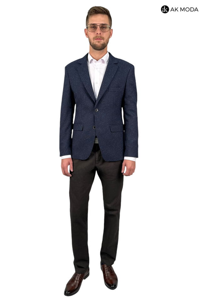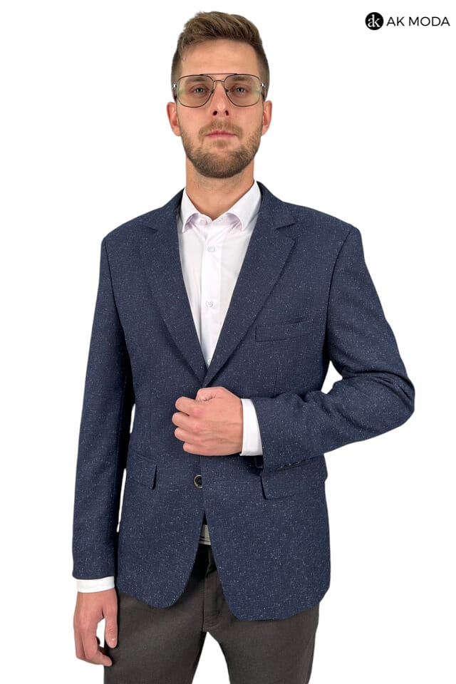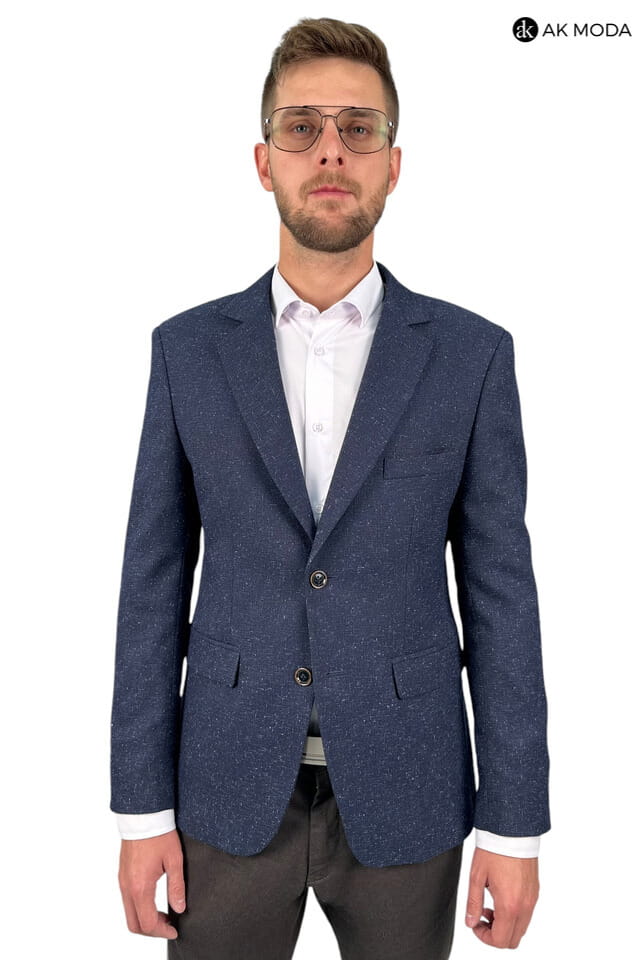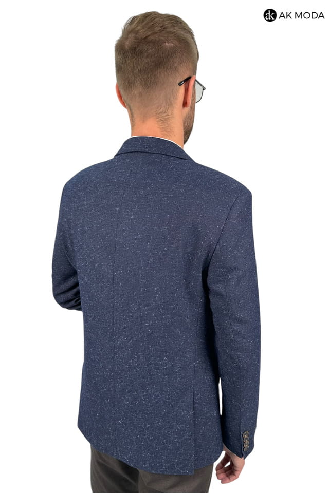 Marynarka męska w kolorze granatowym z niebieskimi akcentami, uszyta z fakturowanego matriału.