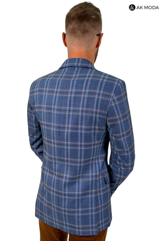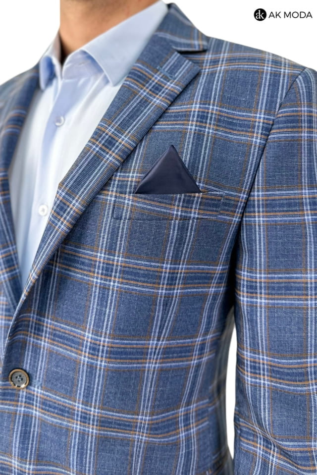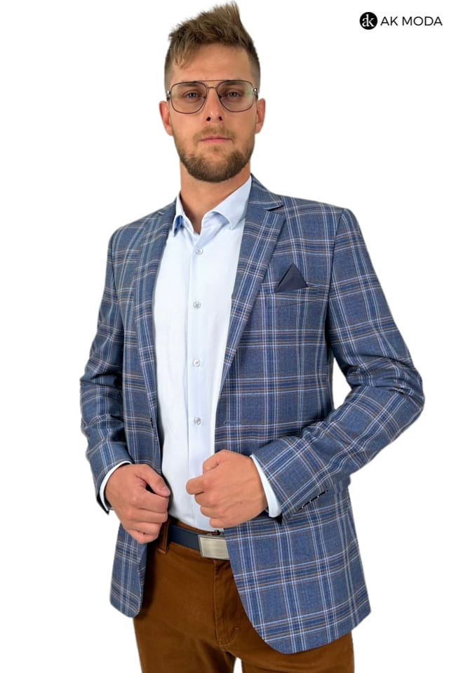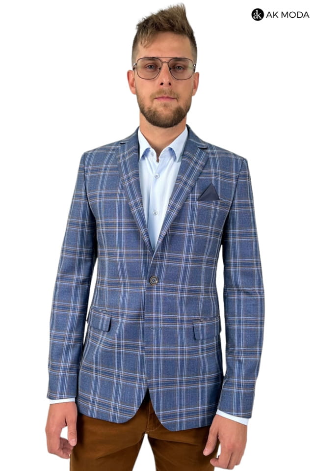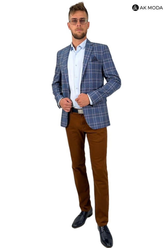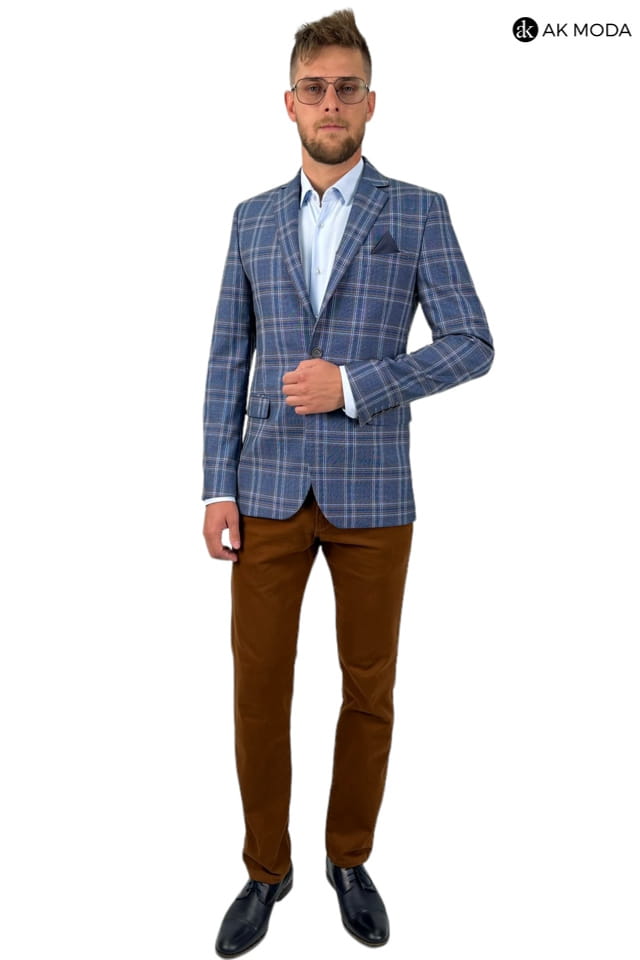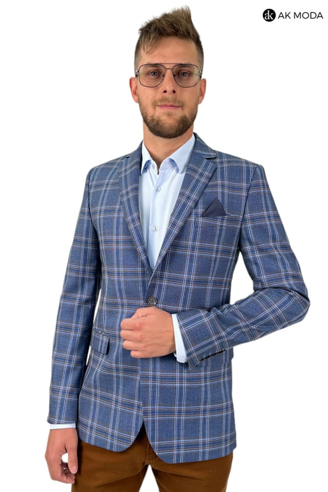 Marynarka męska w kolorze niebieskim w brązową kratkę.