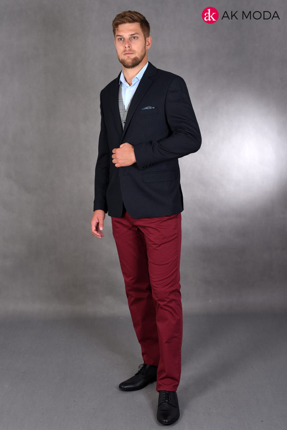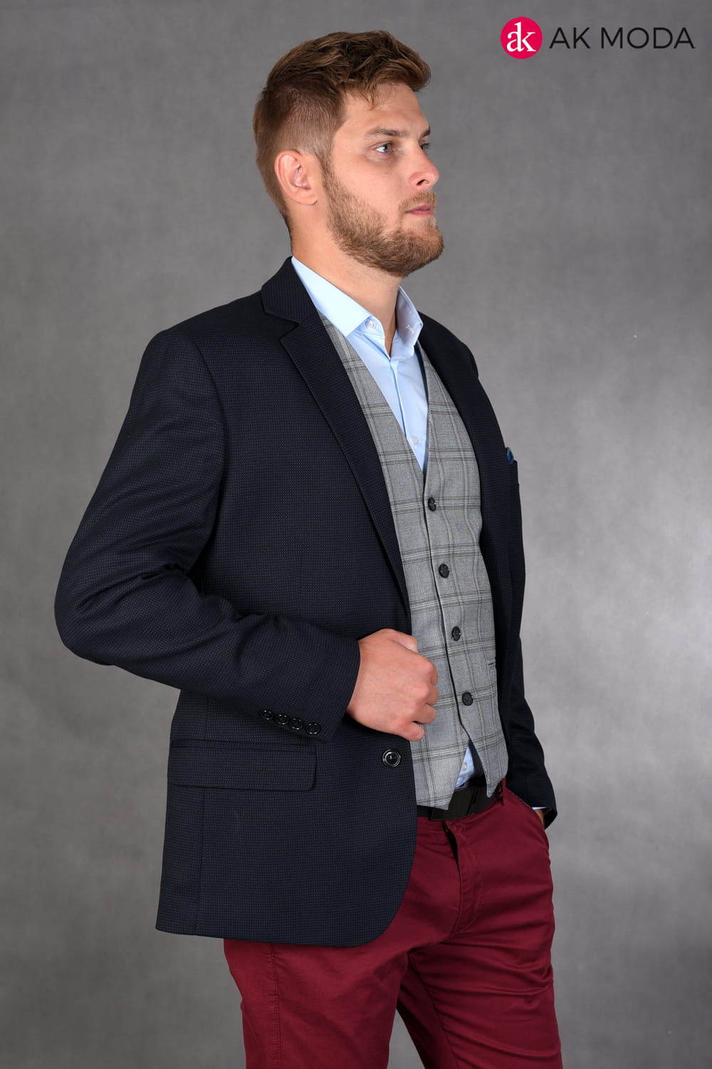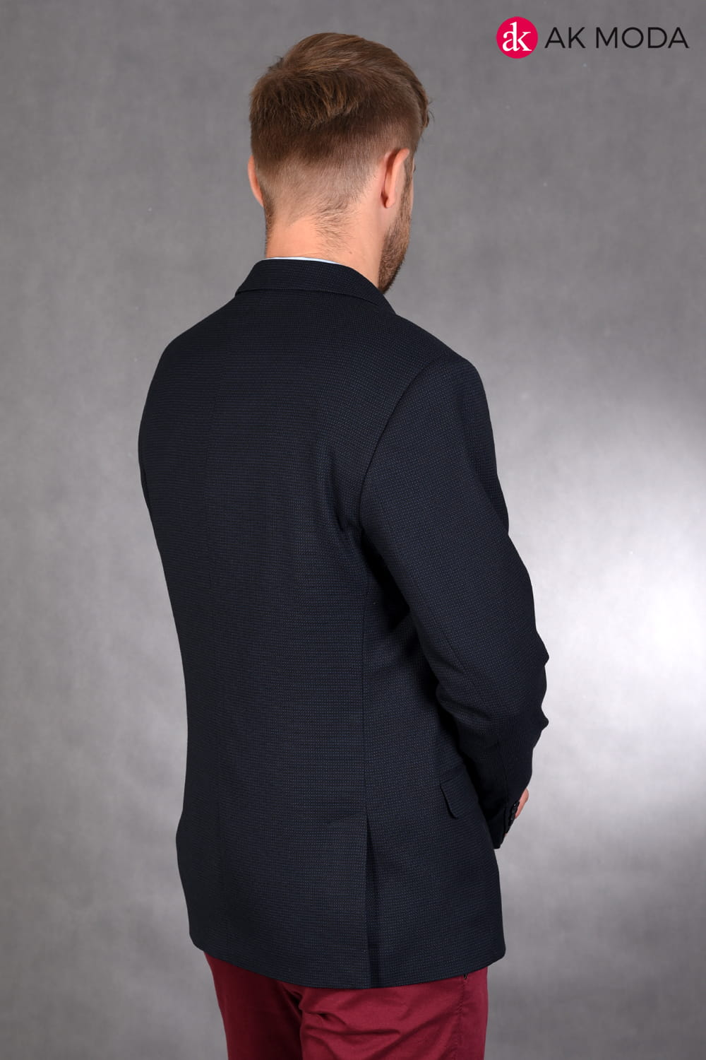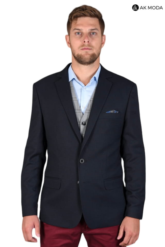 Granatowa marynarka męska w drobny wzorek.