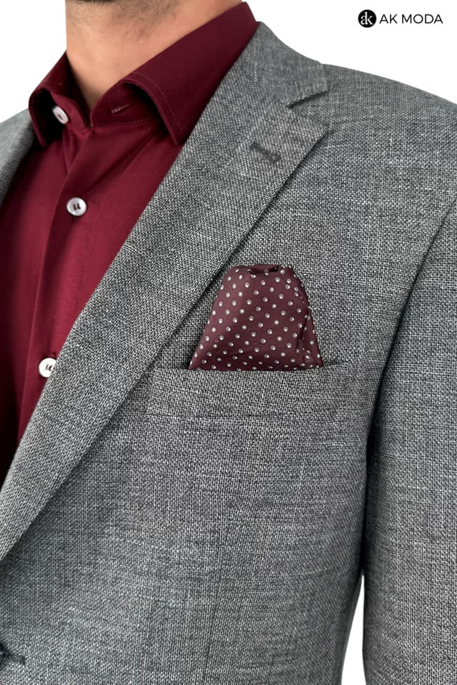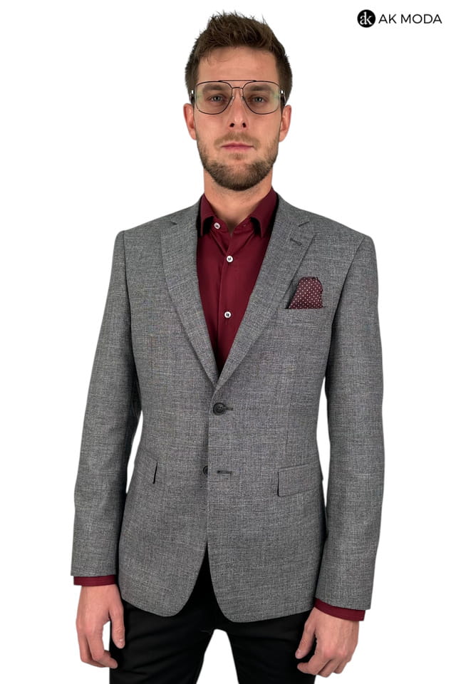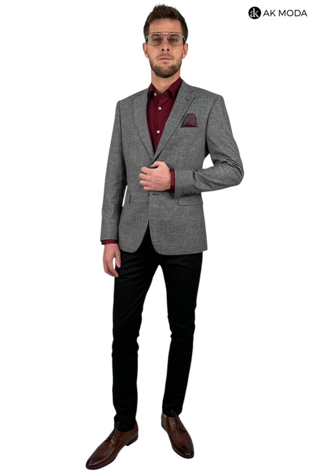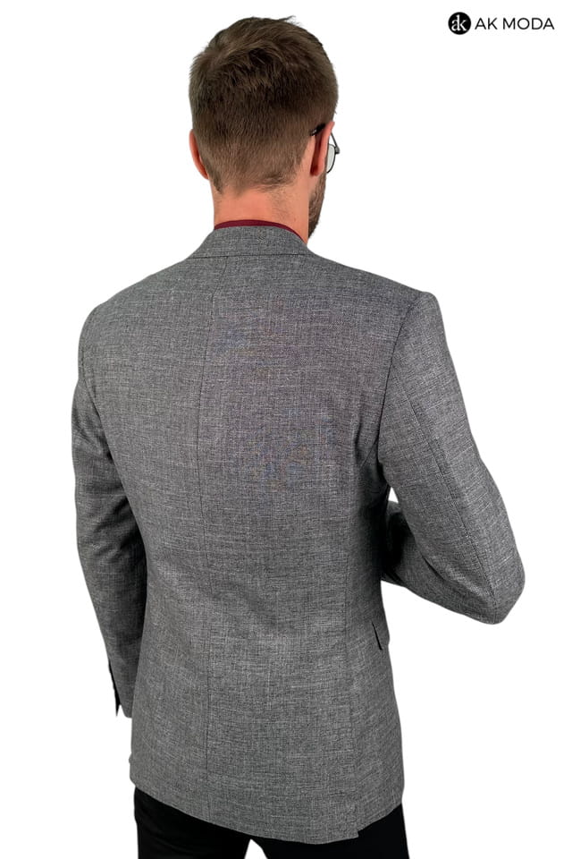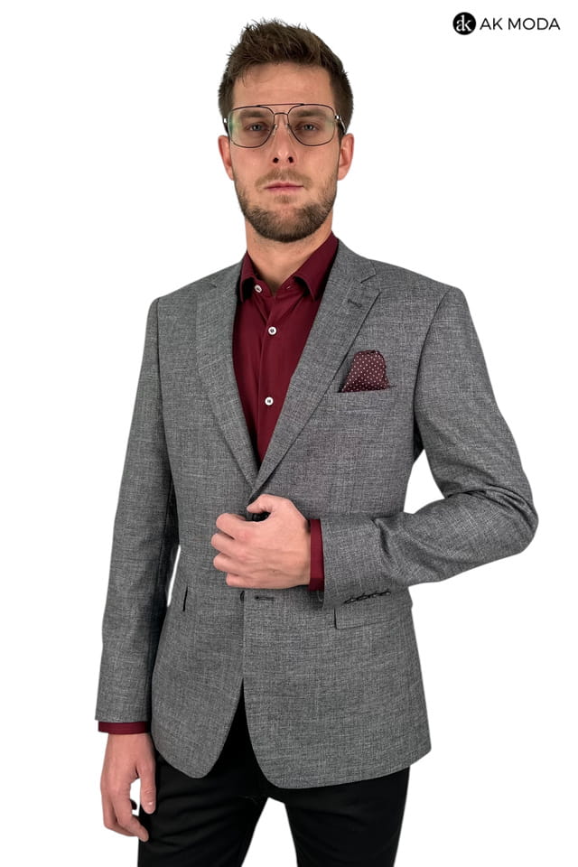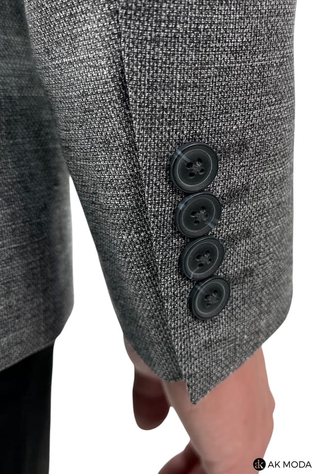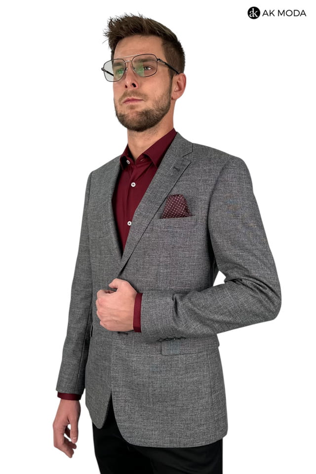 Elegancka, ciemnoszara marynarka, uszyta z fakturowanego materiału. Model jednorzędowy, zapinany na 2 guziki. Z tyłu dwa rozcięcia.
