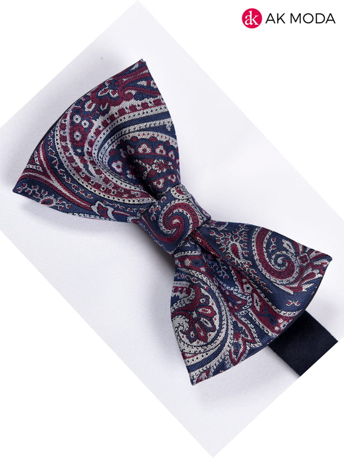 Modna i elegancka granatowa mucha we wzory. Wykonana z dobrej jakości tkaniny. Poszetka w kolorze muszki.