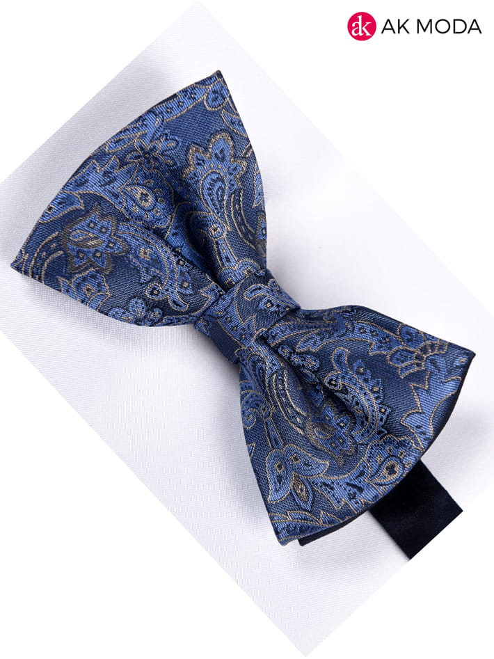 Modna i elegancka granatowa mucha we wzory. Wykonana z dobrej jakości tkaniny. Poszetka w kolorze muszki.