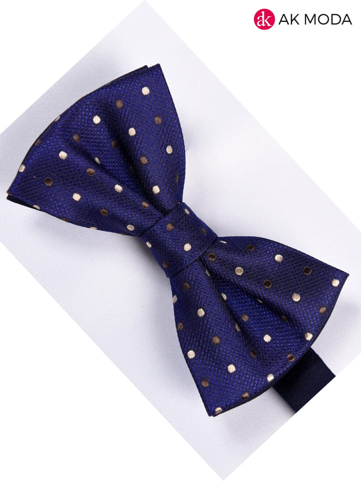 Modna i elegancka granatowa mucha w beżowe groszki. Wykonana z dobrej jakości tkaniny. Poszetka w kolorze muszki.