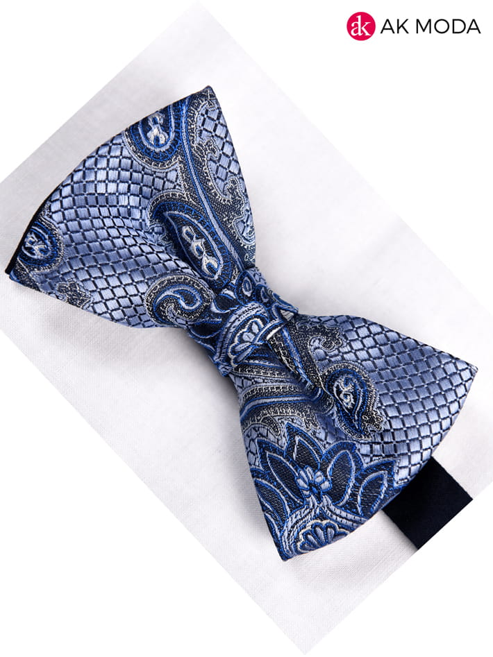 Modna i elegancka mucha w granatowo - niebieskie wzory. Wykonana z dobrej jakości tkaniny.