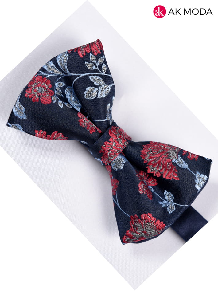 Modna i elegancka granatowa mucha w czerwone kwiaty. Wykonana z dobrej jakości tkaniny. Poszetka w kolorze niebieskim.