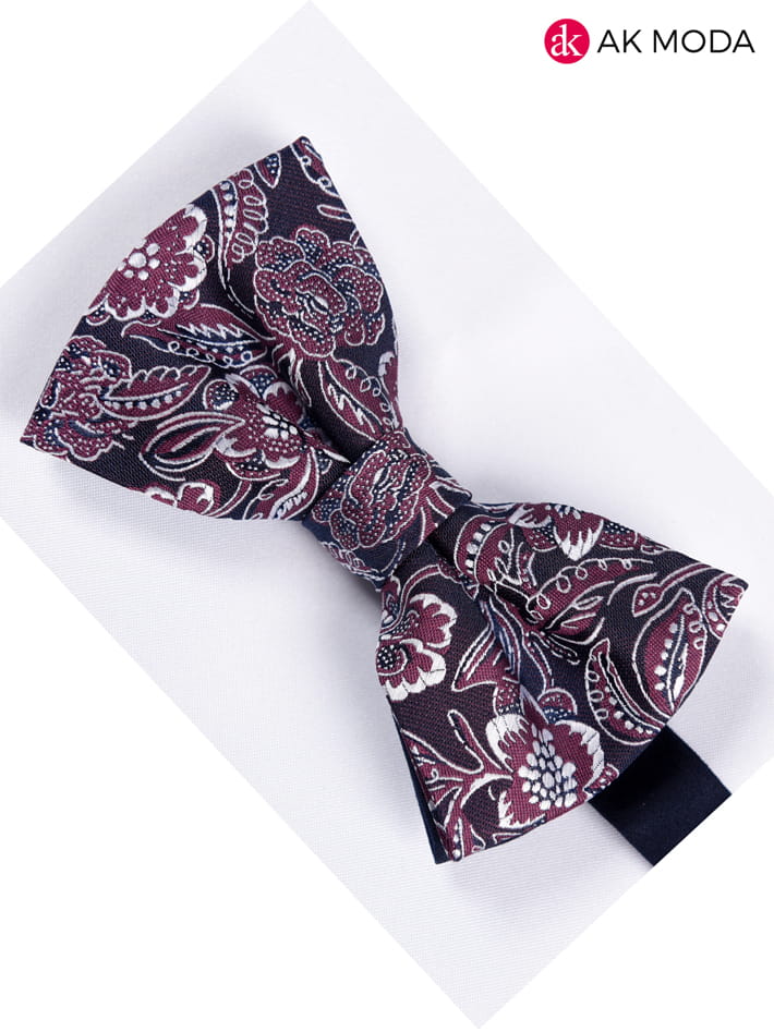 Modna i elegancka granatowa mucha w brązowe kwiaty. Wykonana z dobrej jakości tkaniny. Poszetka w kolorze muszki.