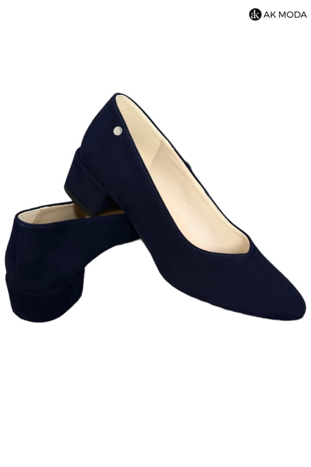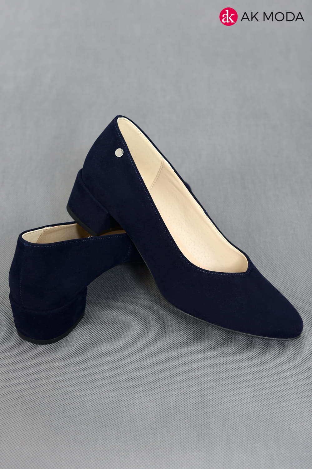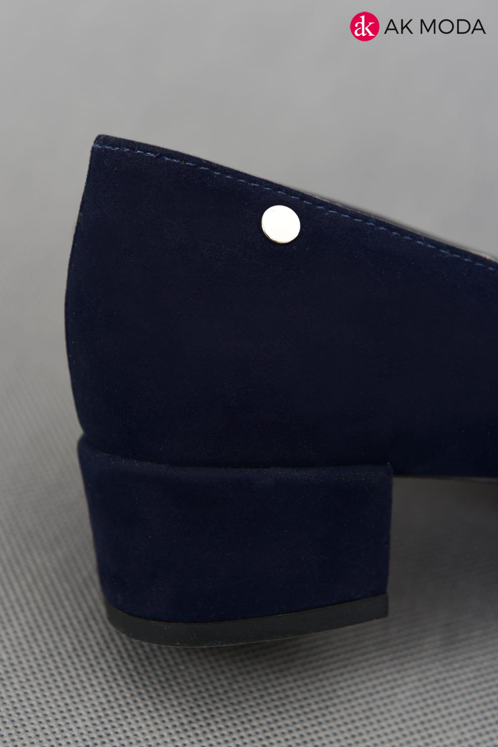 Obuwie damskie zamszowe w granatowym kolorze, na niskim obcasie.