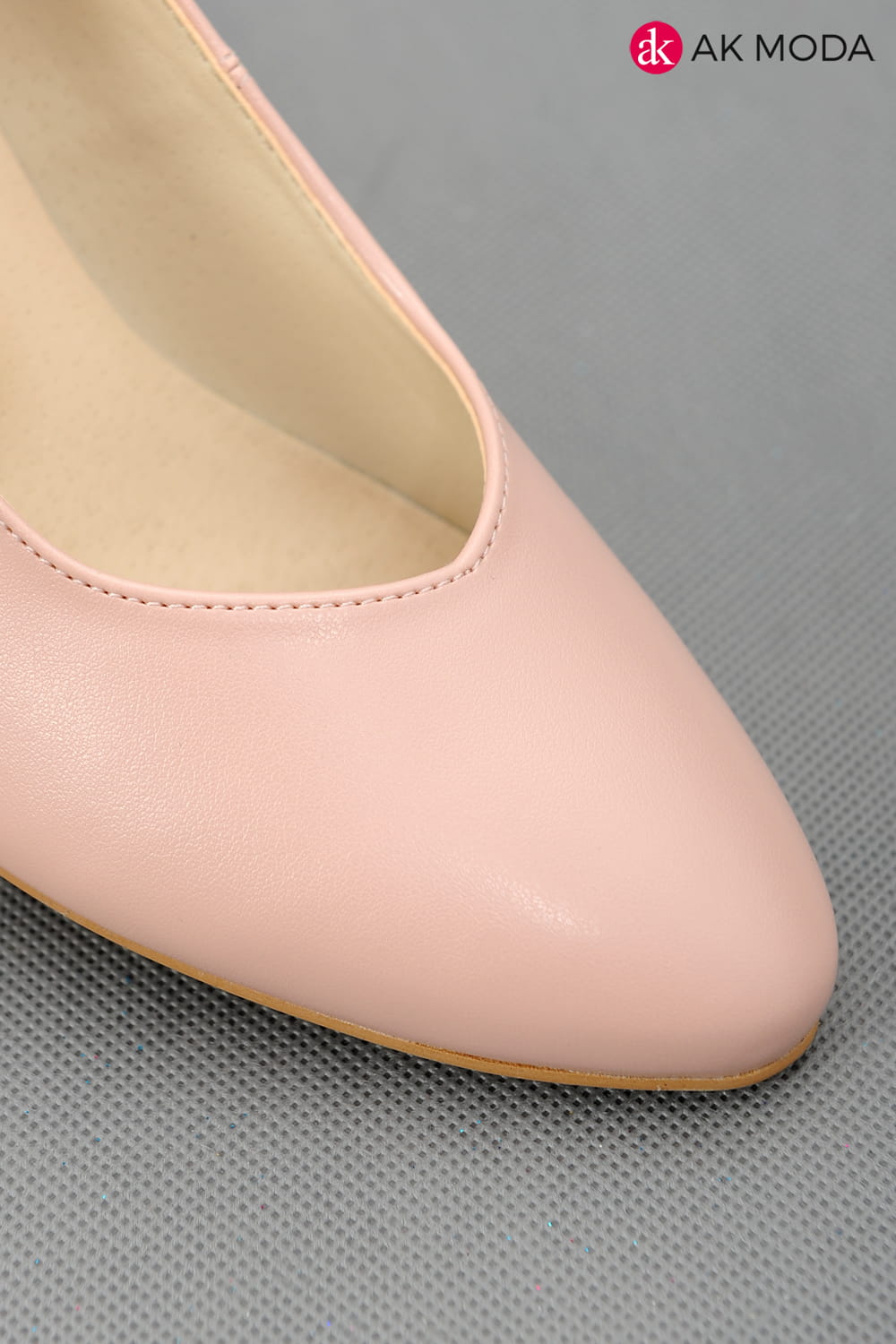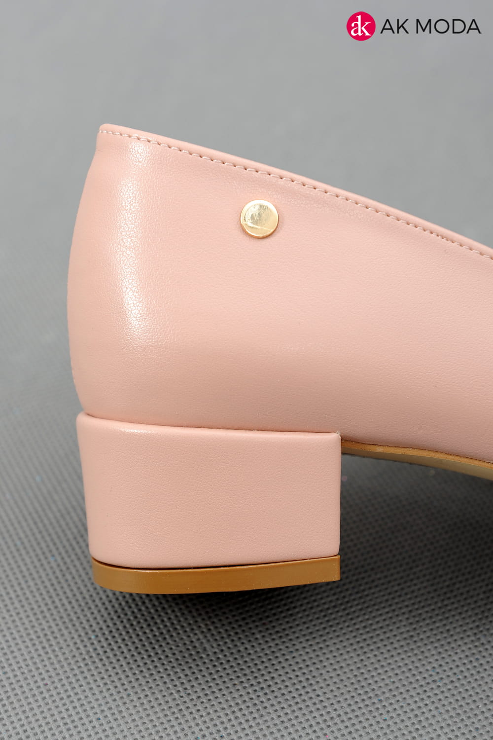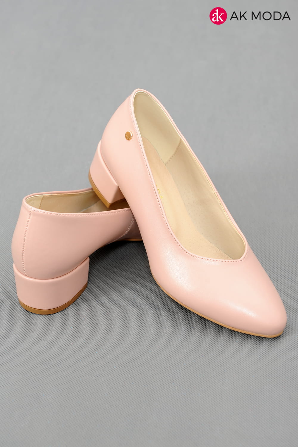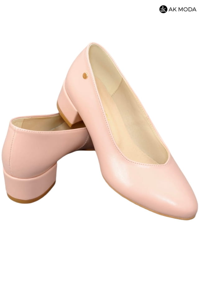 Obuwie damskie w kolorze jasnoróżowym, na niskim obcasie.