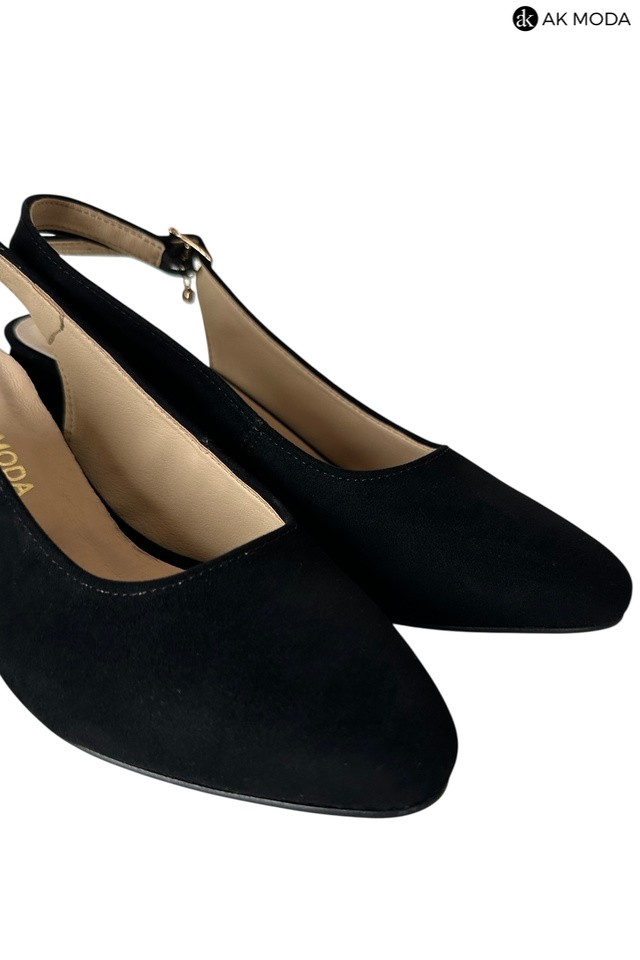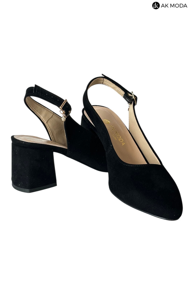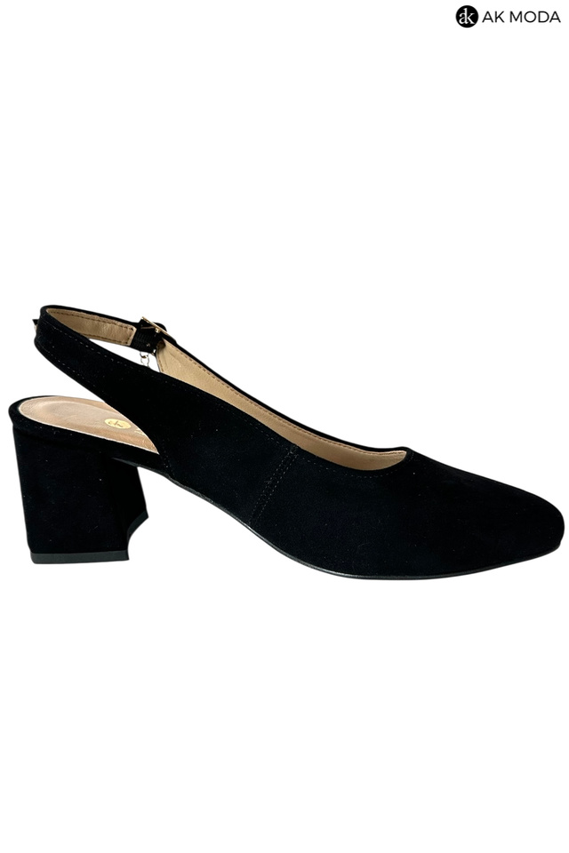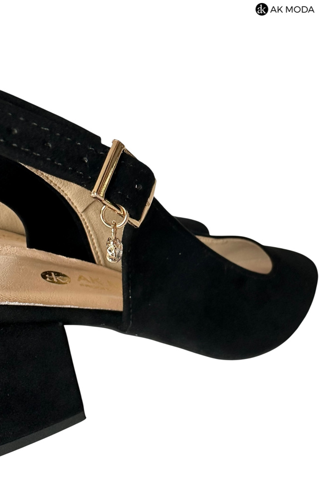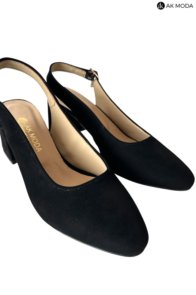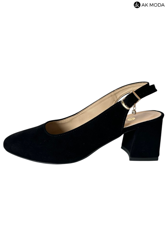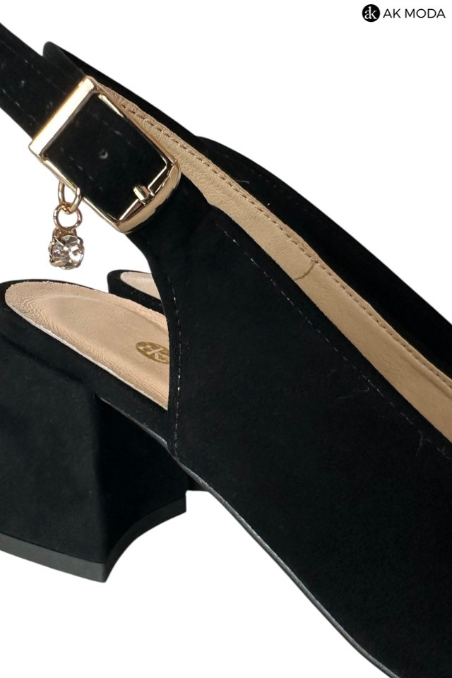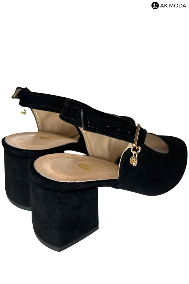 Czarne zamszowe obuwie damskie na słupku, z odkrytą piętą.
